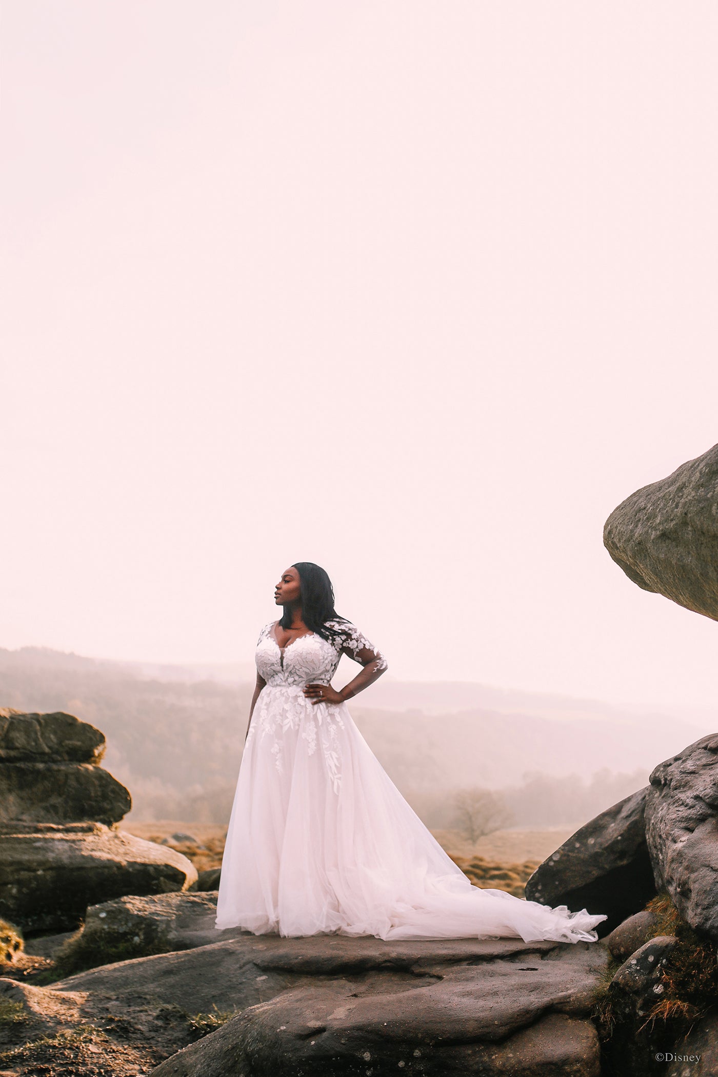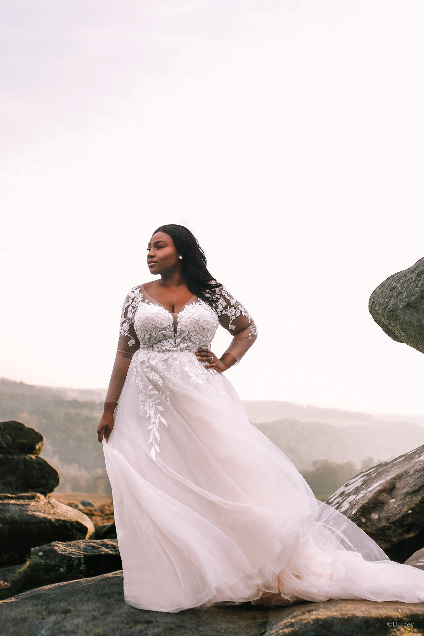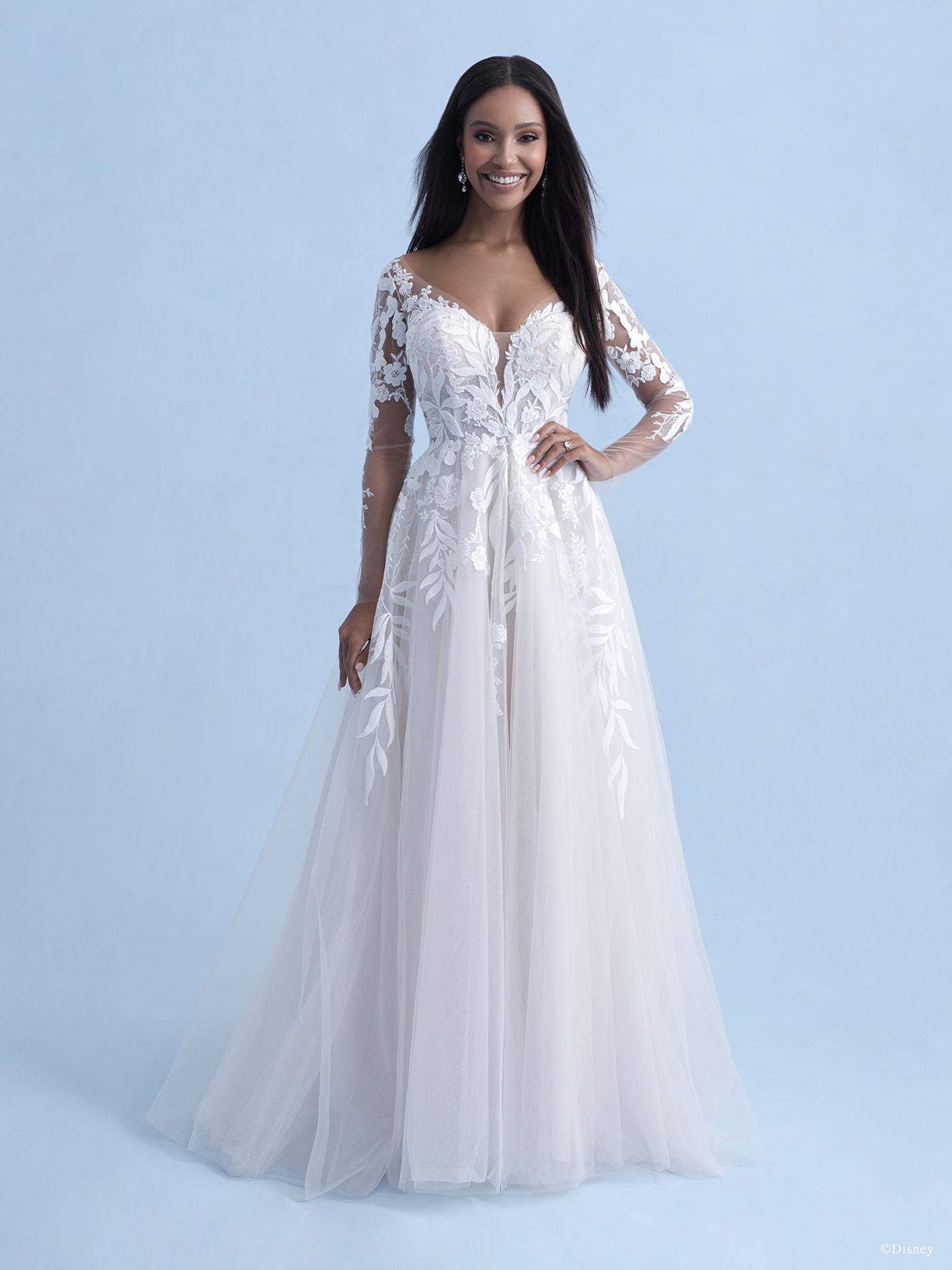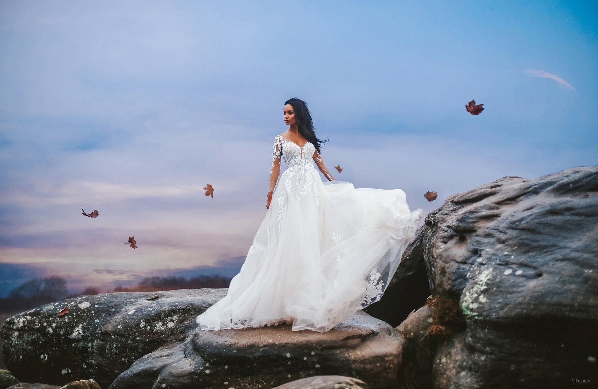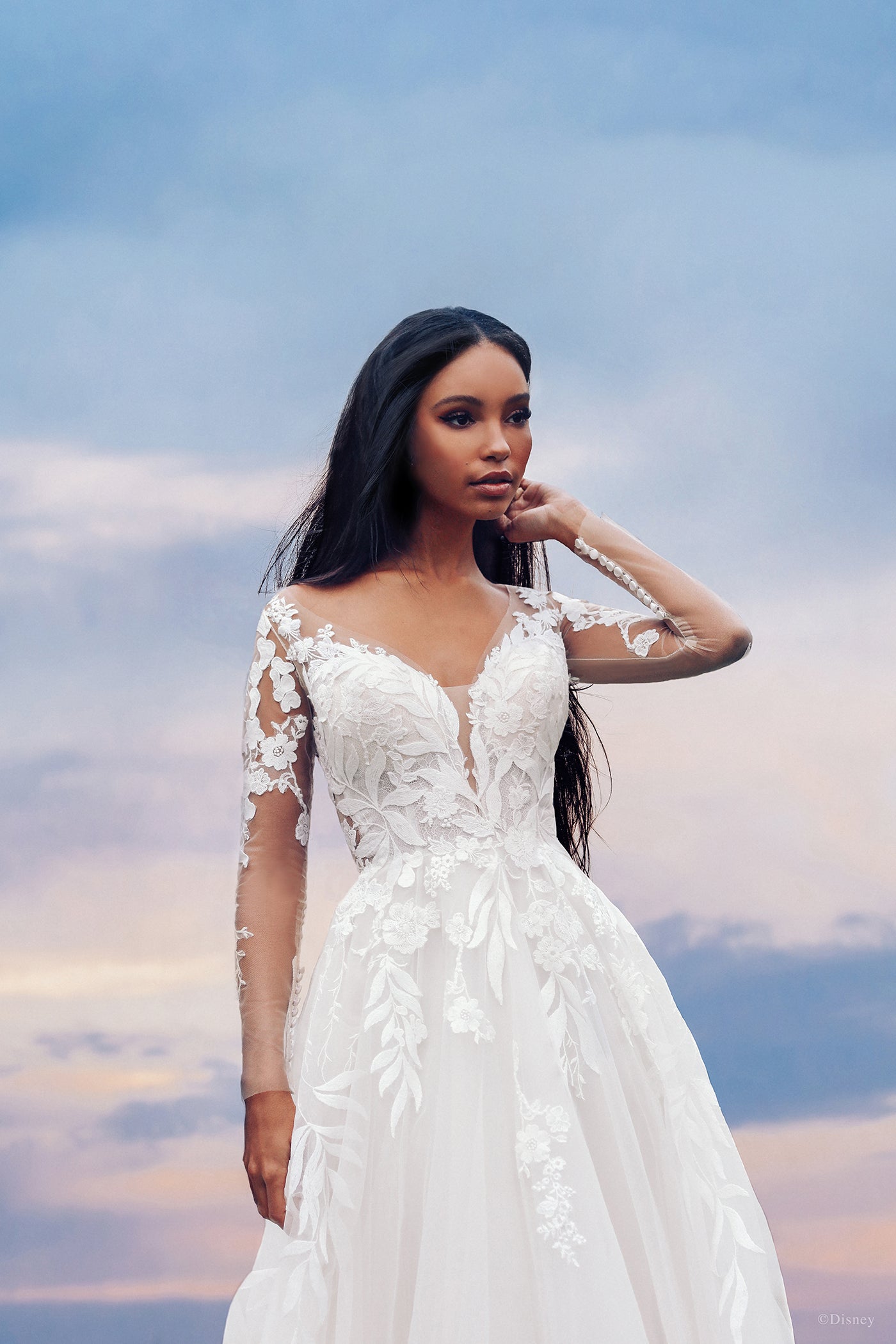 Inspired by her love of nature, the Pocahontas gown pays tribute to the 'Colors of the Wind' featuring delicately strewn patterned leaf appliques along the bodice and outlining the sheer illusion back and sleeves.