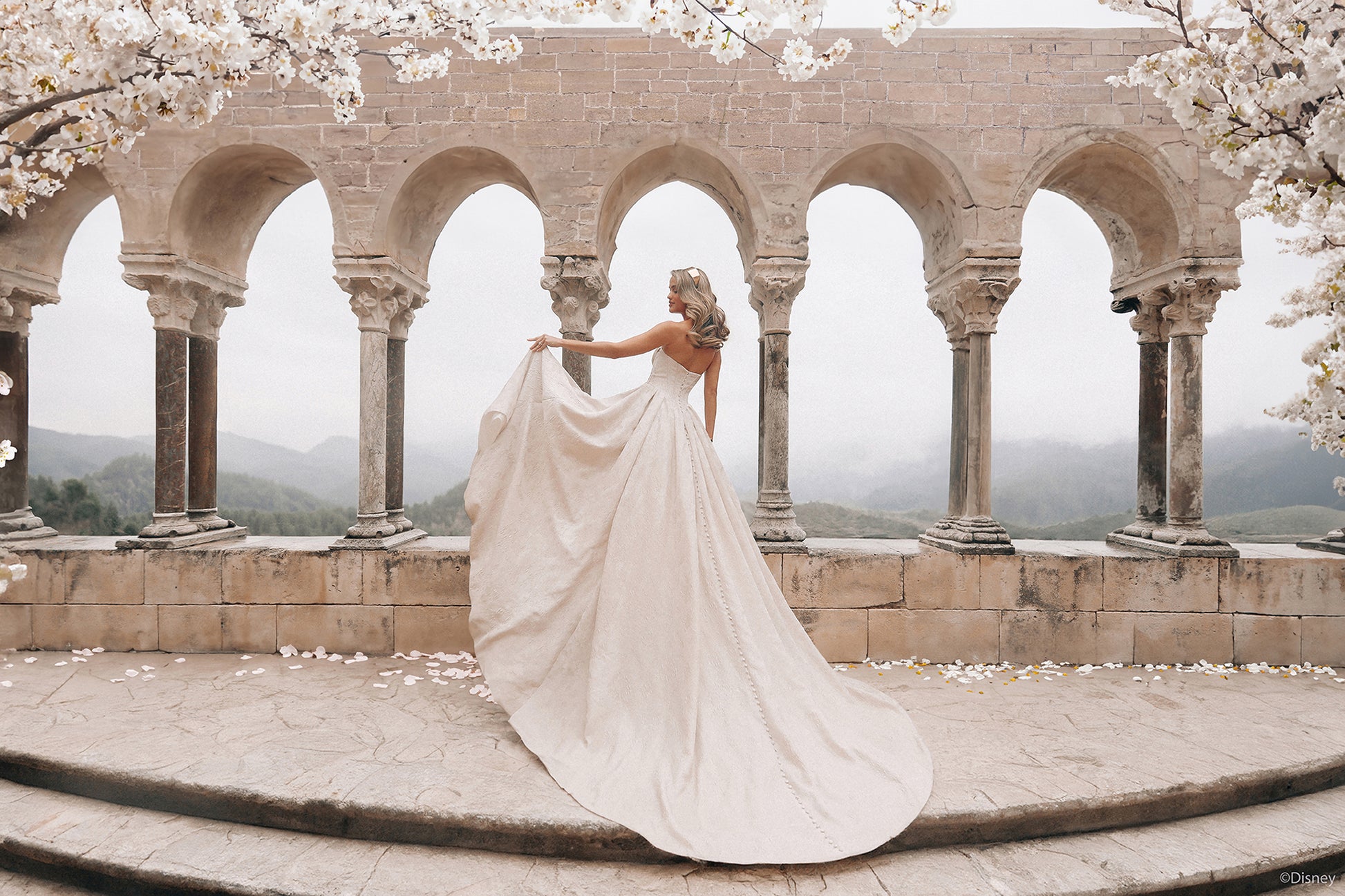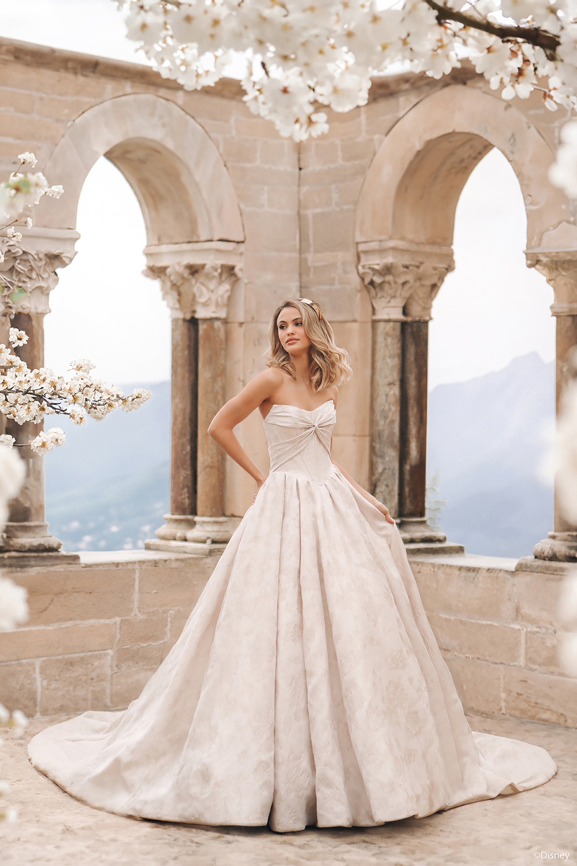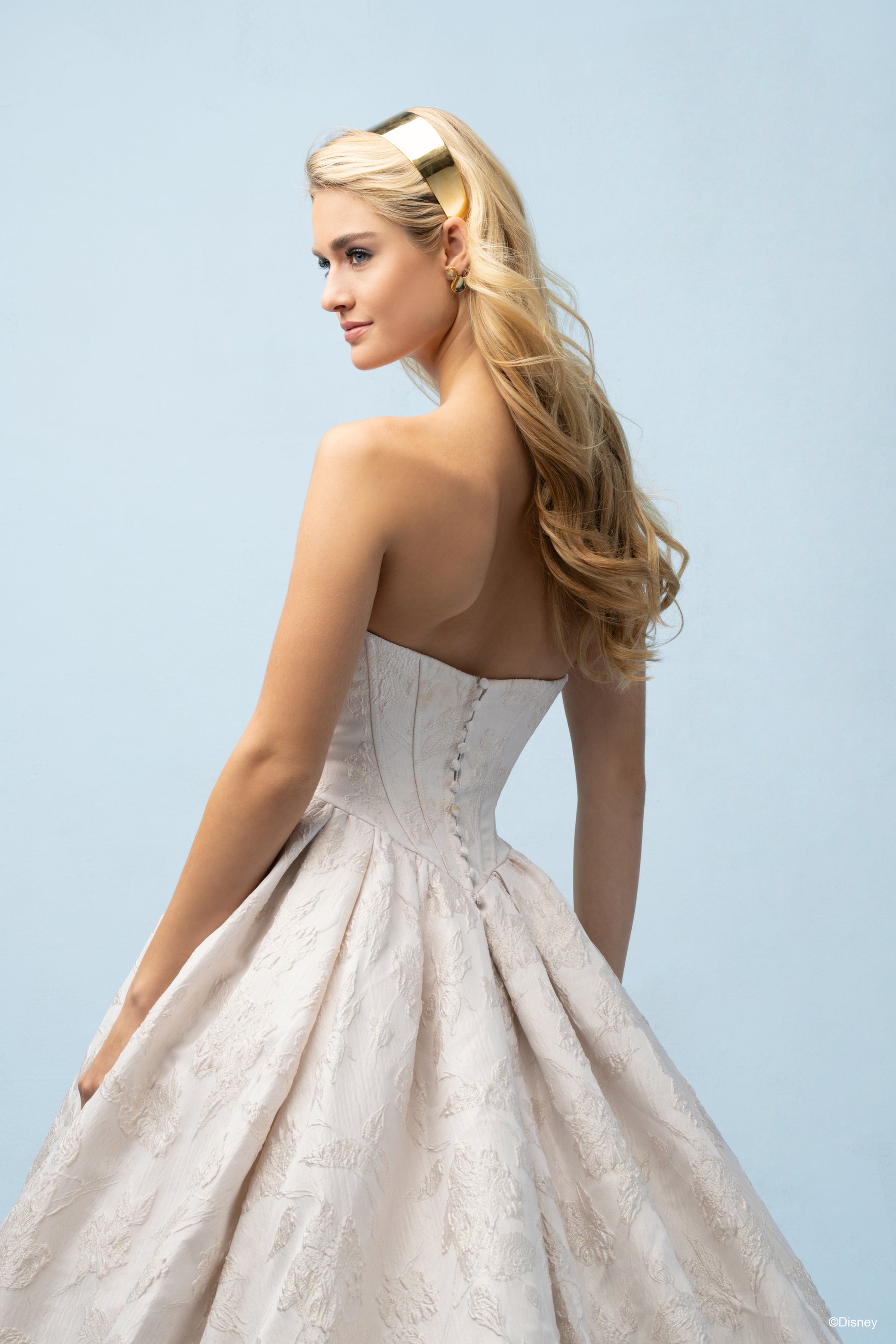 For the bride dreaming of a true fairytale moment, this Aurora-inspired ballgown brings the story of Sleeping Beauty to life in enchanting detail. The gown’s jacquard fabric and striking cateye neckline is balanced by the corset-style and gathered center twist of the bodice. The iconic basque waistline flatters and elongates, giving the bride an effortlessly graceful silhouette as she steps into her happily-ever-after. In a dreamy shade of dusty pink, this gown is a celebration of love that transcends time—a perfect choice for a bride ready to make her own fairytale come true. Read Less