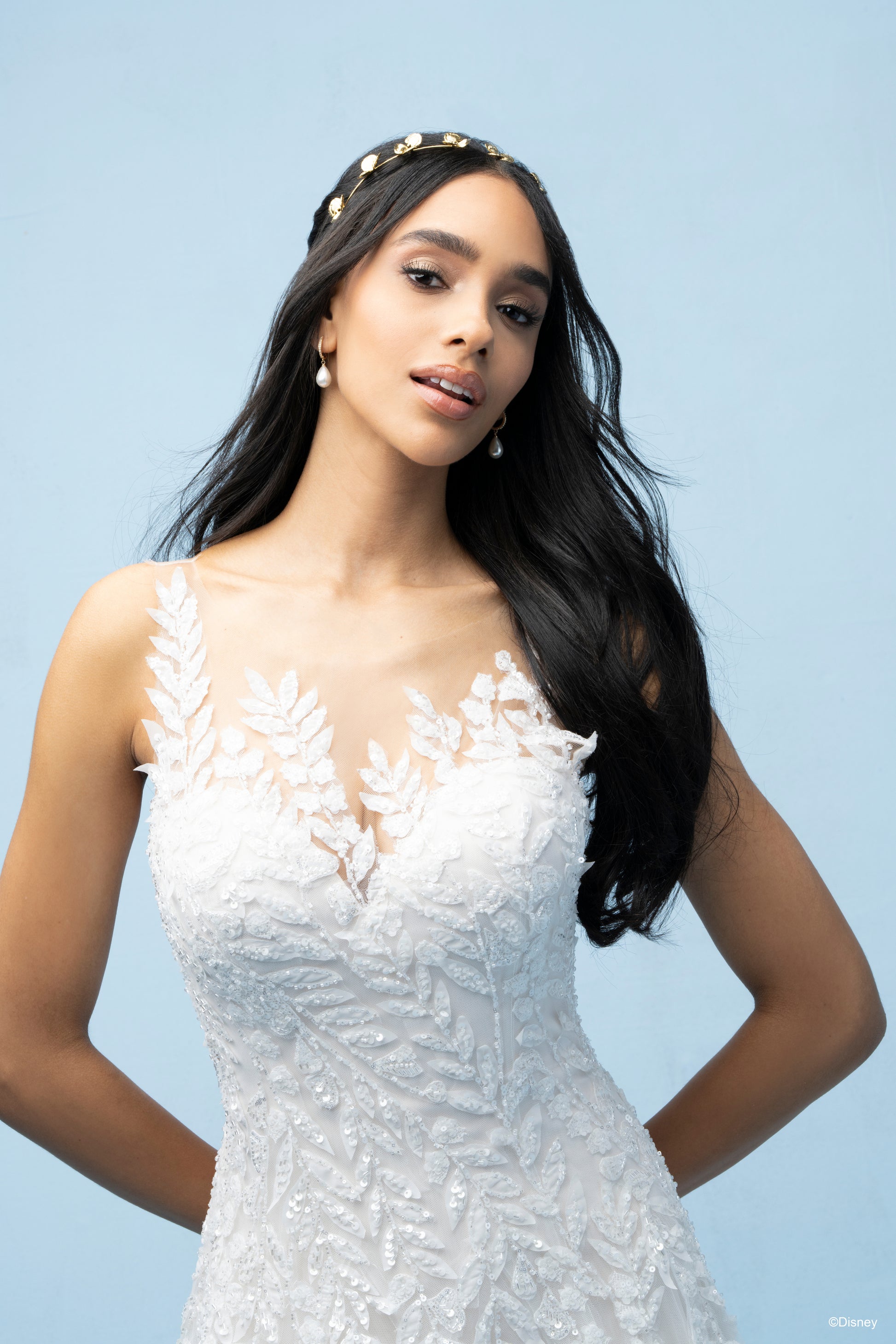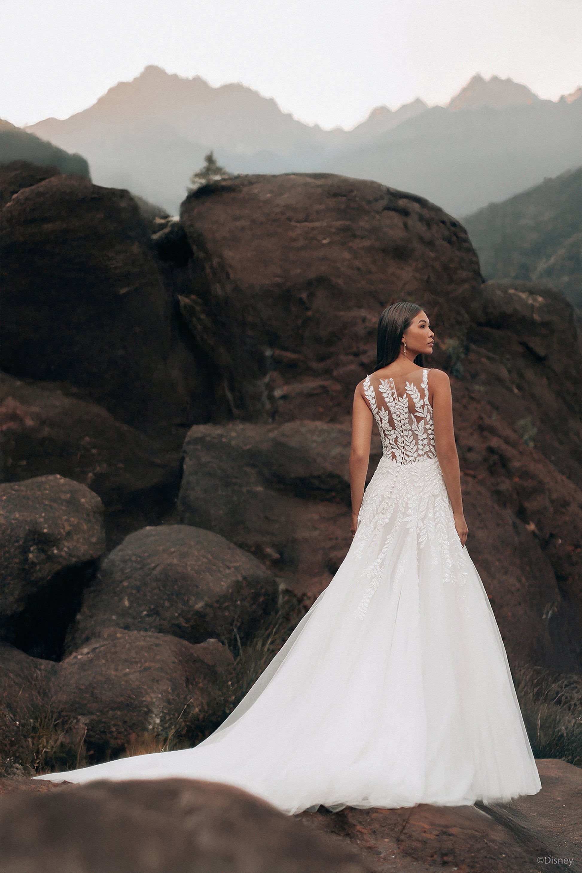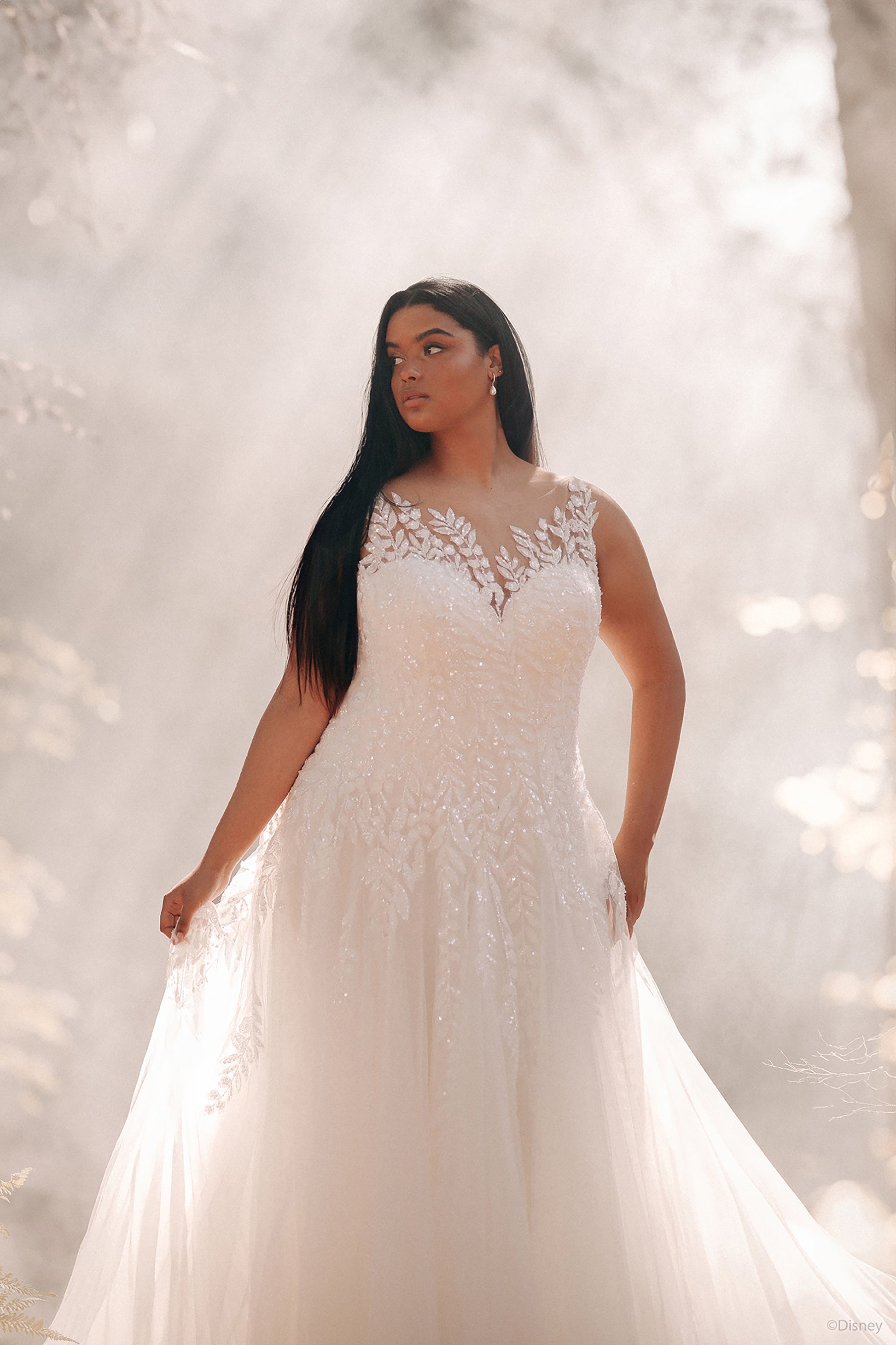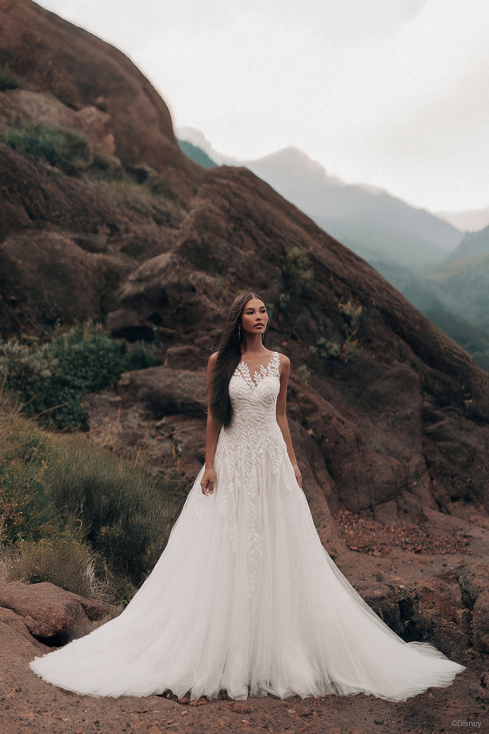 Inspired by Pocahontas’s free spirit and connection to nature, this enchanting A-line gown embodies elegance and natural beauty. The illusion sweetheart neckline adds a touch of romance, while the sleeveless design and natural waistline create a flattering, effortless silhouette. Adorned with intricate beading and sequin appliqués, this gown sparkles subtly, reflecting the beauty of Pocahontas’s journey and the harmony she finds in the world around her. Ideal for a bride who seeks adventure, love, and serenity, this gown embodies strength and grace. Read Less