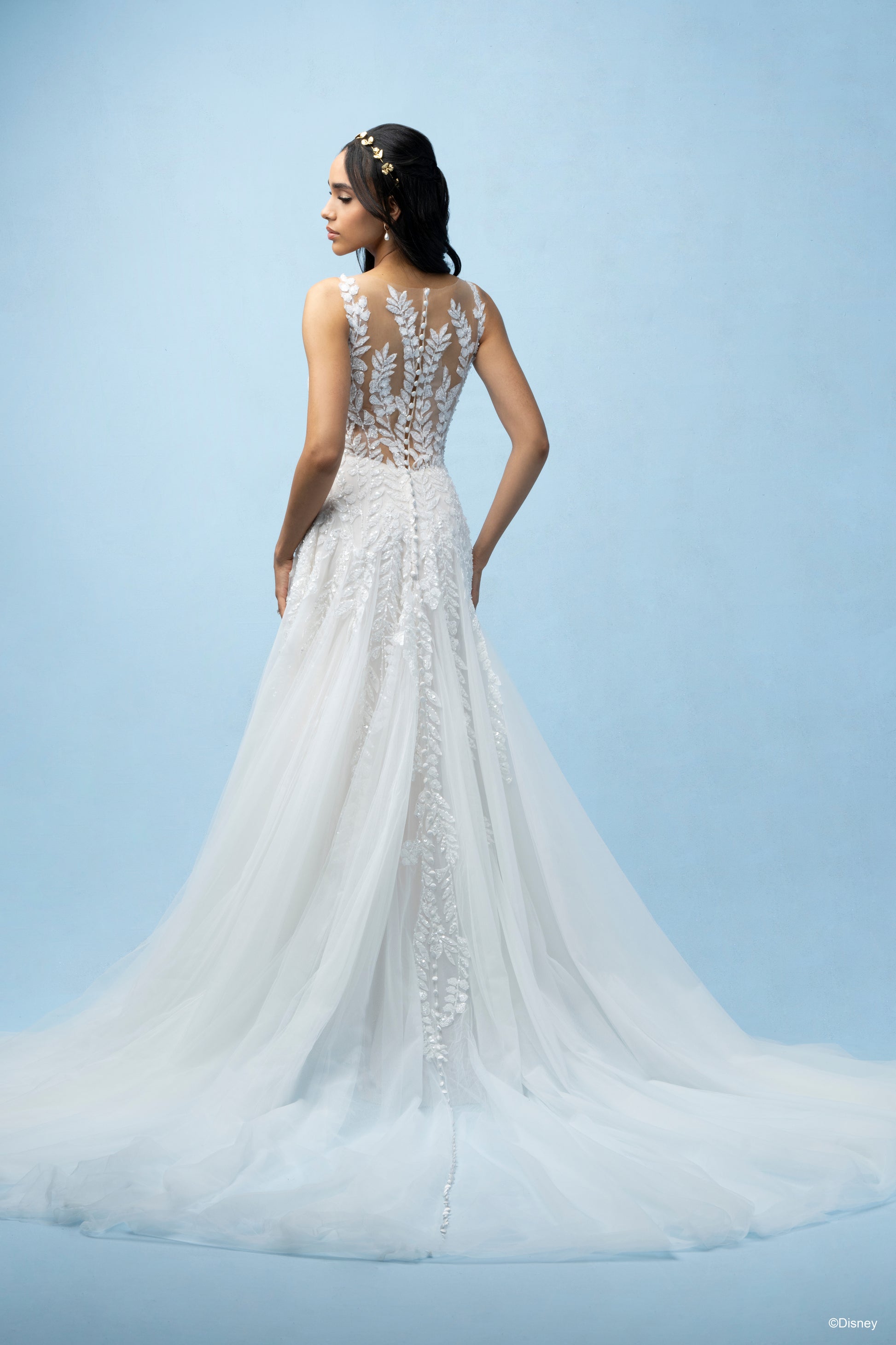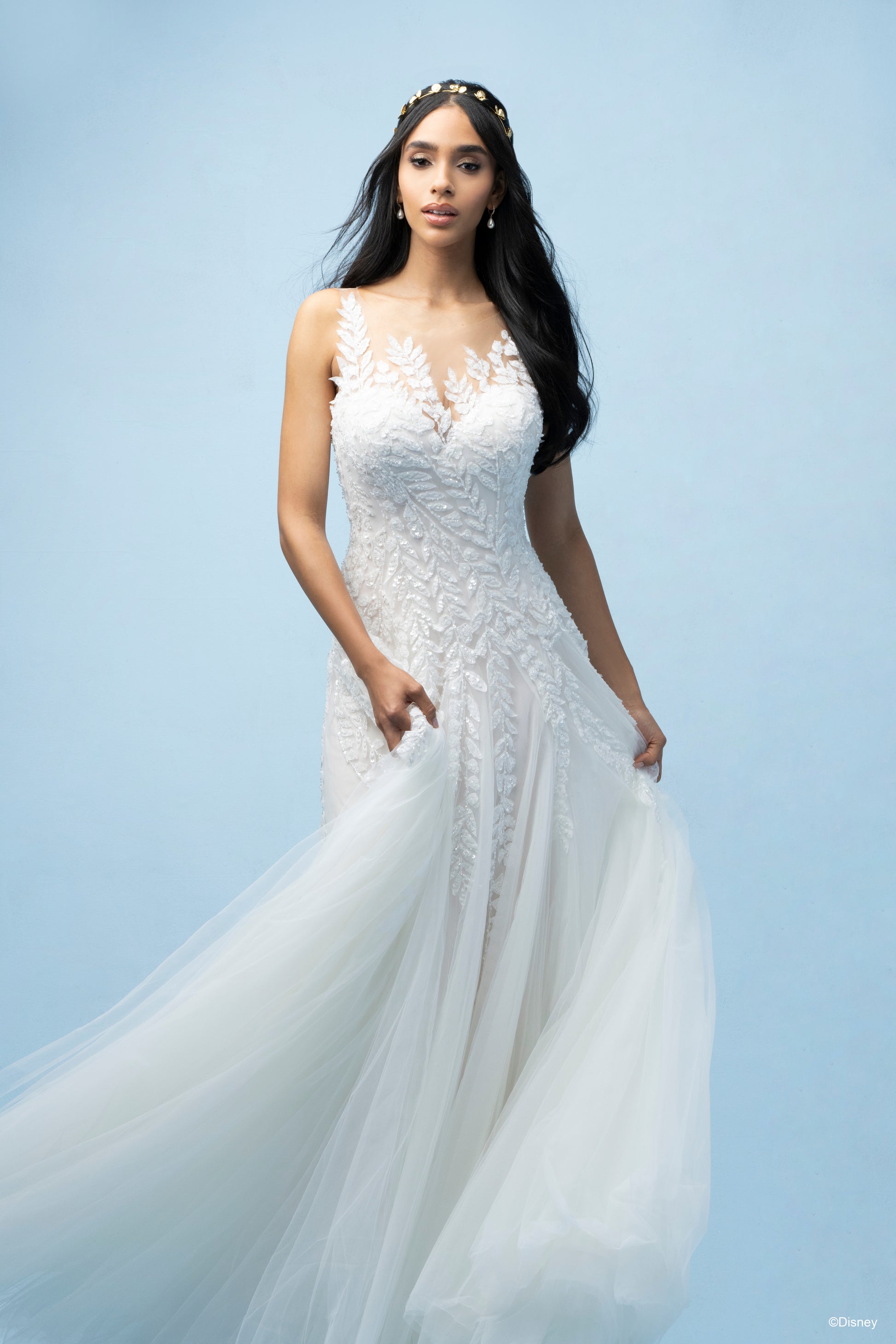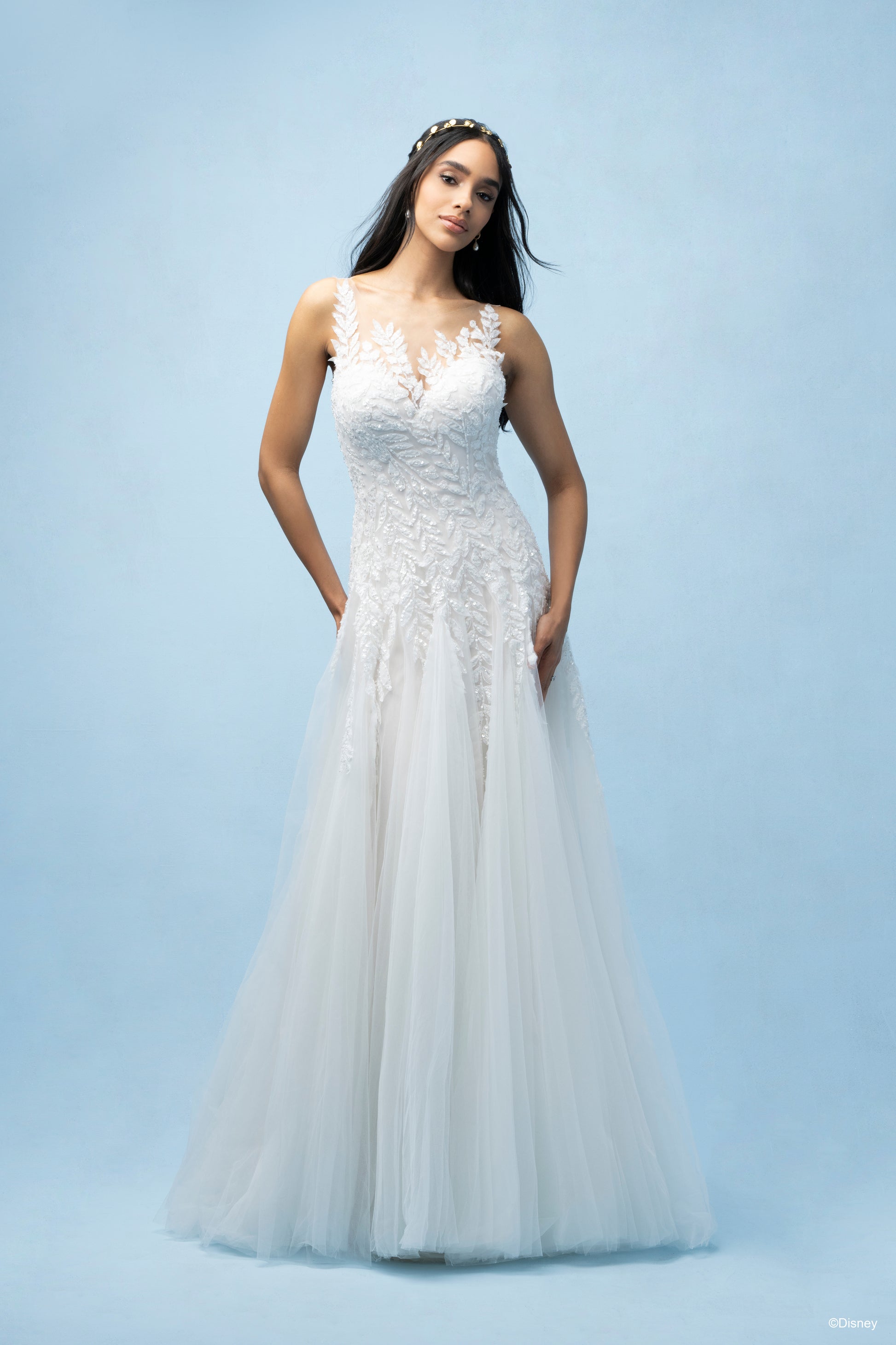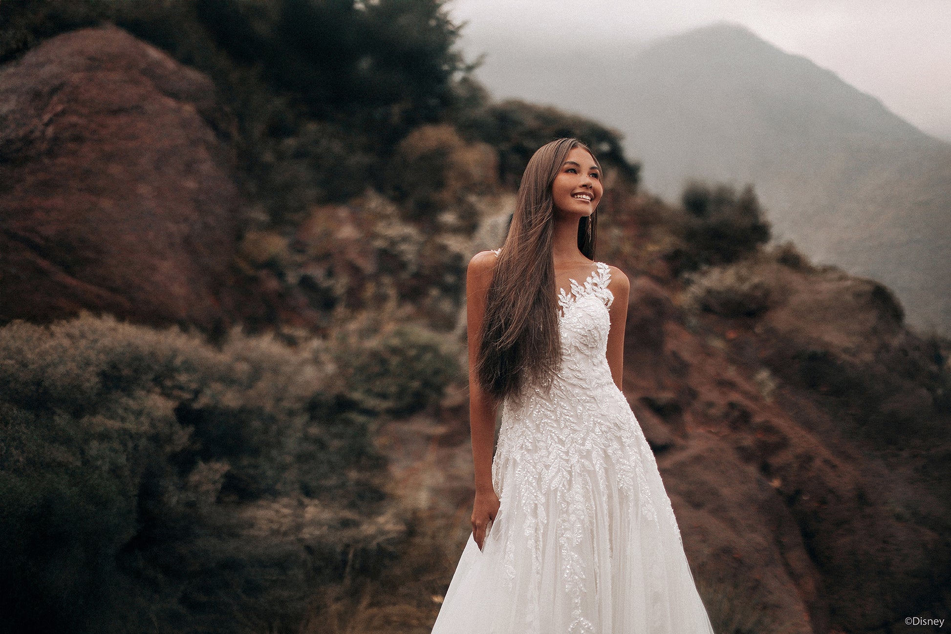 Inspired by Pocahontas’s free spirit and connection to nature, this enchanting A-line gown embodies elegance and natural beauty. The illusion sweetheart neckline adds a touch of romance, while the sleeveless design and natural waistline create a flattering, effortless silhouette. Adorned with intricate beading and sequin appliqués, this gown sparkles subtly, reflecting the beauty of Pocahontas’s journey and the harmony she finds in the world around her. Ideal for a bride who seeks adventure, love, and serenity, this gown embodies strength and grace. Read Less