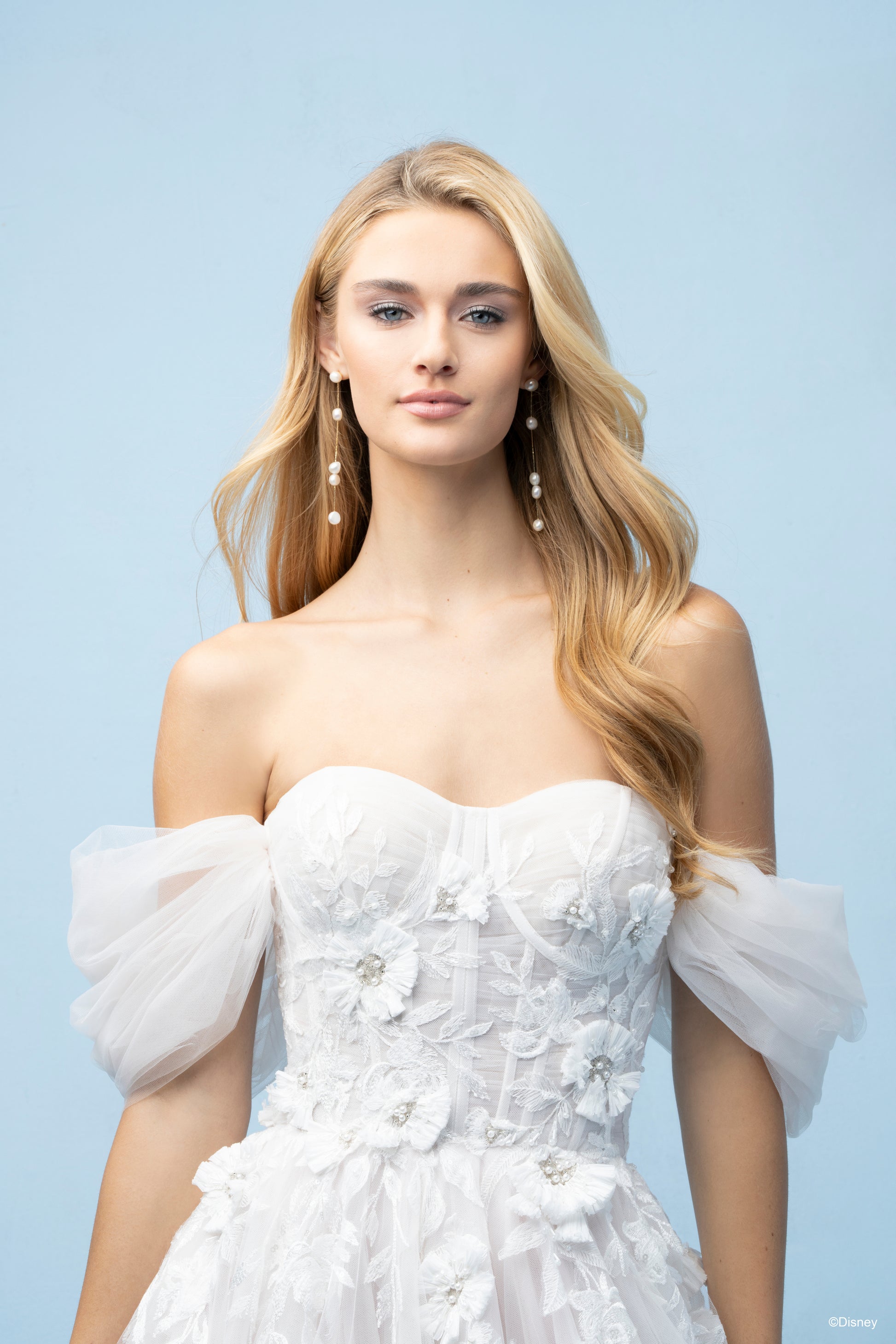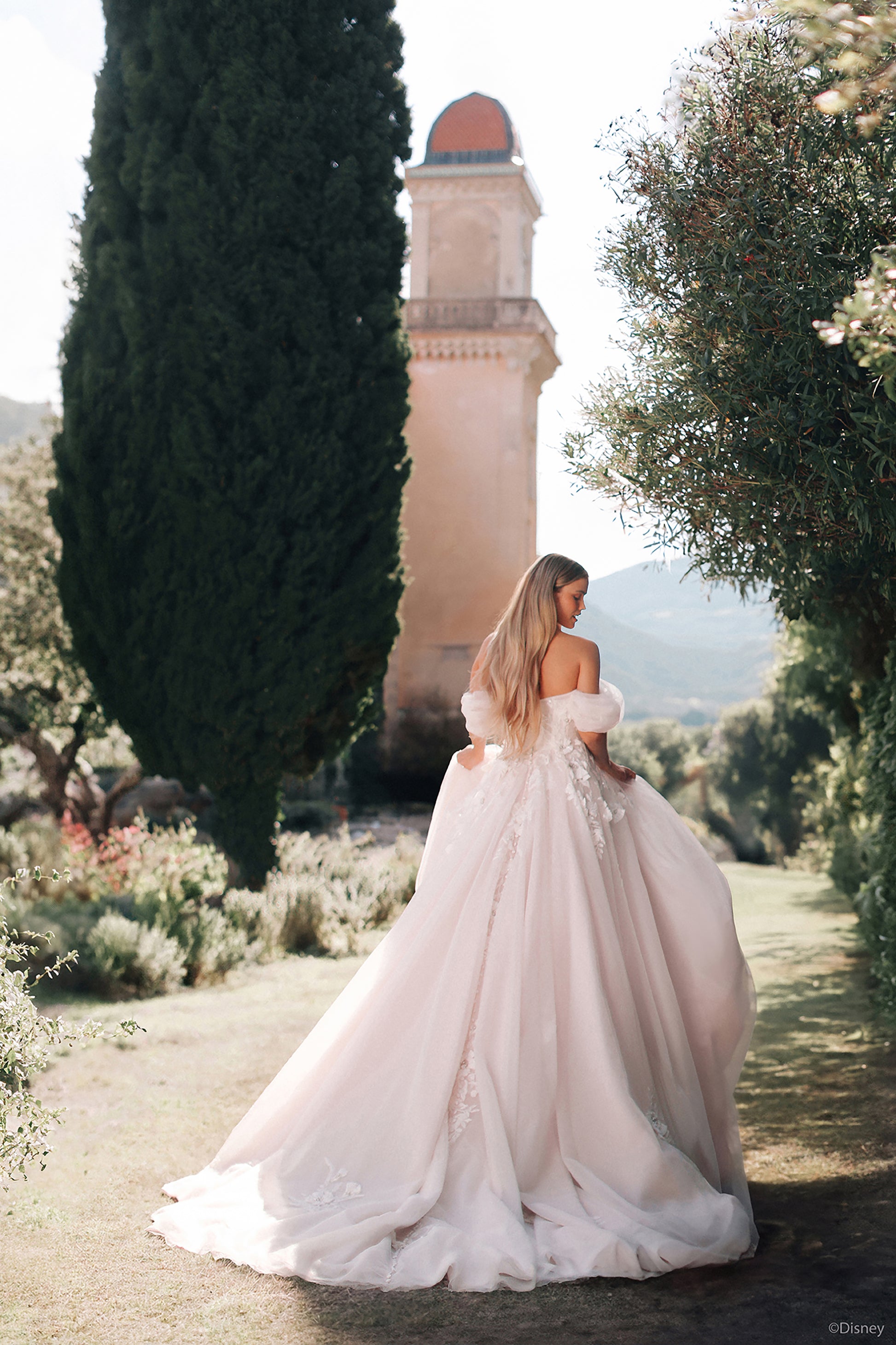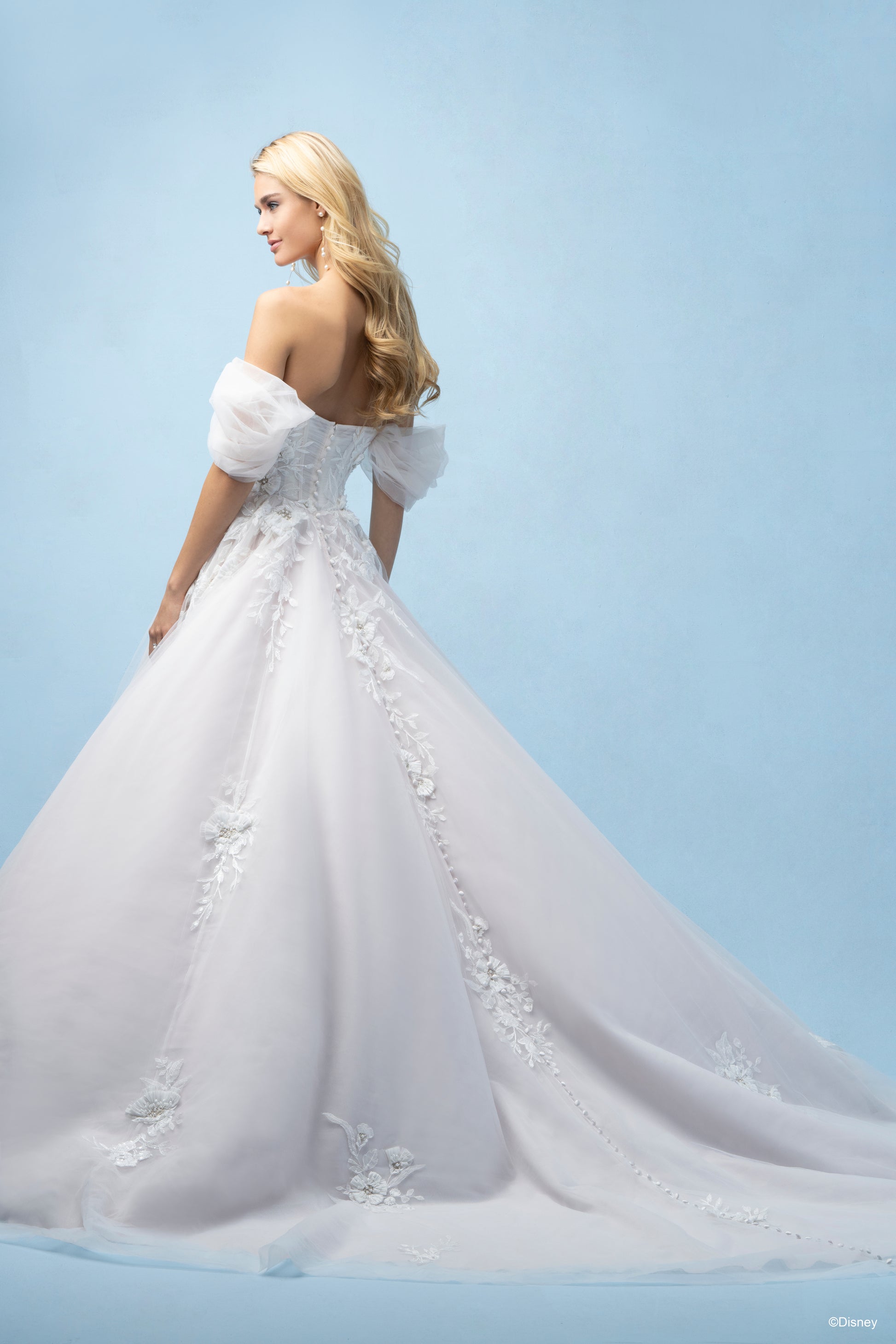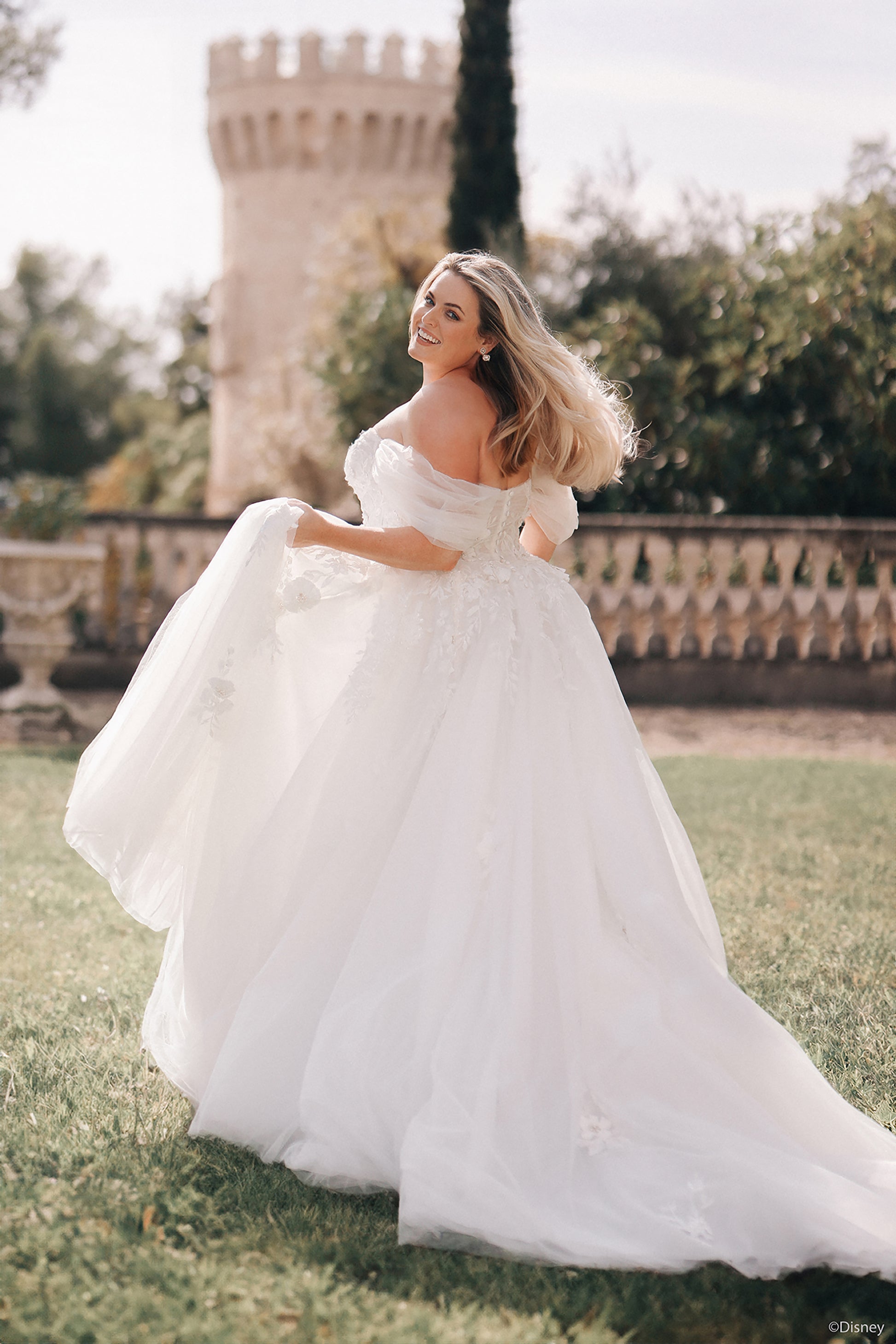Inspired by Rapunzel’s adventurous heart and whimsical charm, this breathtaking A-line gown captures the magic of her story. Featuring a modified sweetheart neckline, this dress offers a romantic yet refined silhouette, with detachable off-shoulder sleeves that reveal a strapless look for added versatility. Crafted from layers of soft tulle adorned with dimensional floral lace and intricate beaded appliqués, the lace pattern reflects Rapunzel’s iconic flower, symbolizing her spirit and resilience. Read Less
