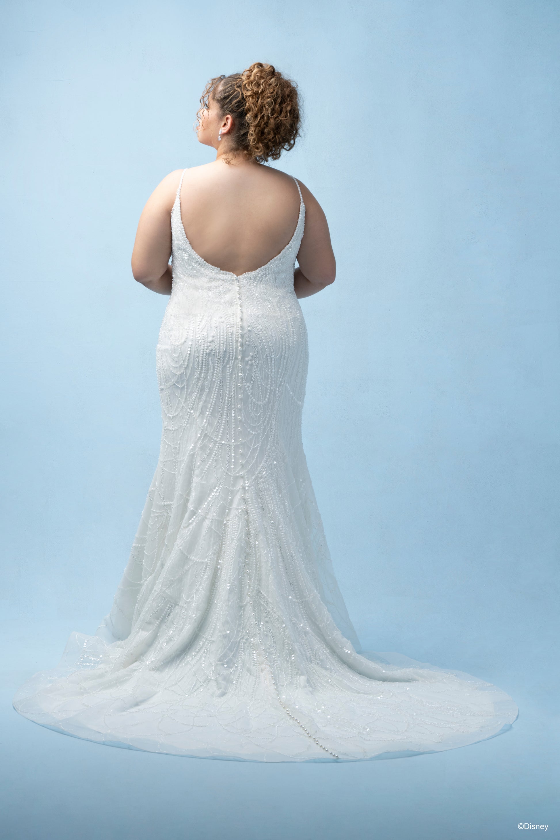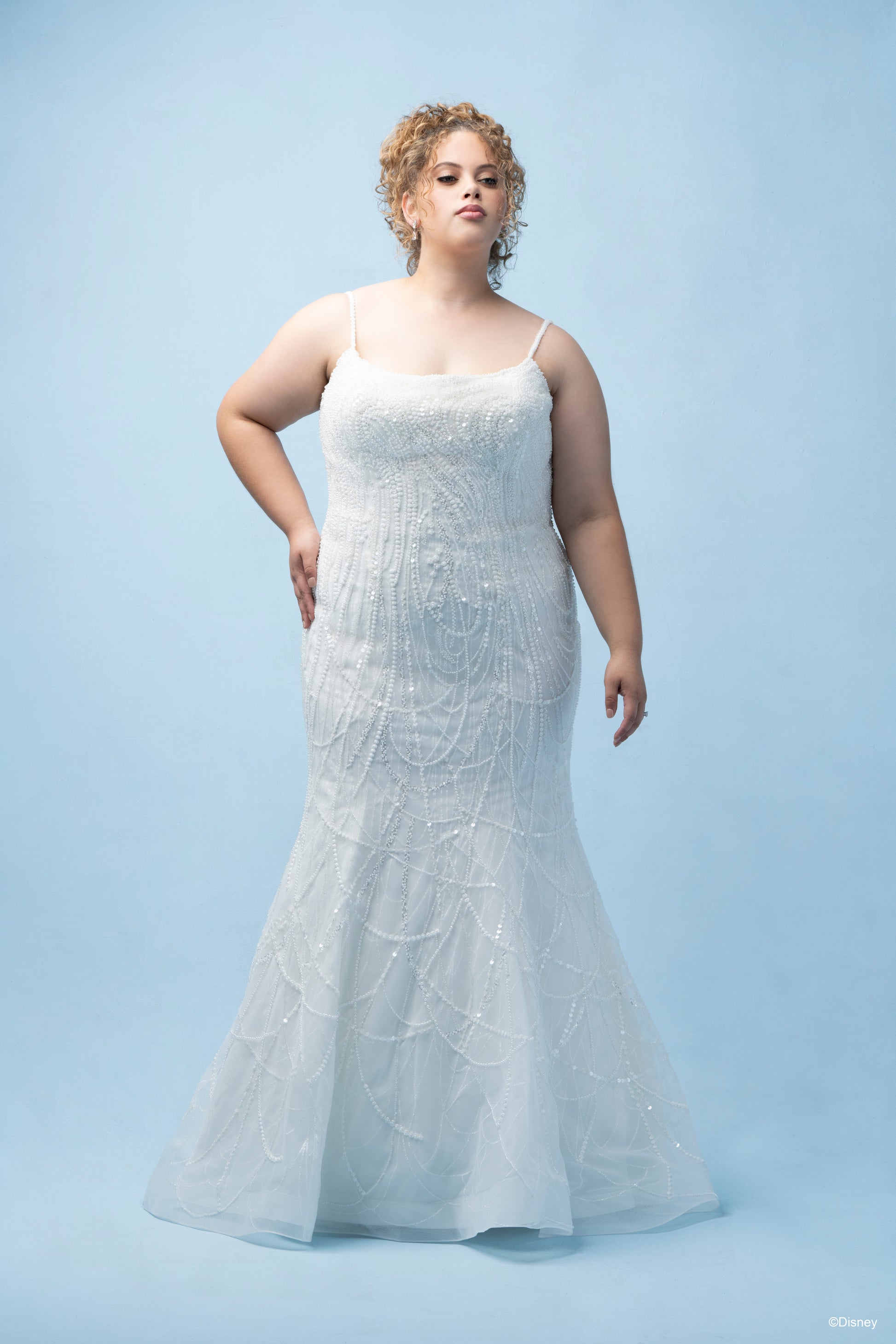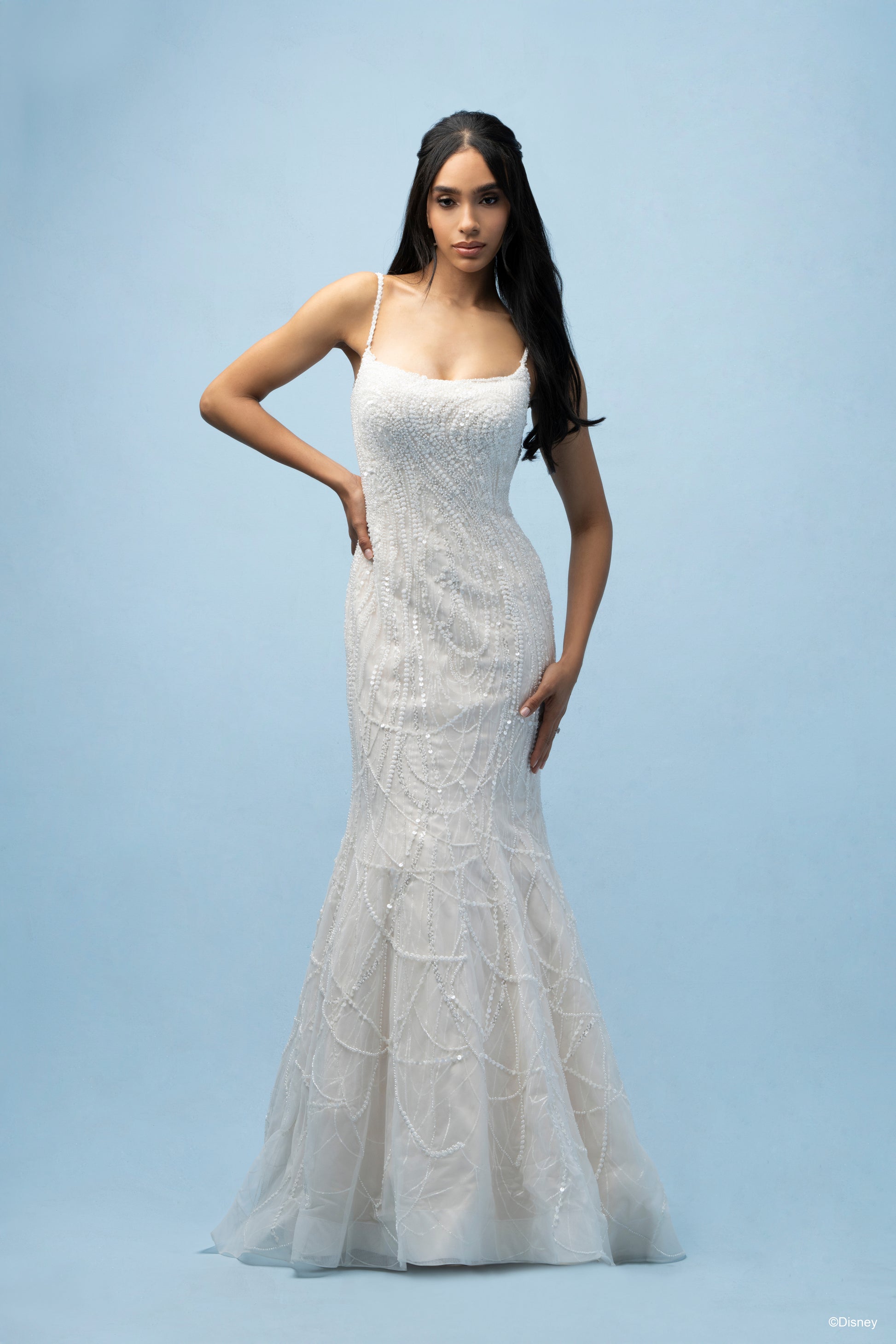 Inspired by Tiana’s grace and ambition, this fit-and-flare gown brings her story of resilience and love to life. With a chic scoop neckline and delicate spaghetti straps, this gown flatters with its natural waistline, creating a silhouette as timeless as Tiana herself. Crafted in a refined champagne tone, the dress sparkles with tonal beading and sequin details over layers of soft tulle, adding a subtle shimmer that reflects her elegance and the vibrant spirit of New Orleans. Perfect for the bride who dreams big and believes in her own strength, this gown honors Tiana’s journey to true love and success. Read Less