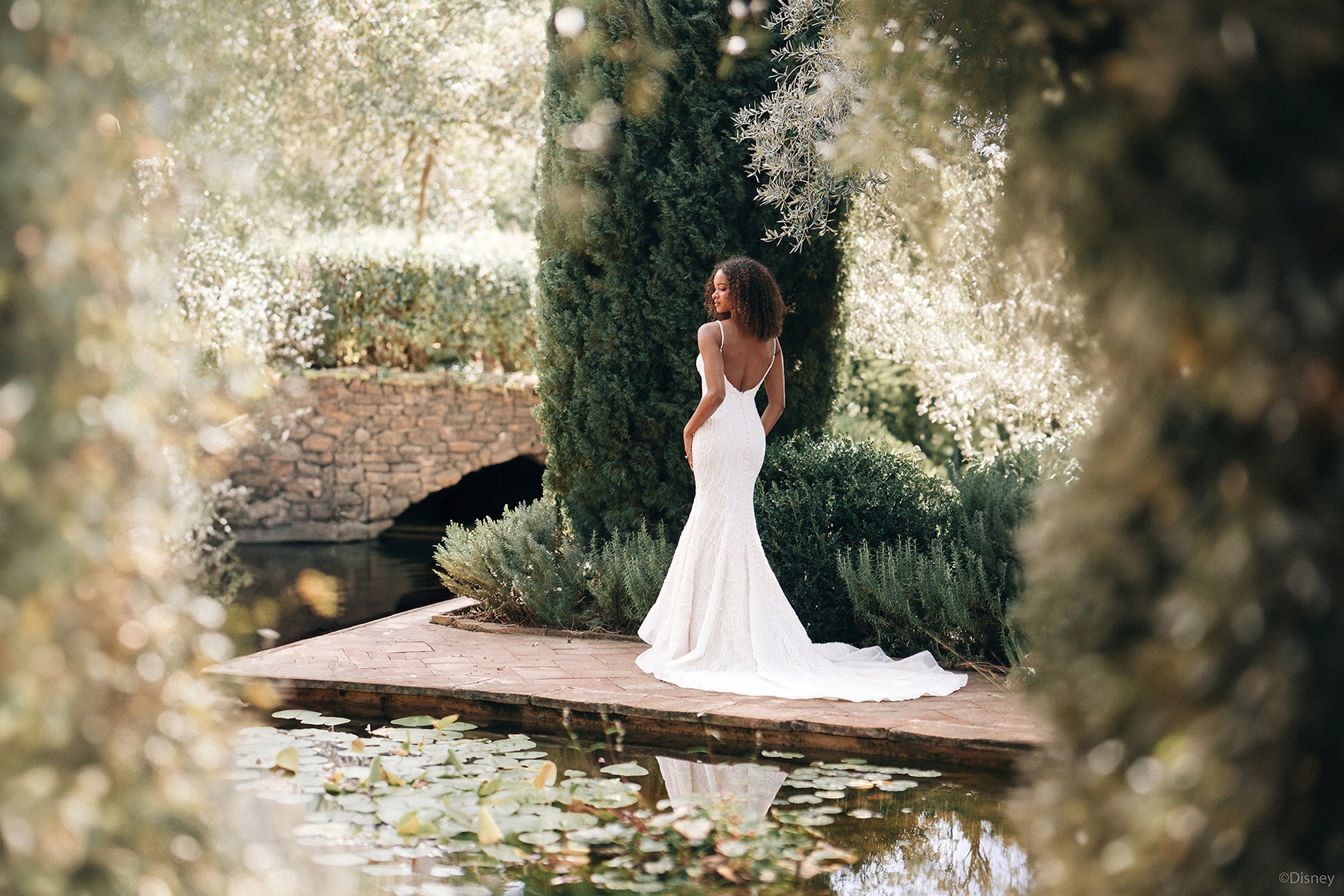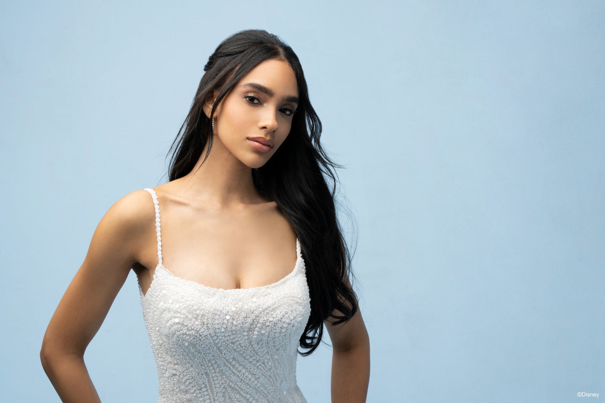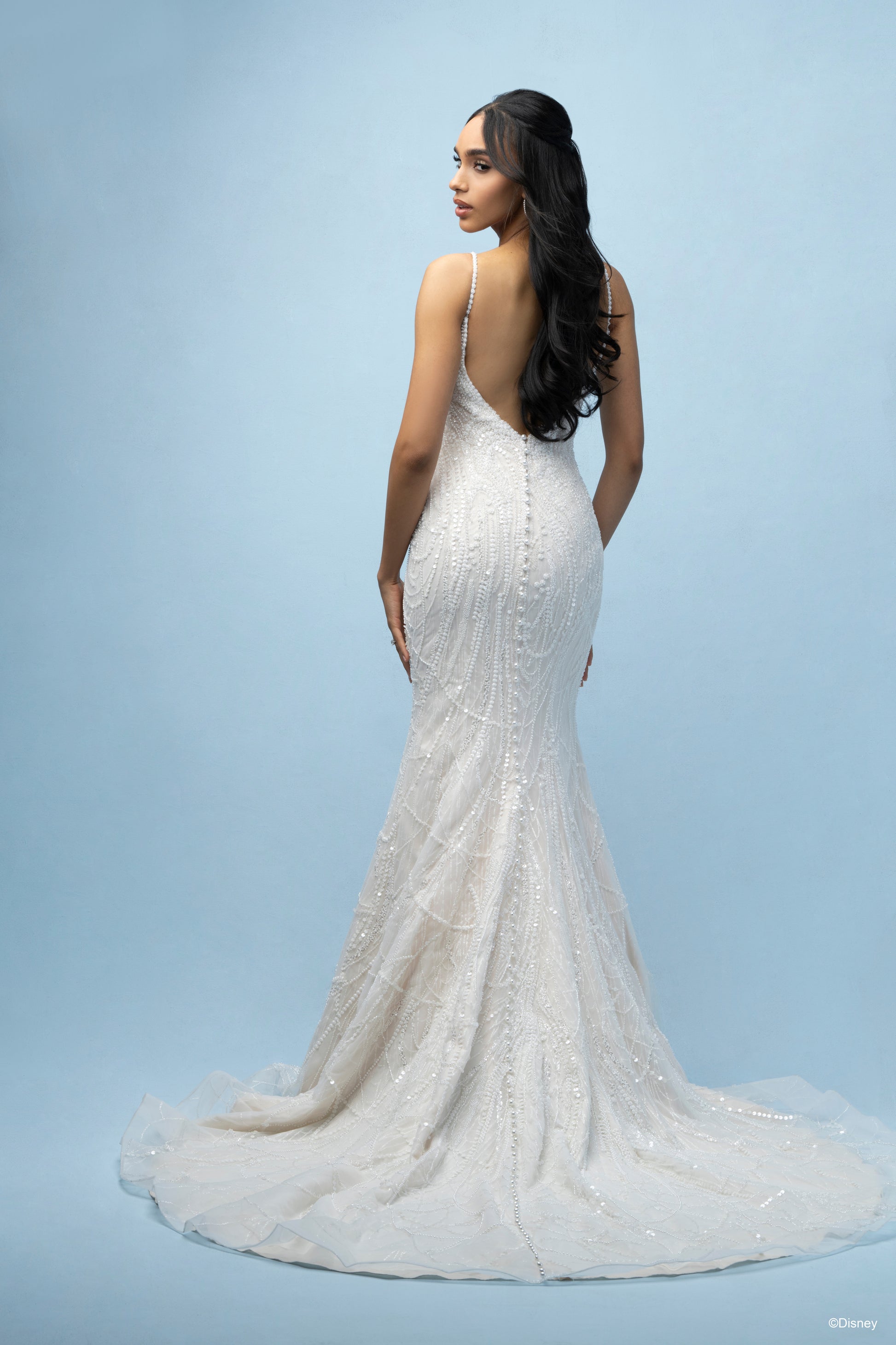 Inspired by Tiana’s grace and ambition, this fit-and-flare gown brings her story of resilience and love to life. With a chic scoop neckline and delicate spaghetti straps, this gown flatters with its natural waistline, creating a silhouette as timeless as Tiana herself. Crafted in a refined champagne tone, the dress sparkles with tonal beading and sequin details over layers of soft tulle, adding a subtle shimmer that reflects her elegance and the vibrant spirit of New Orleans. Perfect for the bride who dreams big and believes in her own strength, this gown honors Tiana’s journey to true love and success. Read Less