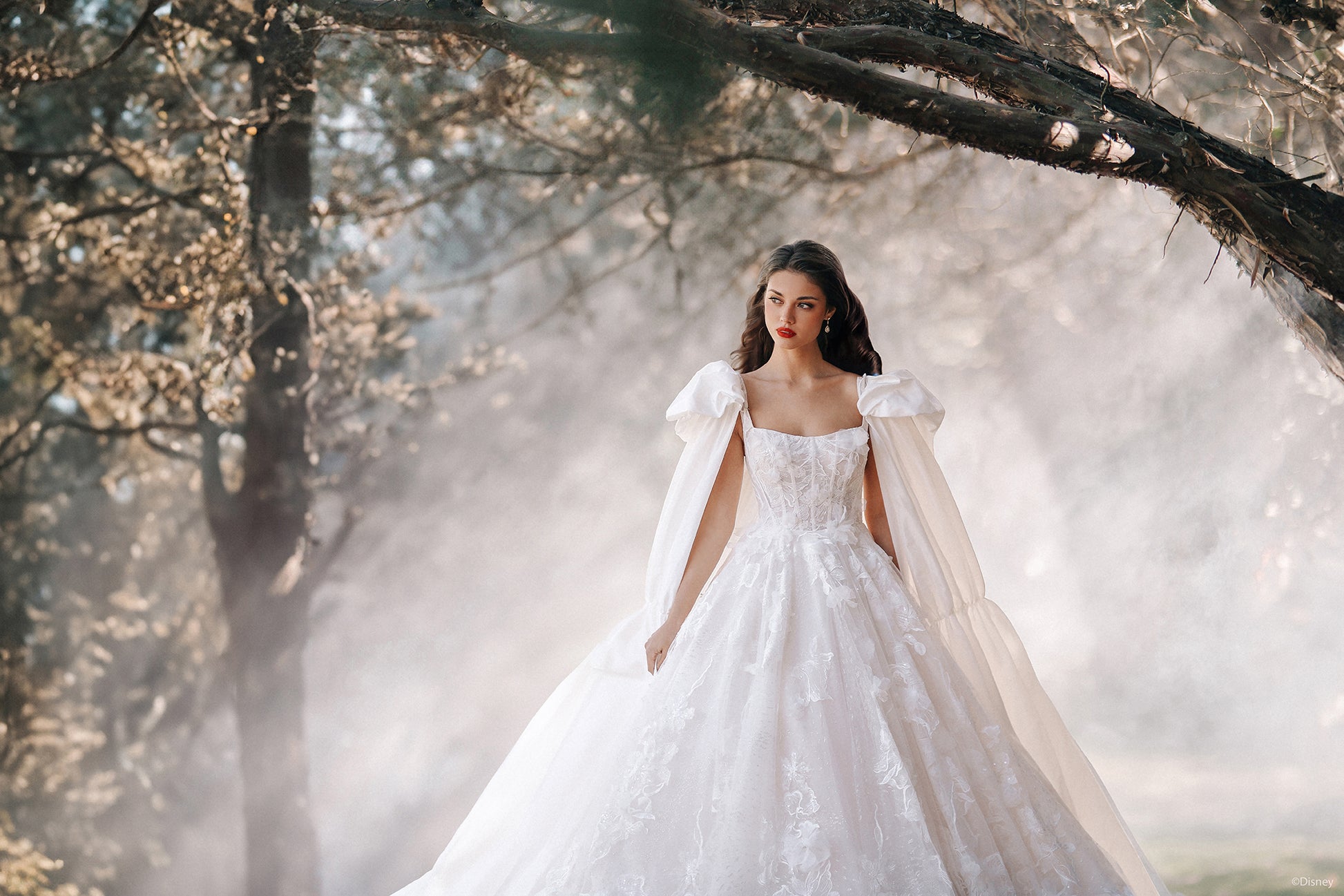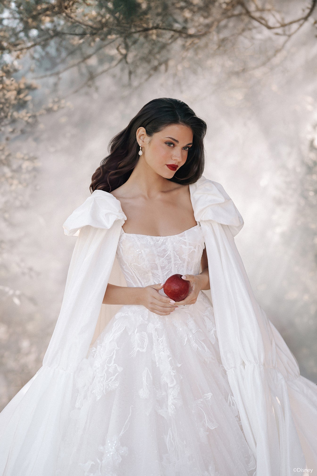 This special edition Snow White-inspired ballgown combines timeless elegance with a bold, modern twist. The gown features intricate 3D floral appliqués that add texture and charm, while the dramatic red taffeta cape provides a regal, storybook look, perfect for the ceremony. For the reception, remove the cape to reveal a classic ivory gown, offering two stunning looks in one. Ideal for a bride who embraces tradition and loves a touch of boldness, this gown celebrates Snow White’s enduring grace and the magic of her fairy tale. Read Less