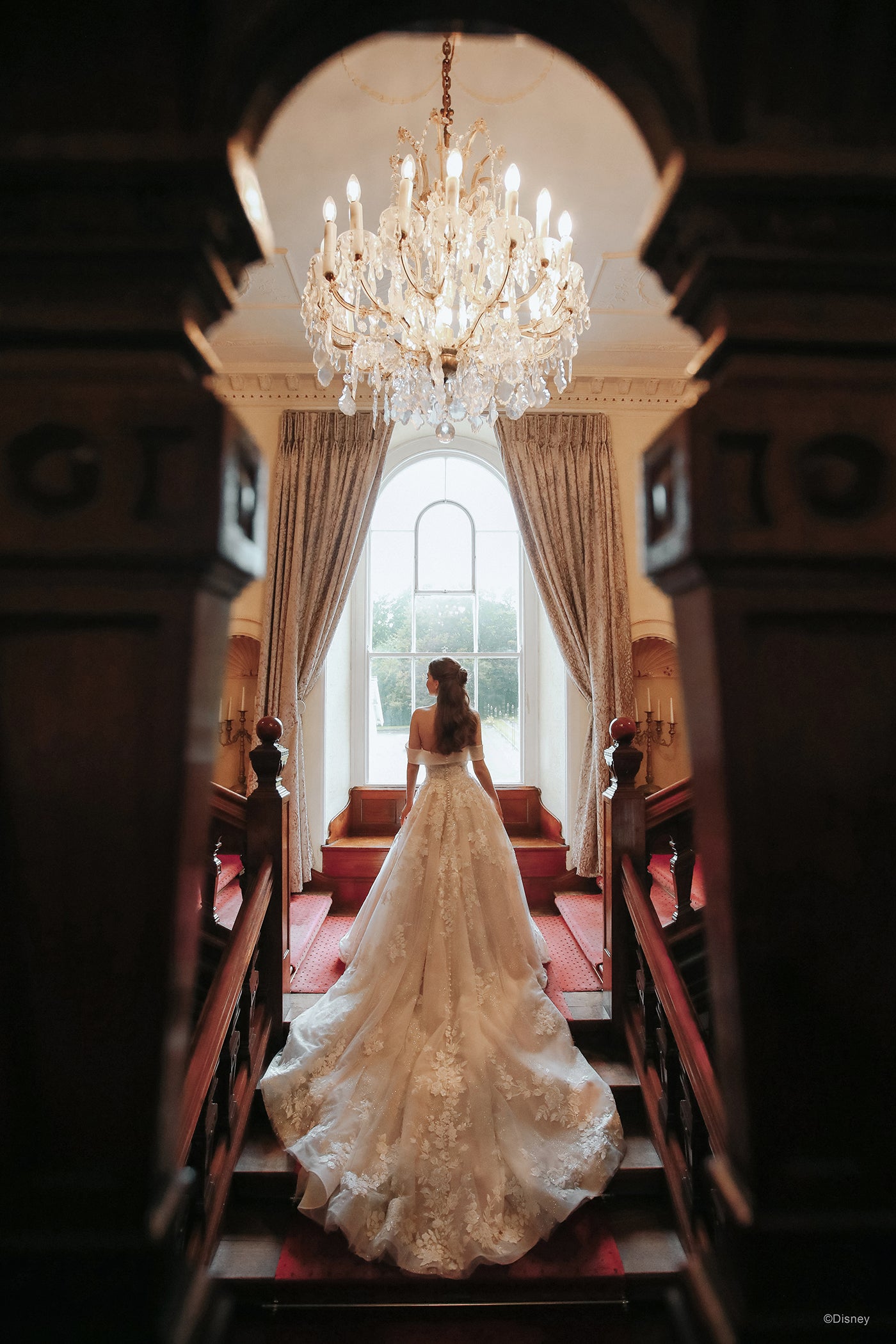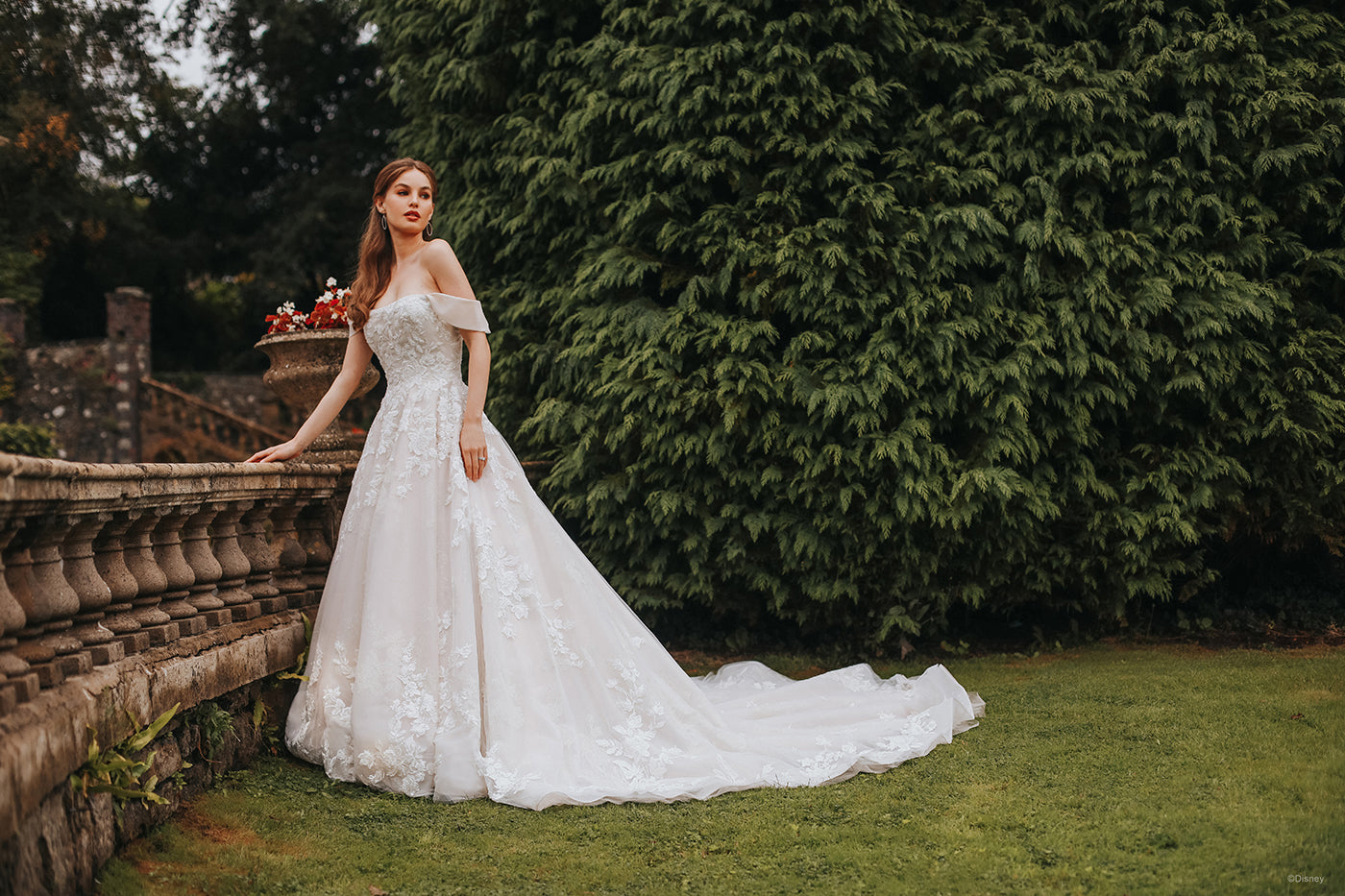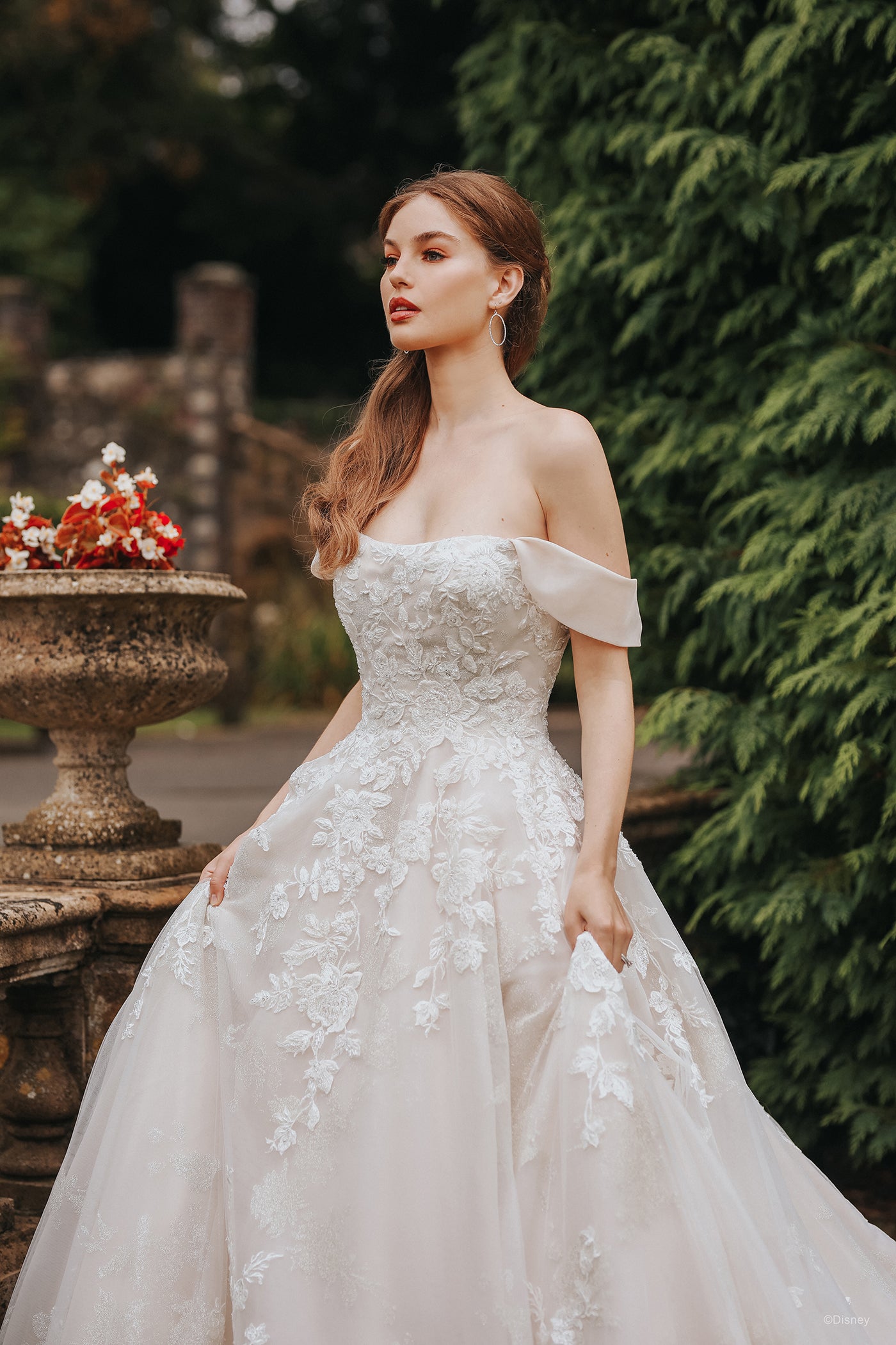 The iconic rose motif can be seen throughout the elegant Belle-inspired Platinum ballgown, with beaded lace appliqués, glitter brocade, a modified sweetheart neckline is finished with a soft drape sleeve.