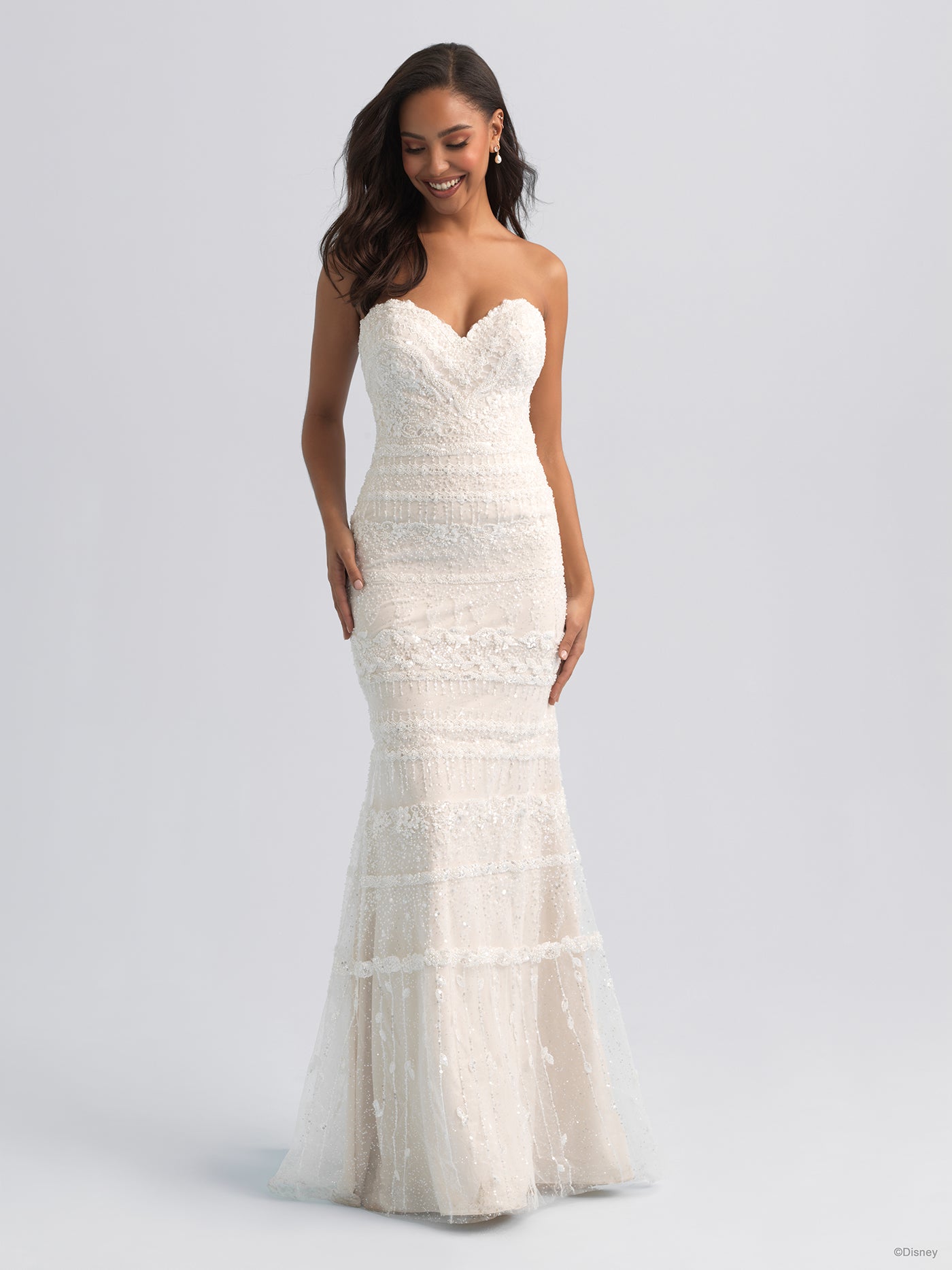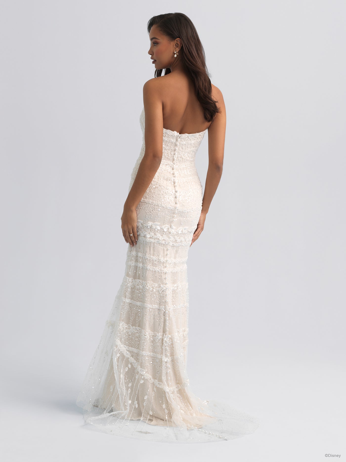Multilayered textures and a soft horizontal stripe trail down the Disney's Pocahontas Platinum gown, a strapless sheath gown finished with a scalloped edging and detachable tulle and lace train.