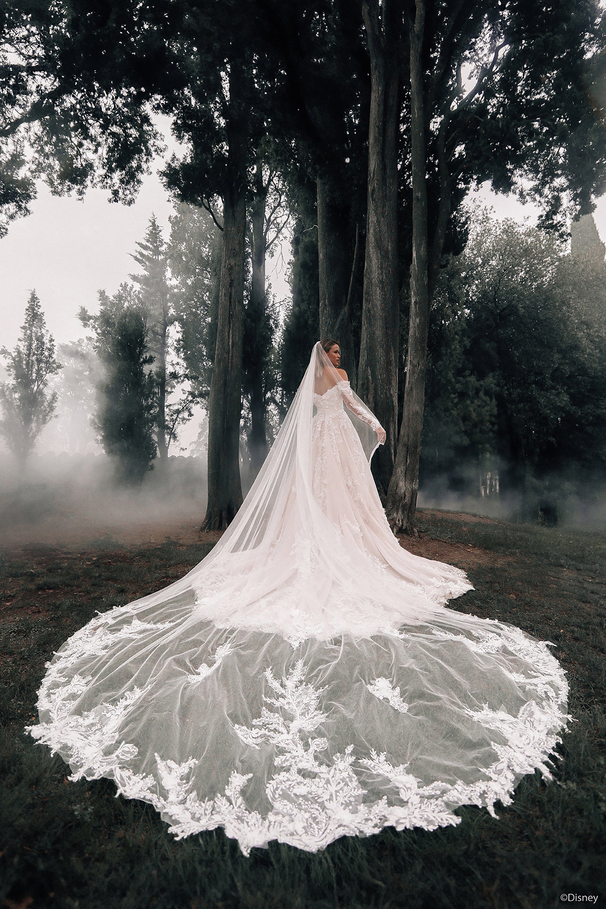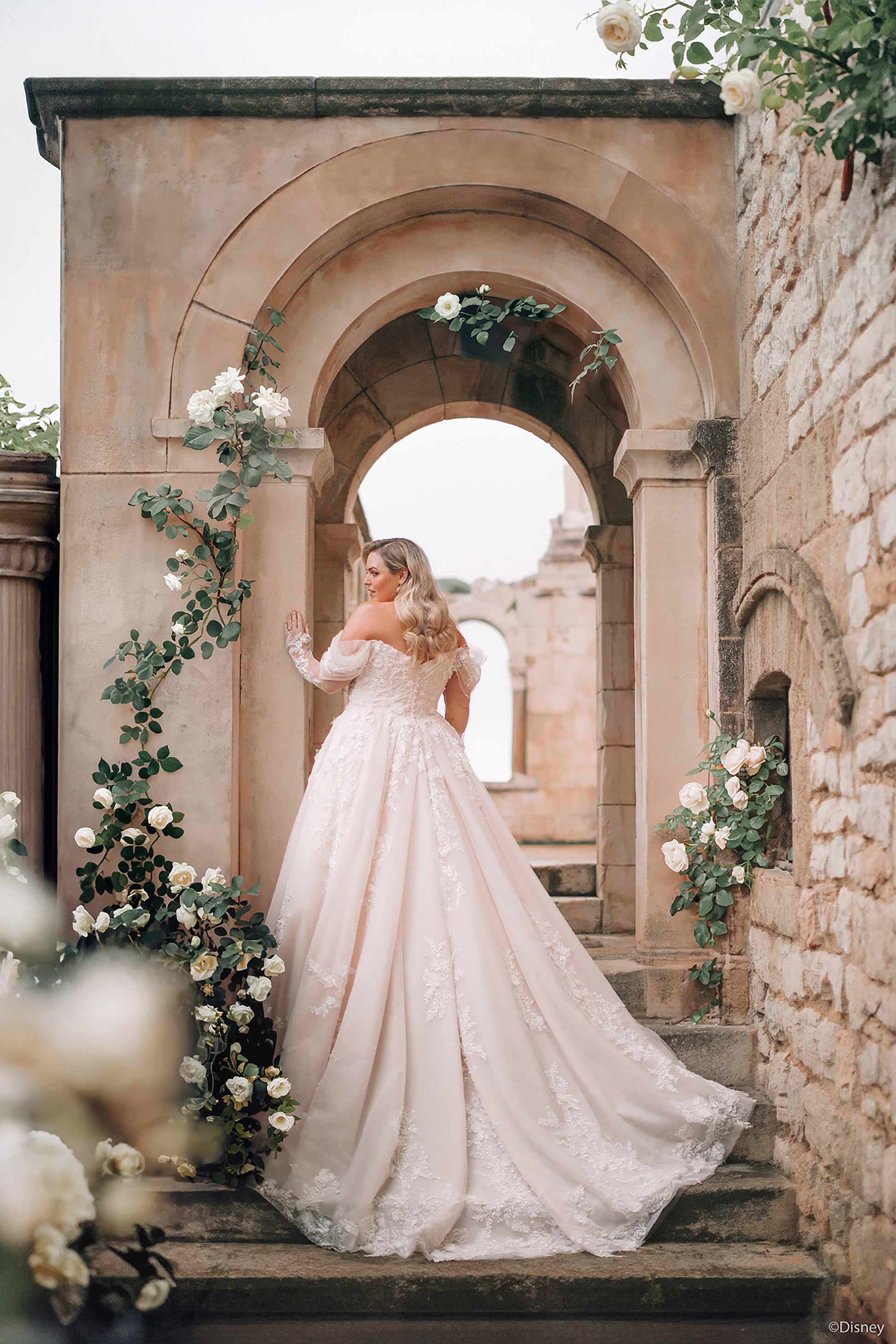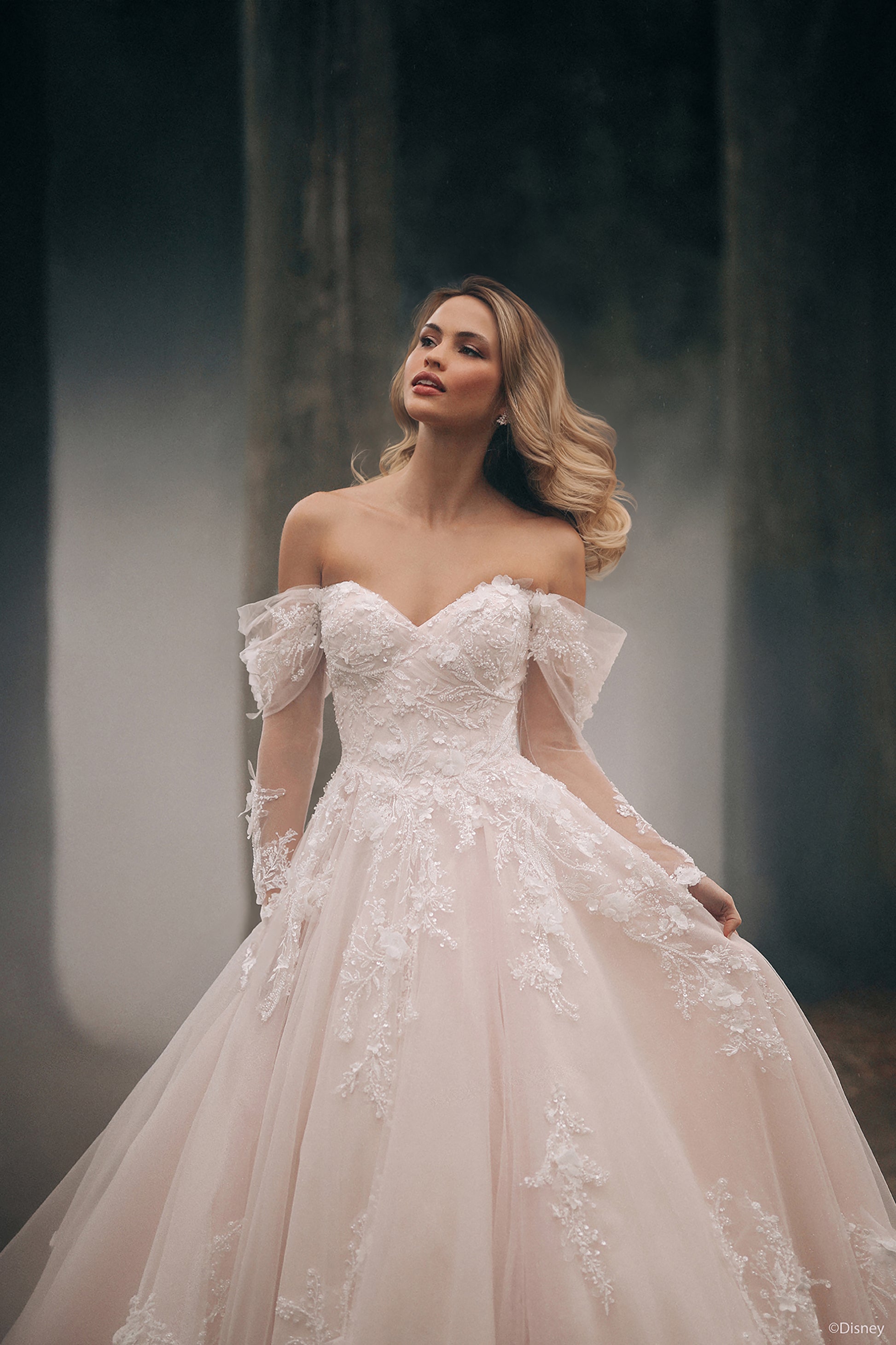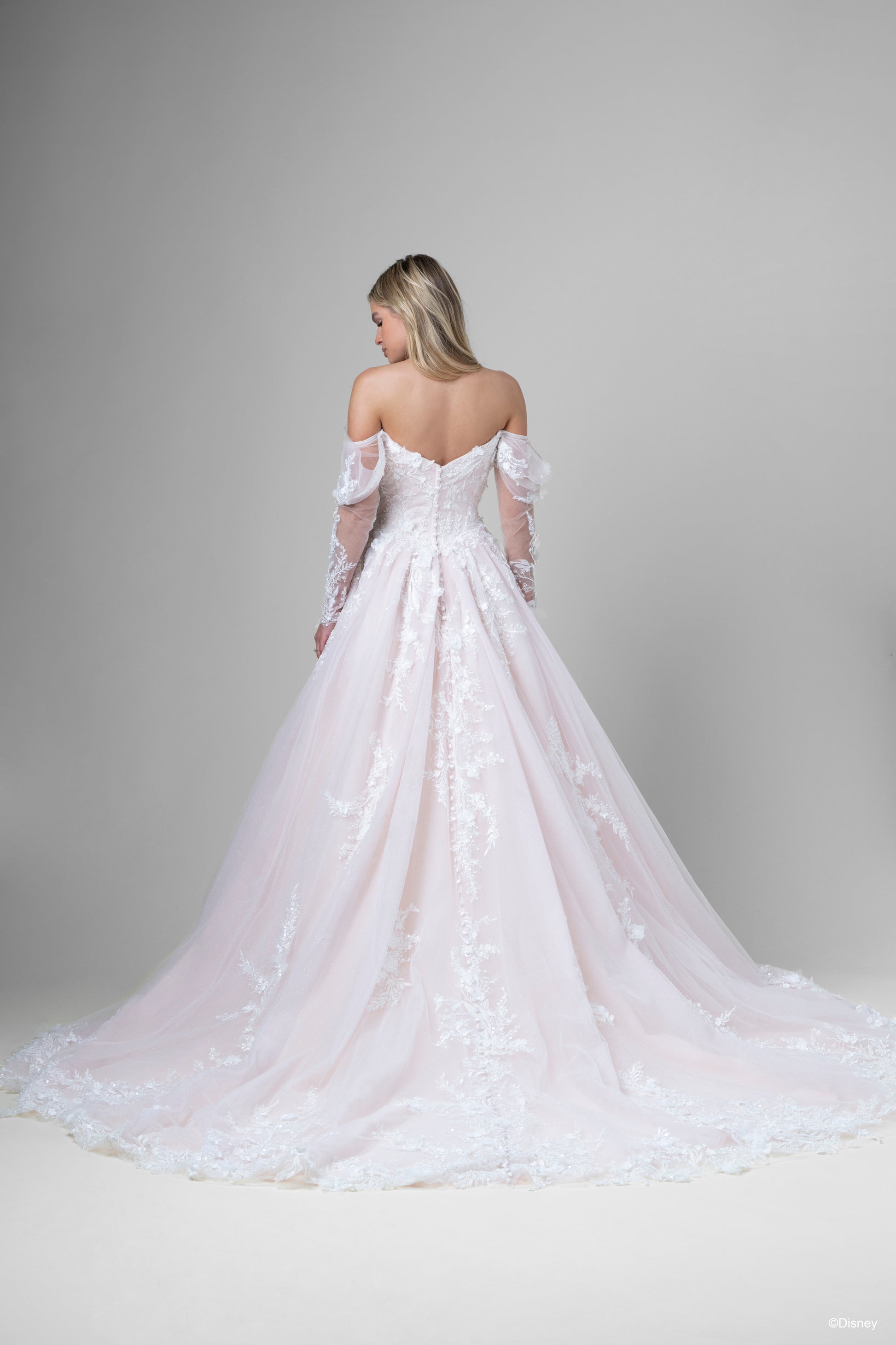 In a soft, romantic shade of light pink, this enchanting Aurora-inspired gown captures the essence of Sleeping Beauty’s timeless story: that true love conquers all. The sweetheart neckline and off-the-shoulder design lend a graceful silhouette, while the detachable long sleeves and off the shoulder sleeves allow for a seamless transition between classic elegance and modern charm. With its natural waistline and dimensional lace, sequins, and beaded appliqués, this gown mirrors Aurora’s gentle spirit and the dreamy beauty of her world. Perfect for a bride seeking her own fairytale, this gown’s versatile design and enchanting details will make every moment feel like a waking dream. Pictured with matching veil DV41, sold separately. Read Less