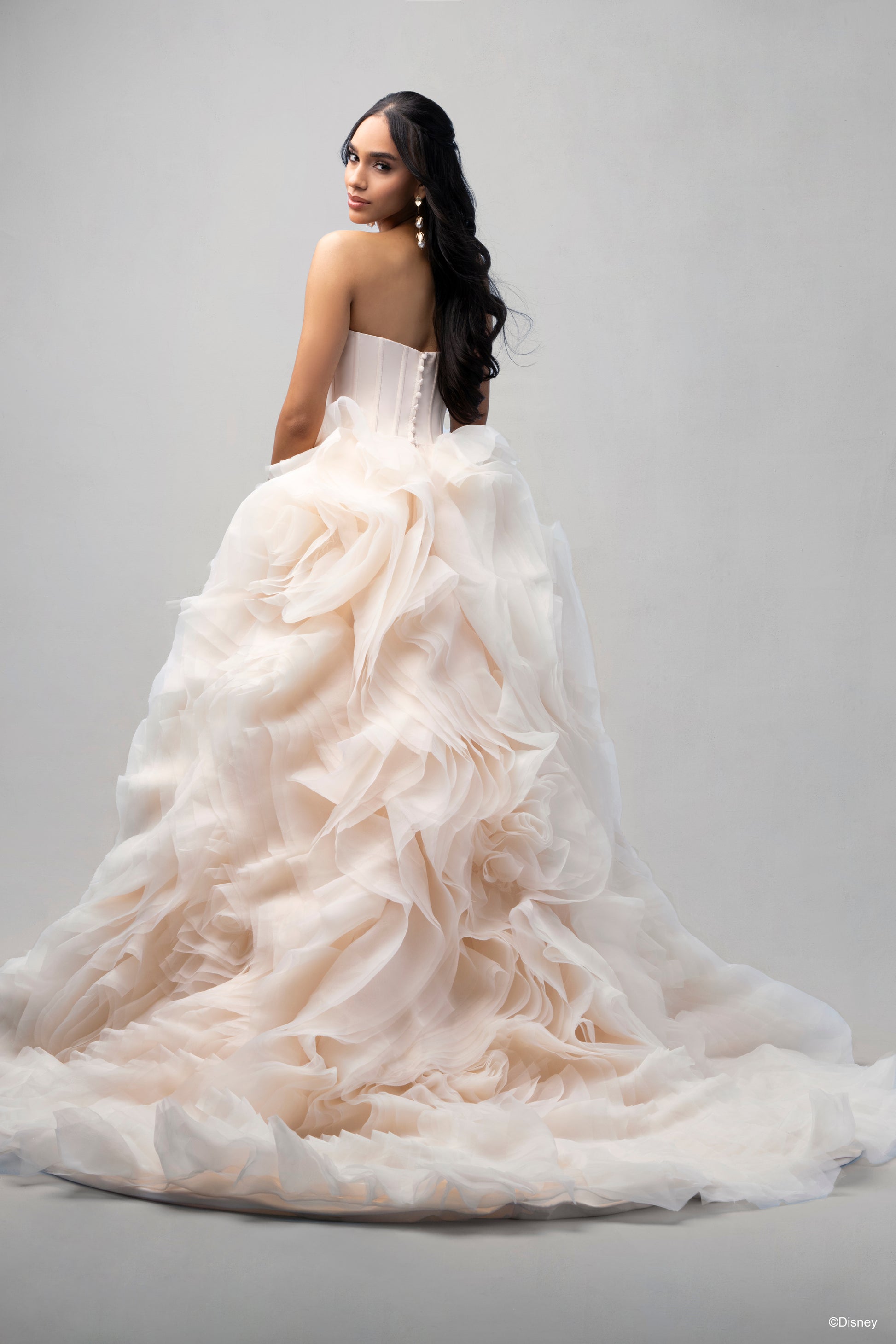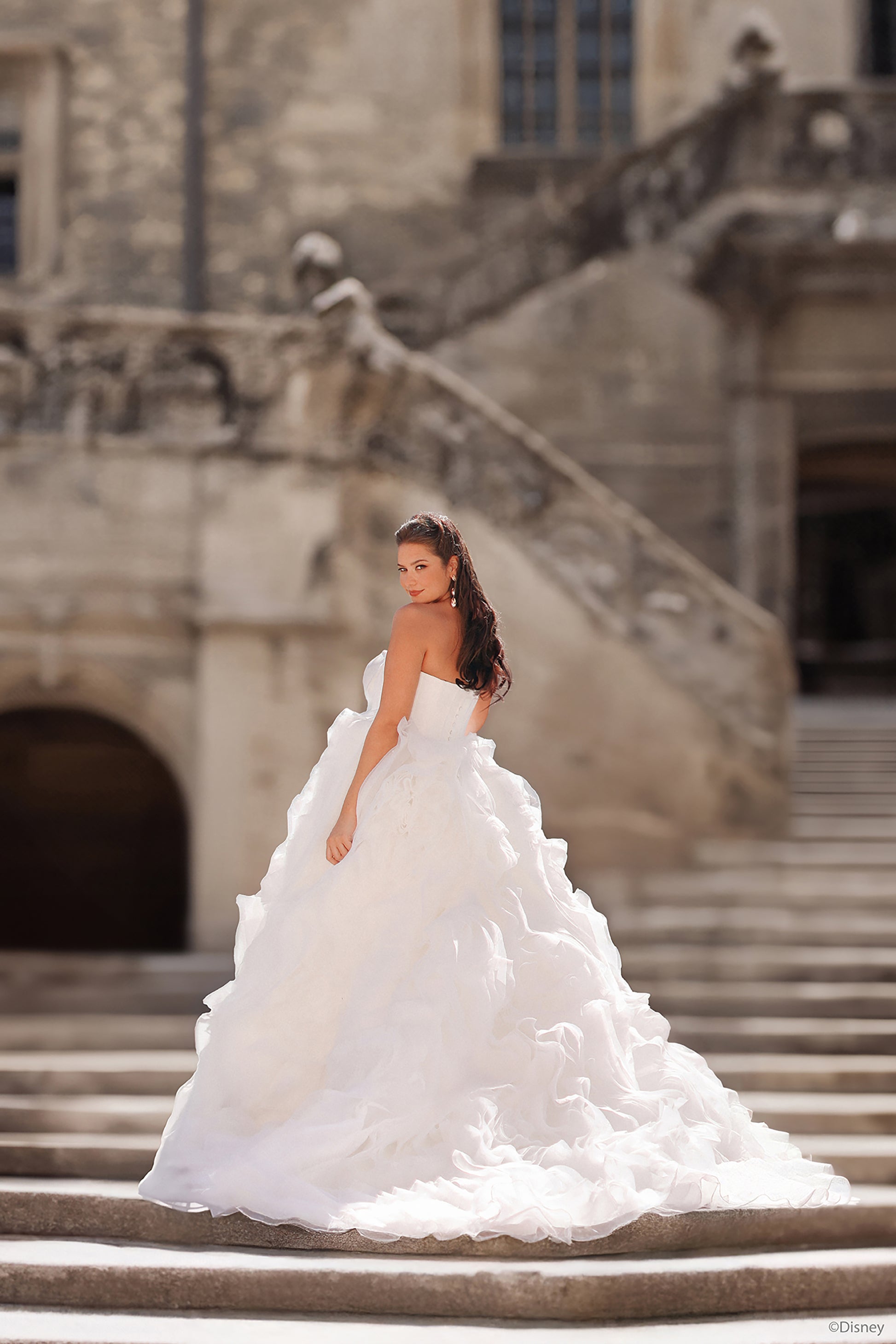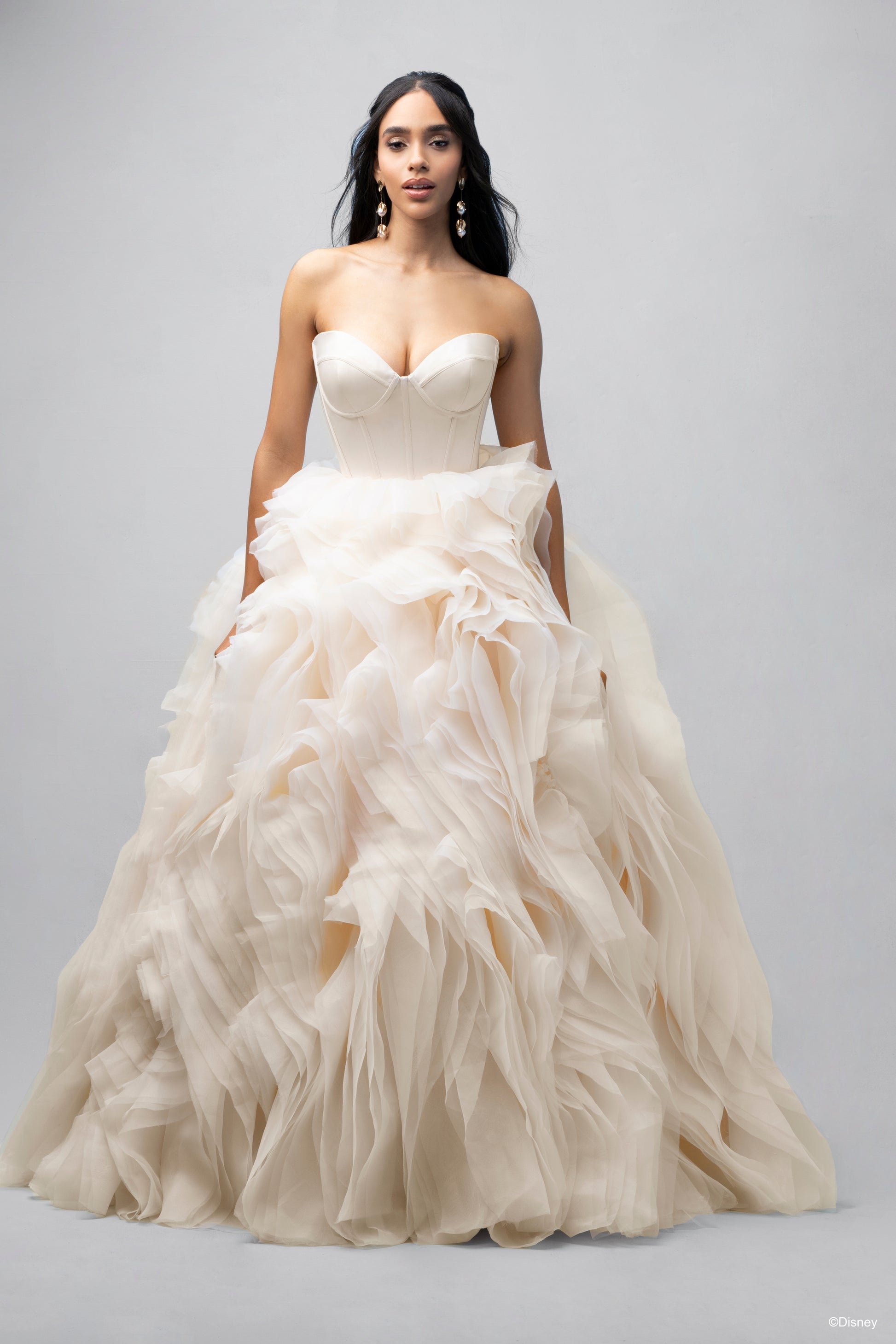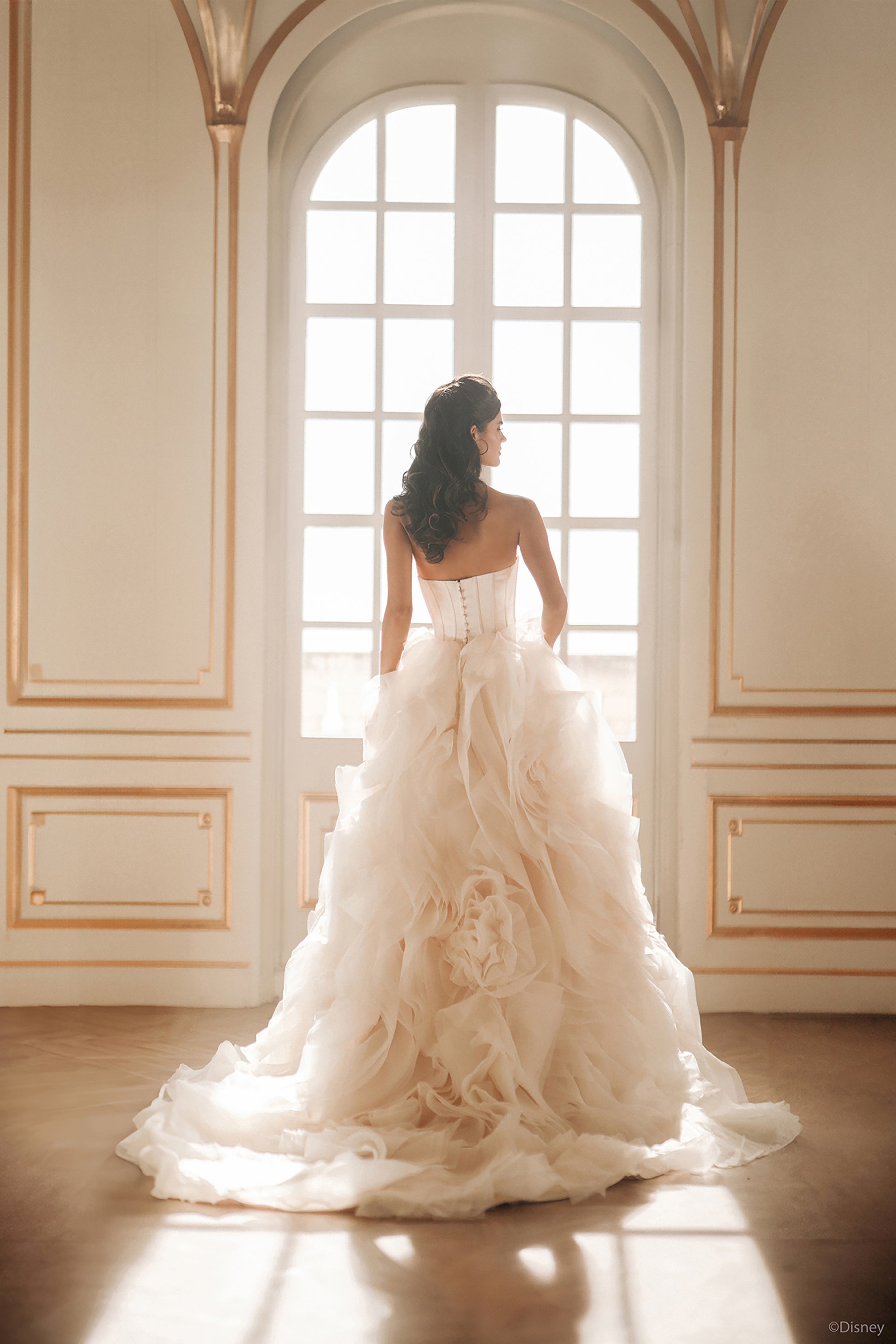 Inspired by Belle’s warmth and wisdom, this enchanting ballgown embodies the magic of her story. With its natural waistline and layers of cascading organza ruffles, this gown flows like the pages of Belle’s beloved books, bringing elegance to every step. The chic bodice features exposed boning and a corset-inspired design, capturing both sophistication and strength—an ode to Belle’s beauty within. In a radiant shade of light gold, this gown reflects the grandeur of the Beast's enchanted castle and Belle’s timeless charm. Perfect for the bride who, like Belle, sees beyond appearances and follows her heart, this gown is a celebration of true love's transformative power. Read Less