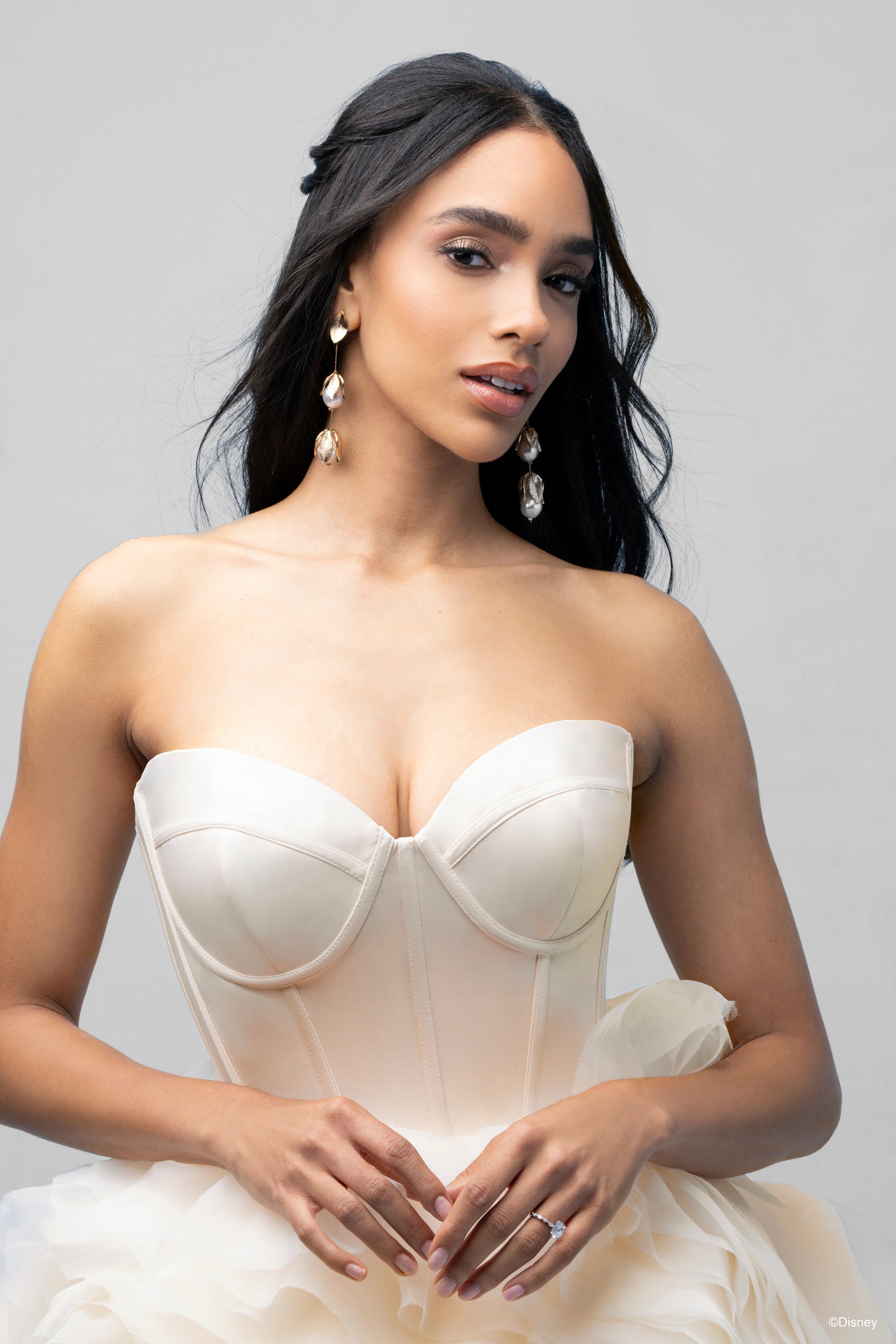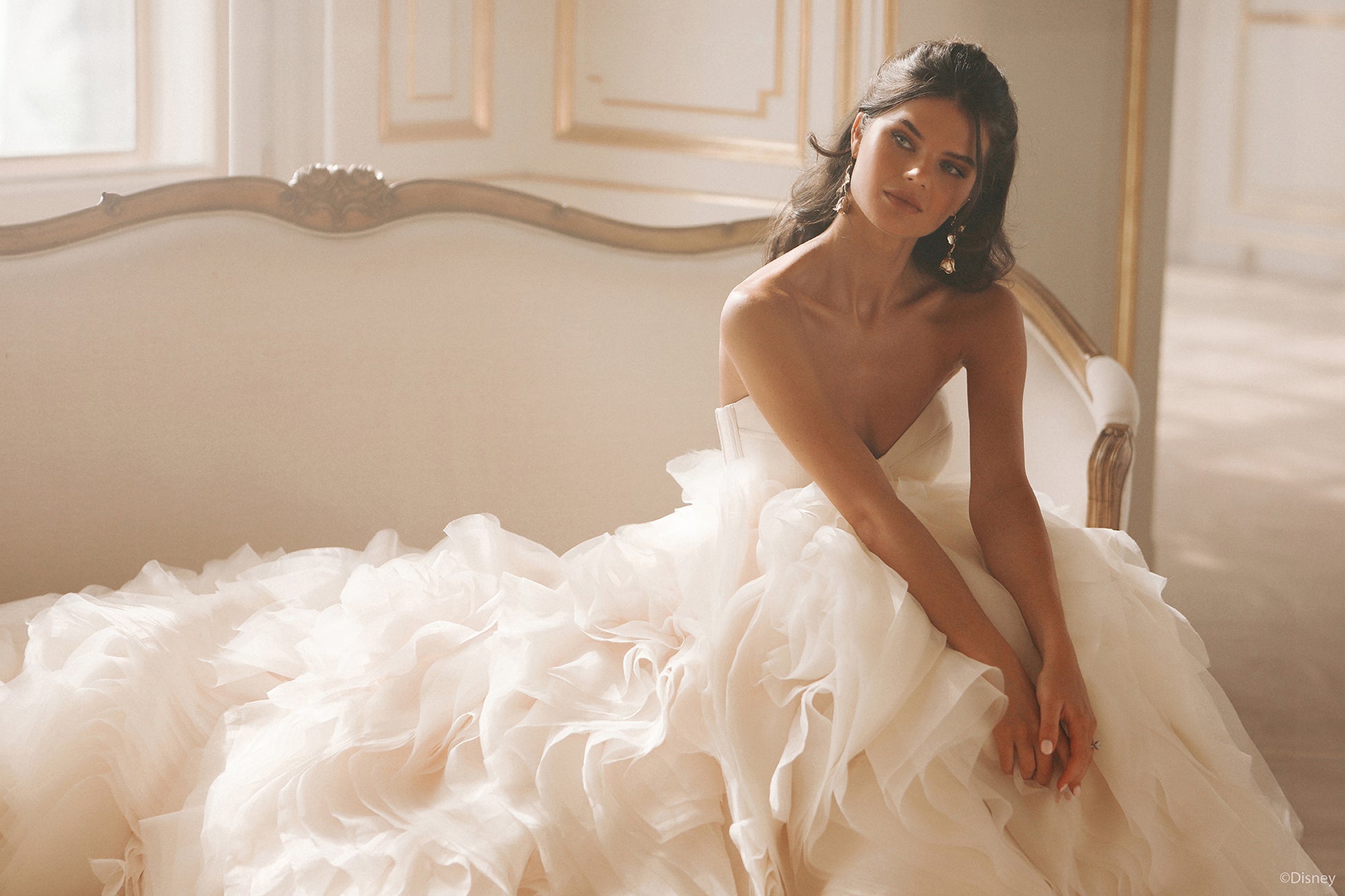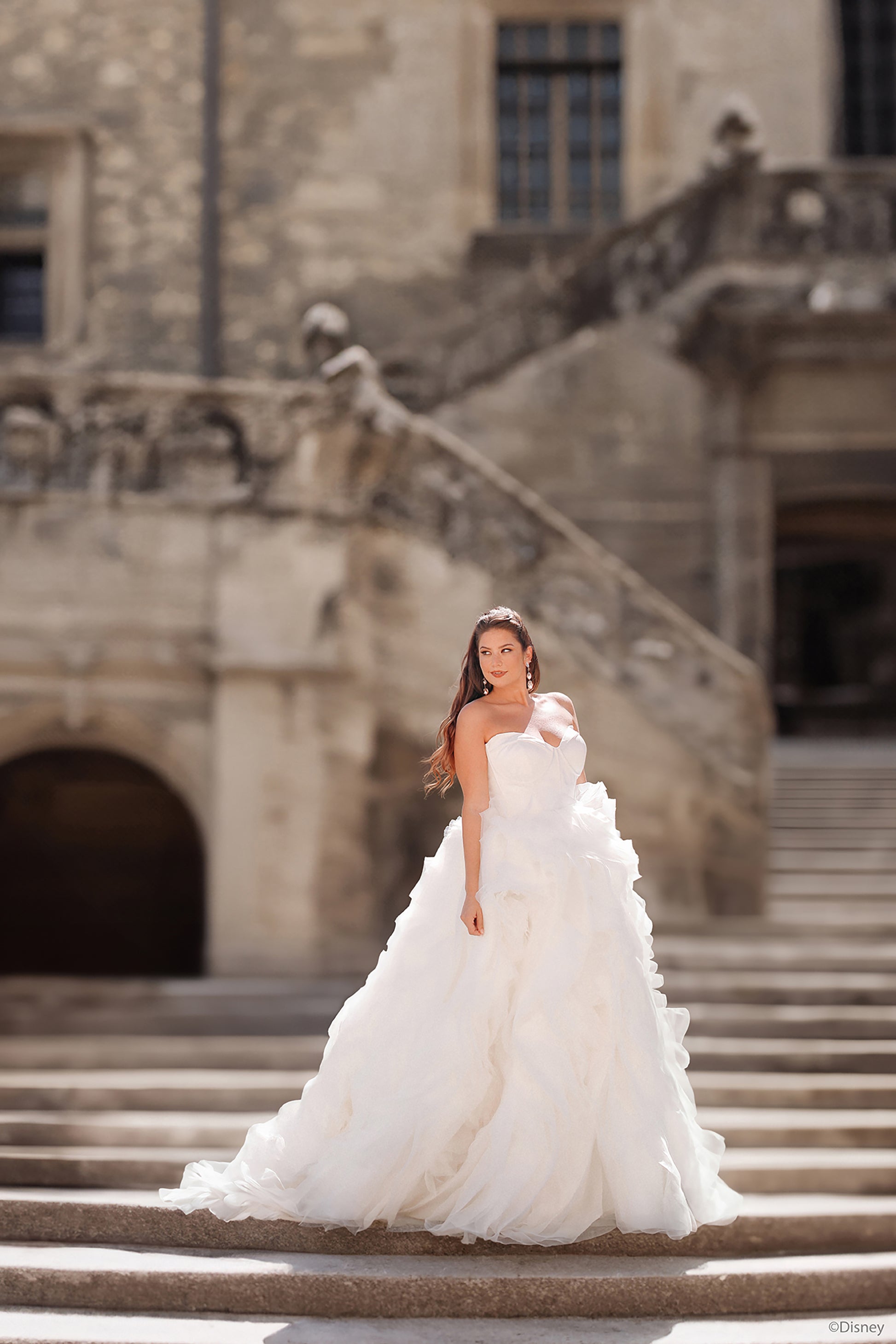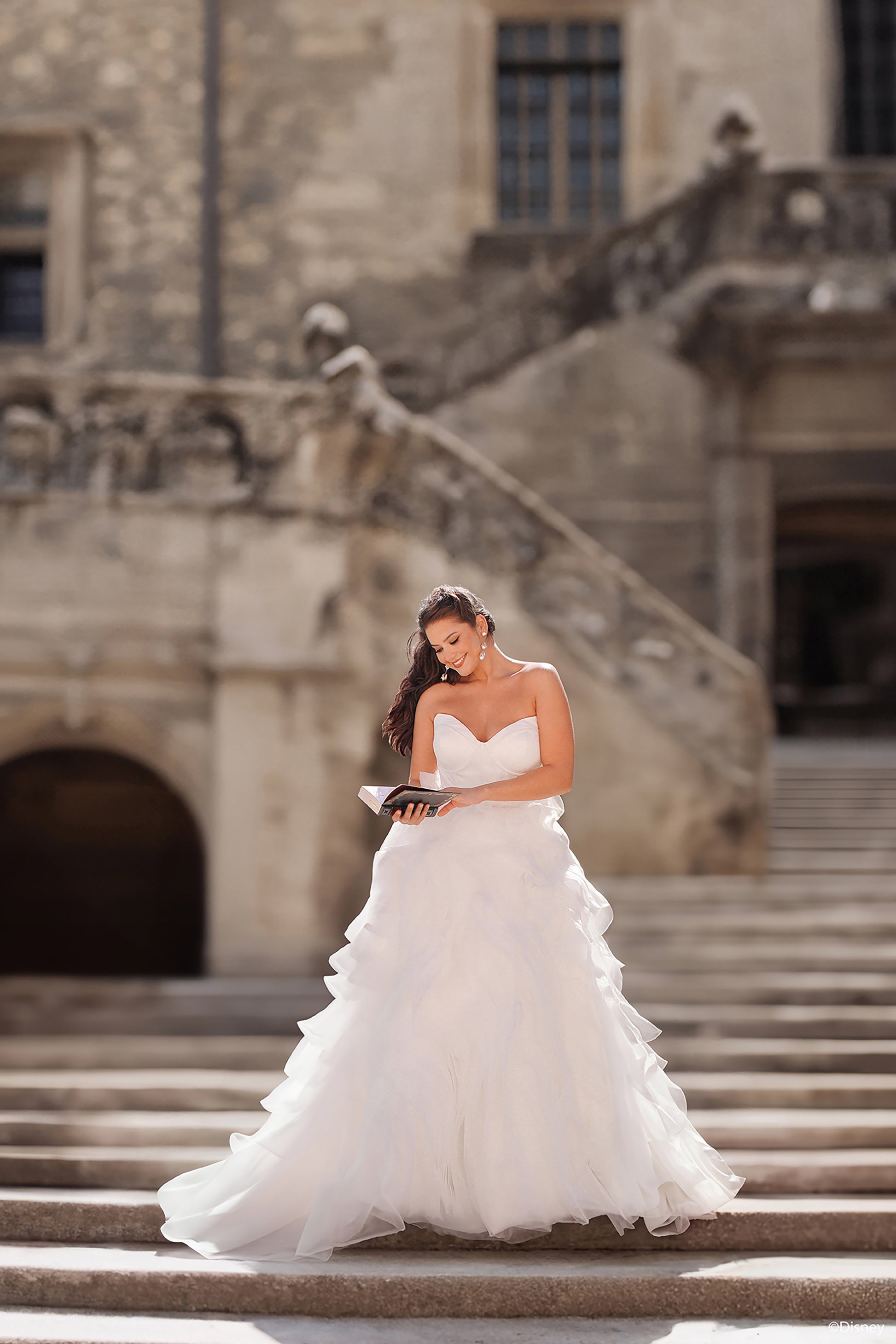 Inspired by Belle’s warmth and wisdom, this enchanting ballgown embodies the magic of her story. With its natural waistline and layers of cascading organza ruffles, this gown flows like the pages of Belle’s beloved books, bringing elegance to every step. The chic bodice features exposed boning and a corset-inspired design, capturing both sophistication and strength—an ode to Belle’s beauty within. In a radiant shade of light gold, this gown reflects the grandeur of the Beast's enchanted castle and Belle’s timeless charm. Perfect for the bride who, like Belle, sees beyond appearances and follows her heart, this gown is a celebration of true love's transformative power. Read Less