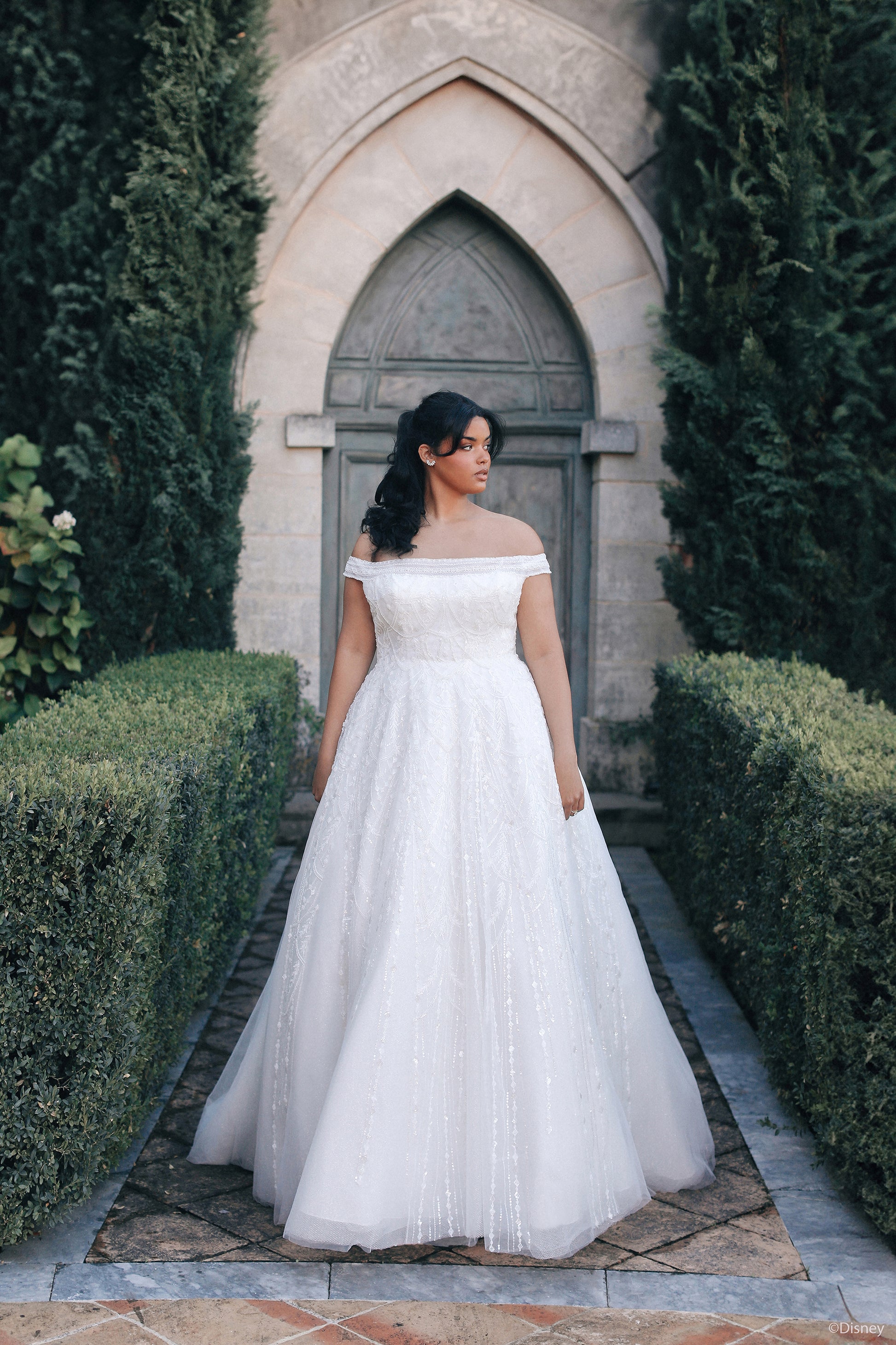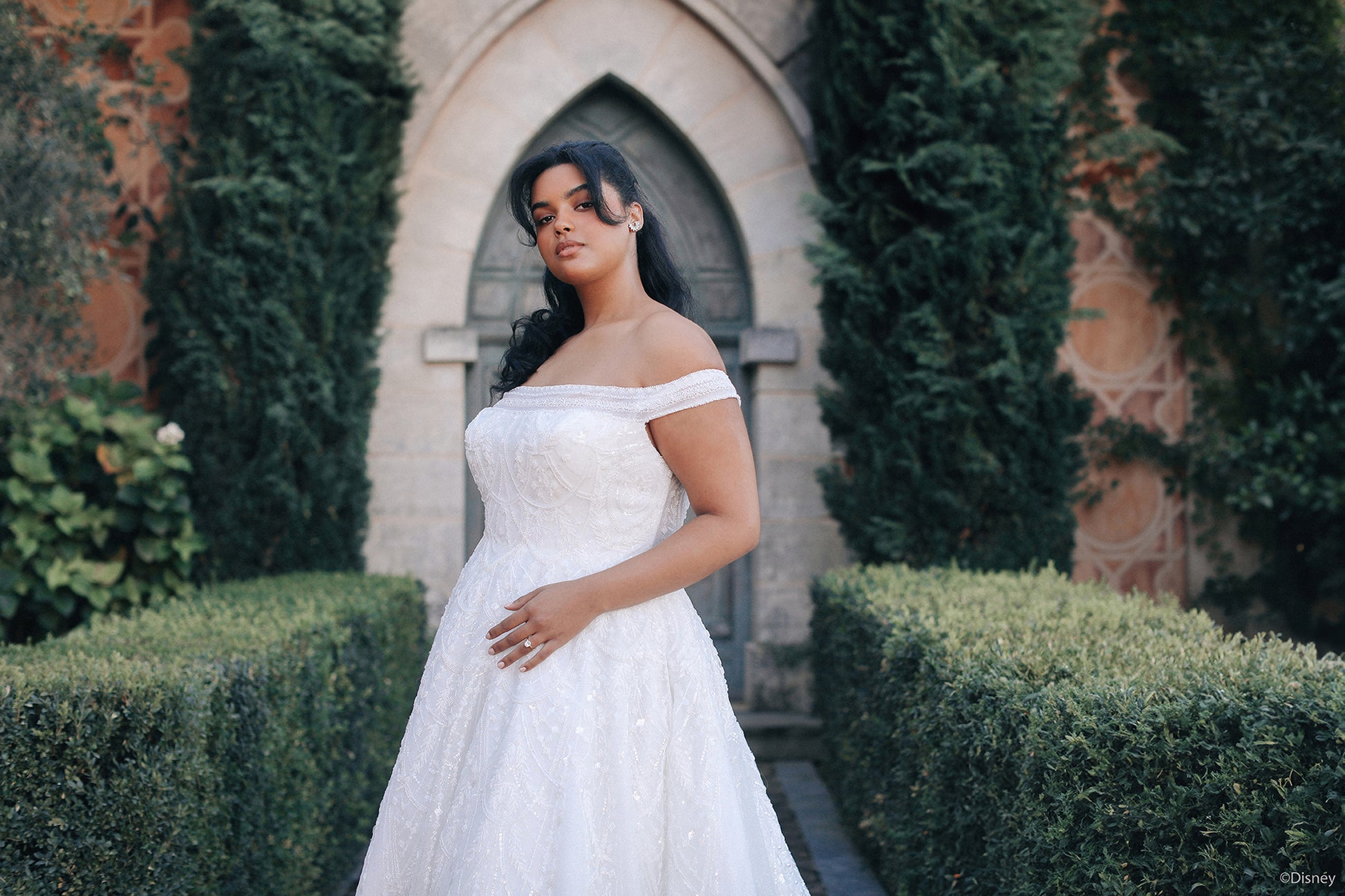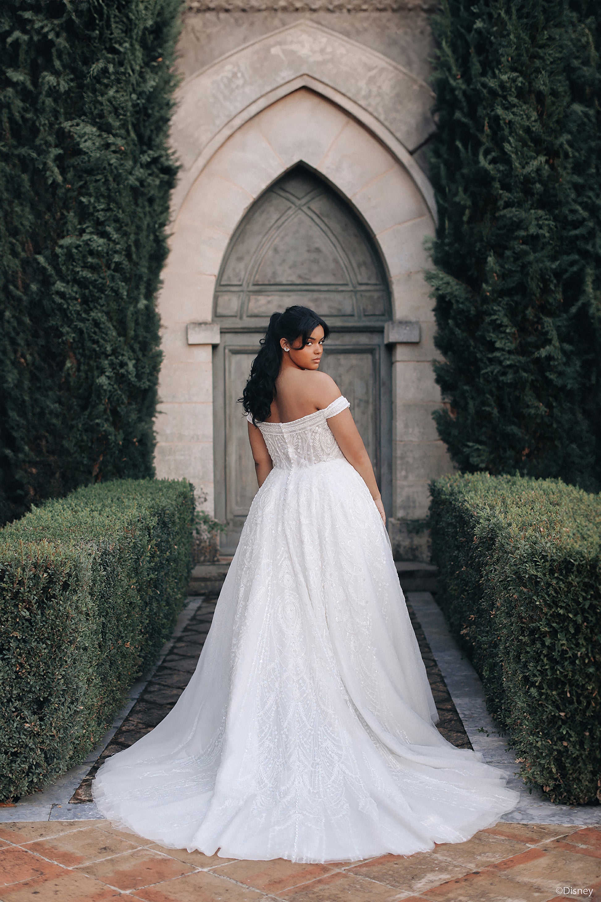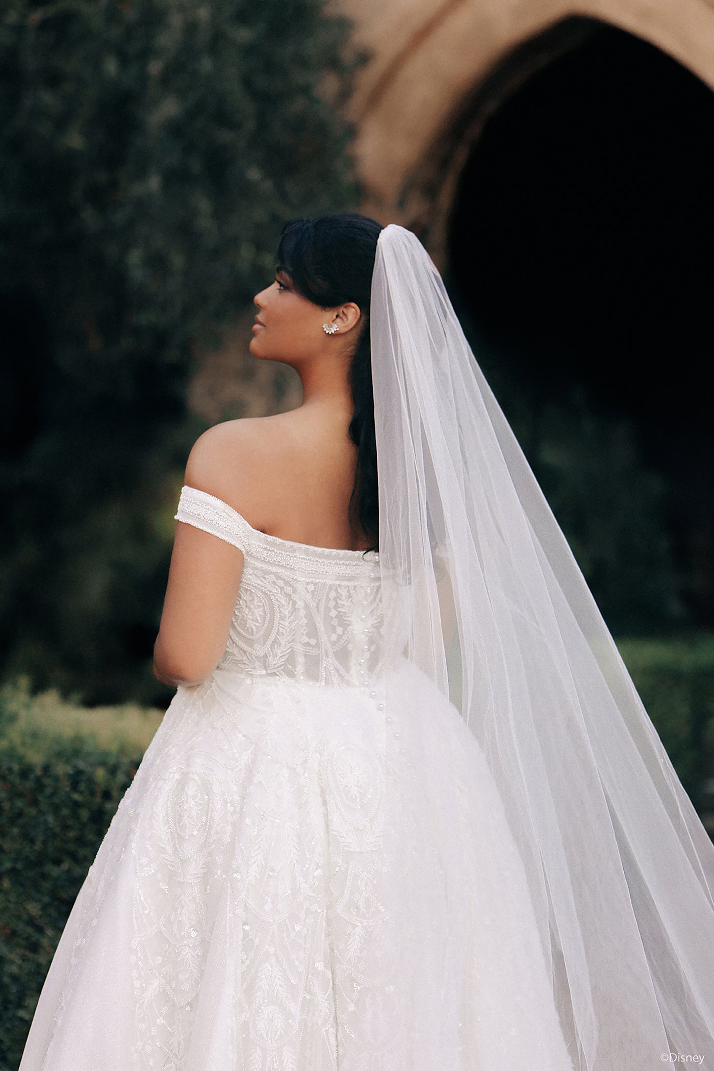 Inspired by Jasmine’s adventurous heart, this enchanting ballgown features a sophisticated straight neckline and off-the-shoulder sleeves. The natural waistline, adorned with intricate beading and sequins, glimmers over layers of swiss dot tulle, adding a touch of magic. Available in rich mocha and gold, this gown evokes Jasmine’s royal heritage and the opulence of Agrabah, blending warmth with a hint of bohemian allure. Perfect for the bride who dreams of a whole new world and a happily ever after that’s the greatest adventure of all, this gown is a tribute to Jasmine’s timeless beauty and spirit of wanderlust. Pictured with matching veil, DV44, sold separately. Read Less