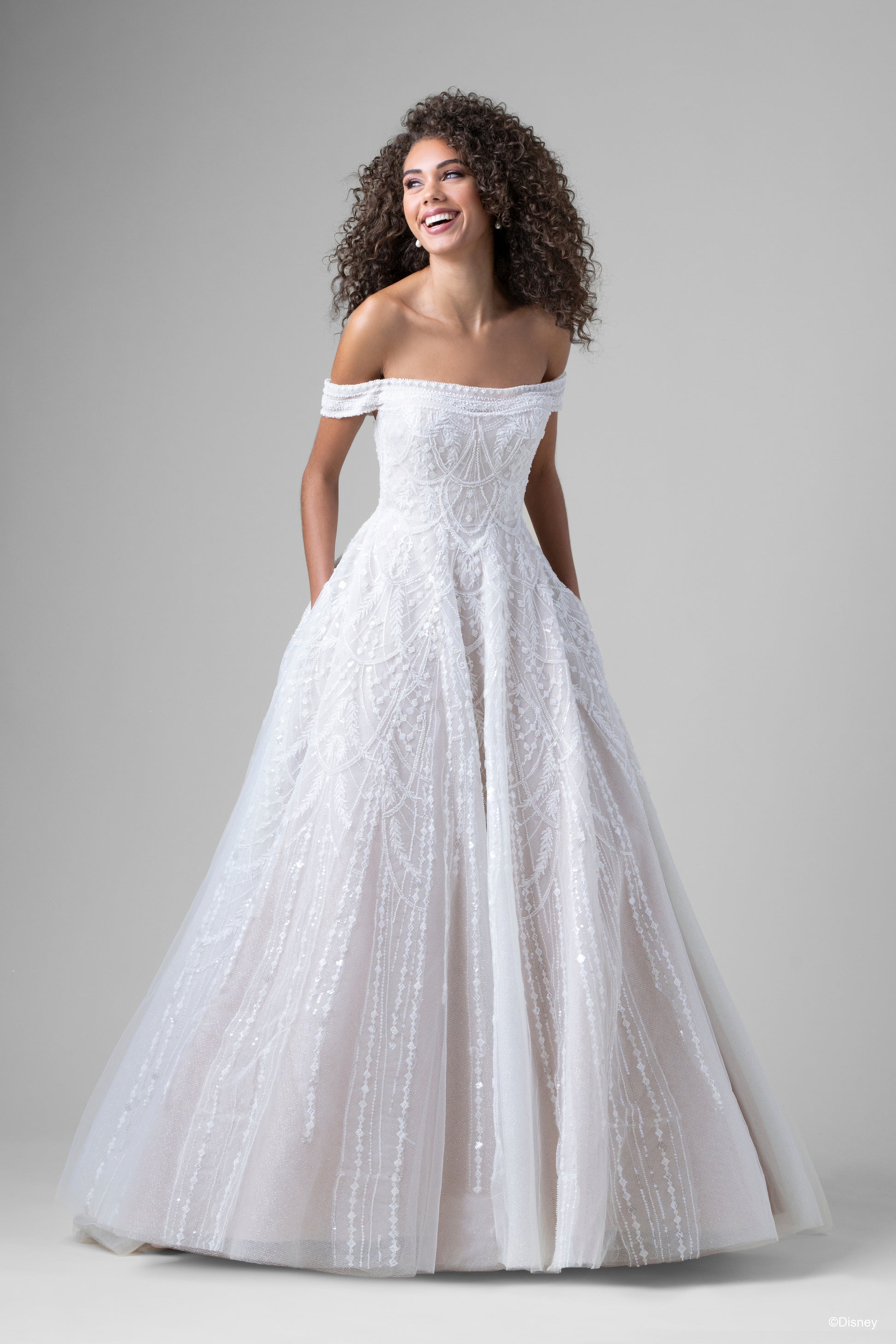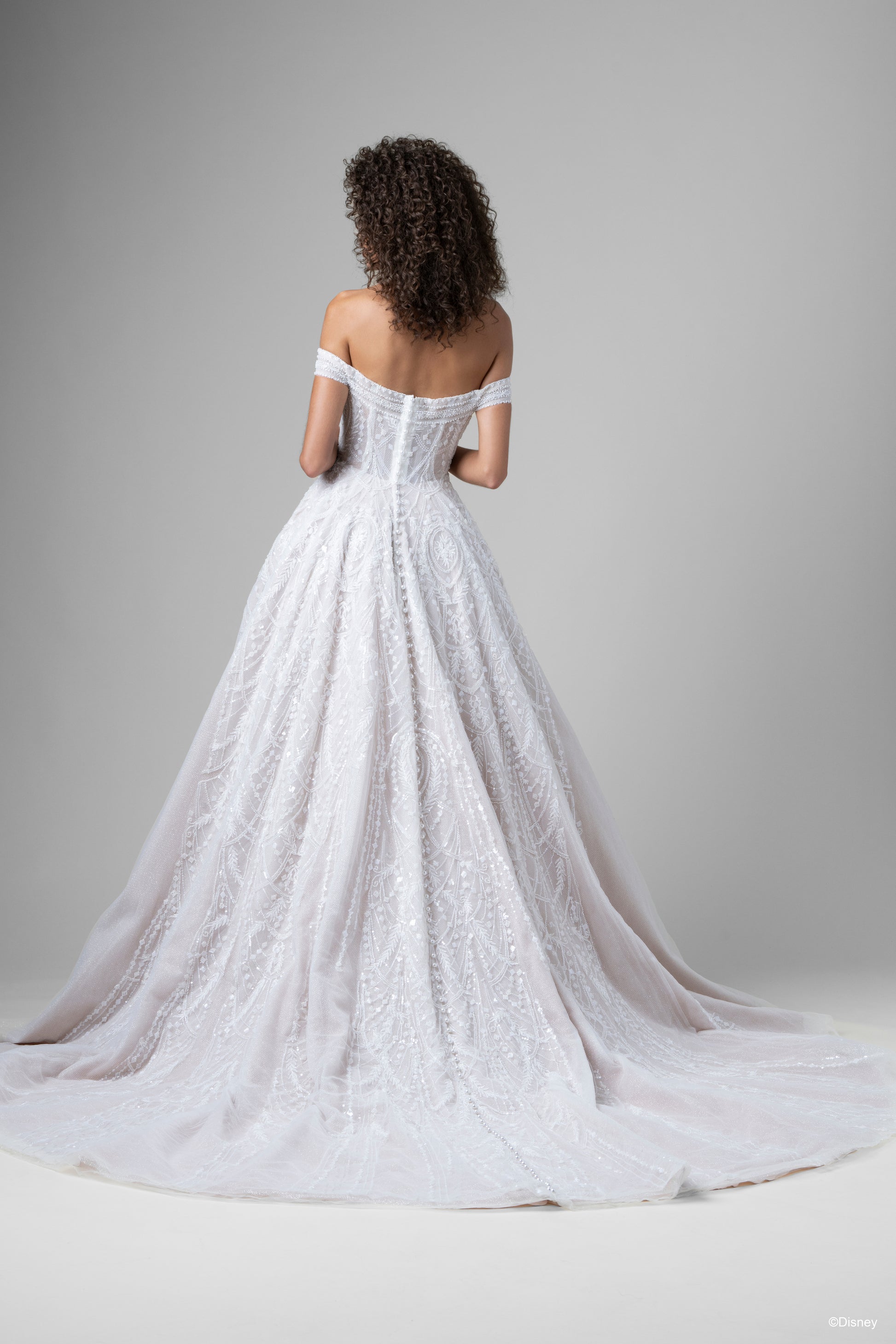 Inspired by Jasmine’s adventurous heart, this enchanting ballgown features a sophisticated straight neckline and off-the-shoulder sleeves. The natural waistline, adorned with intricate beading and sequins, glimmers over layers of swiss dot tulle, adding a touch of magic. Available in ri... Read More