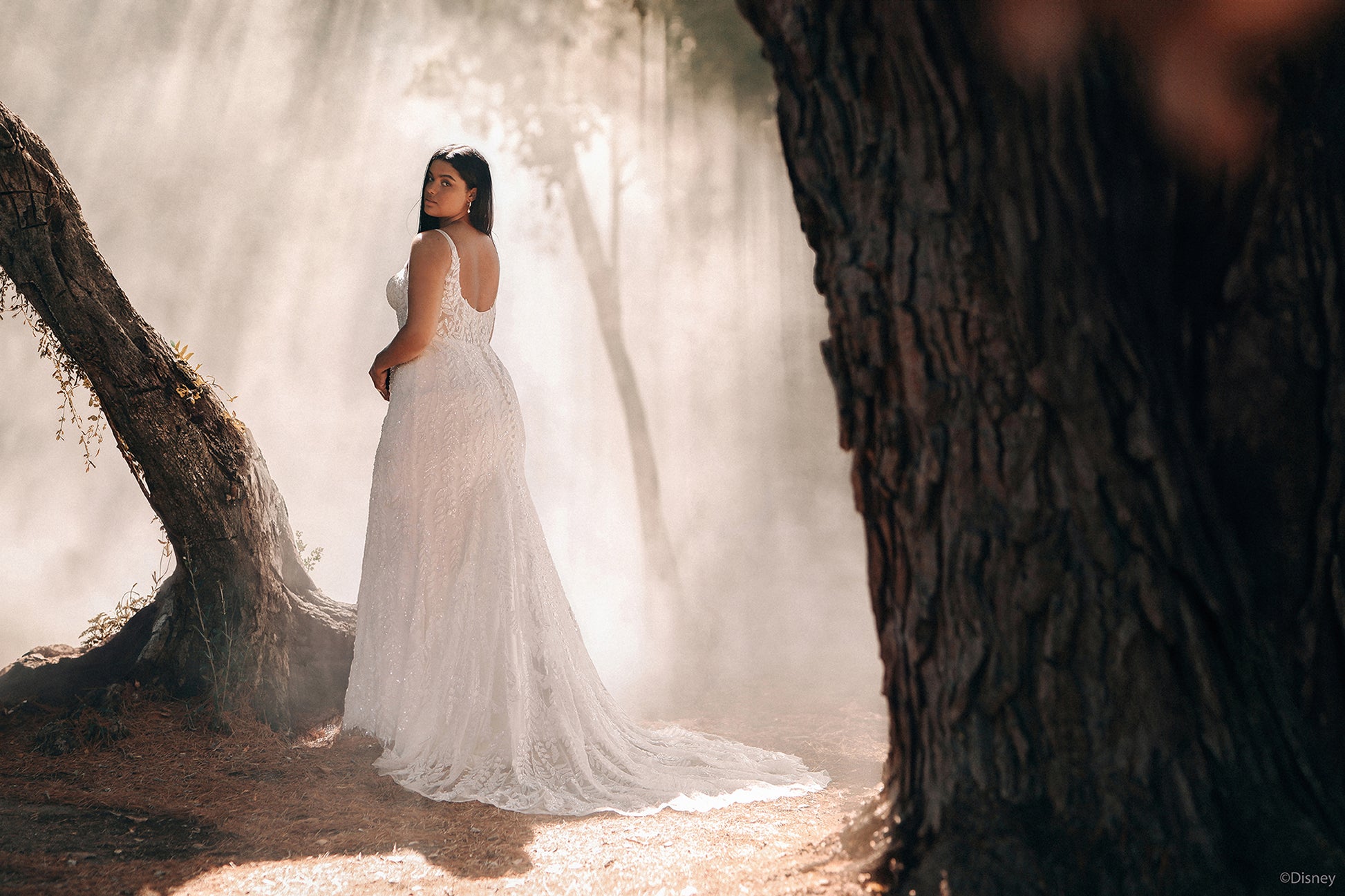 Embodying Pocahontas’s adventurous spirit and deep connection to nature, this elegant sheath gown combines timeless beauty with organic detail. The square neckline and sleeveless design offer a modern, refined silhouette, while the natural waistline is adorned with tonal beading and seq... Read More