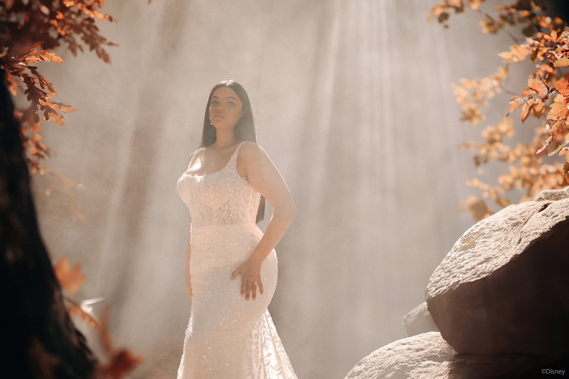 Embodying Pocahontas’s adventurous spirit and deep connection to nature, this elegant sheath gown combines timeless beauty with organic detail. The square neckline and sleeveless design offer a modern, refined silhouette, while the natural waistline is adorned with tonal beading and sequins that add a subtle sparkle. A chiffon leaf pattern is scattered throughout the gown, evoking the natural beauty of Pocahontas’s world. In earthy almond and sand tones, this dress reflects the harmony, self-discovery, and strength of a bride inspired by the beauty of nature and love. Read Less