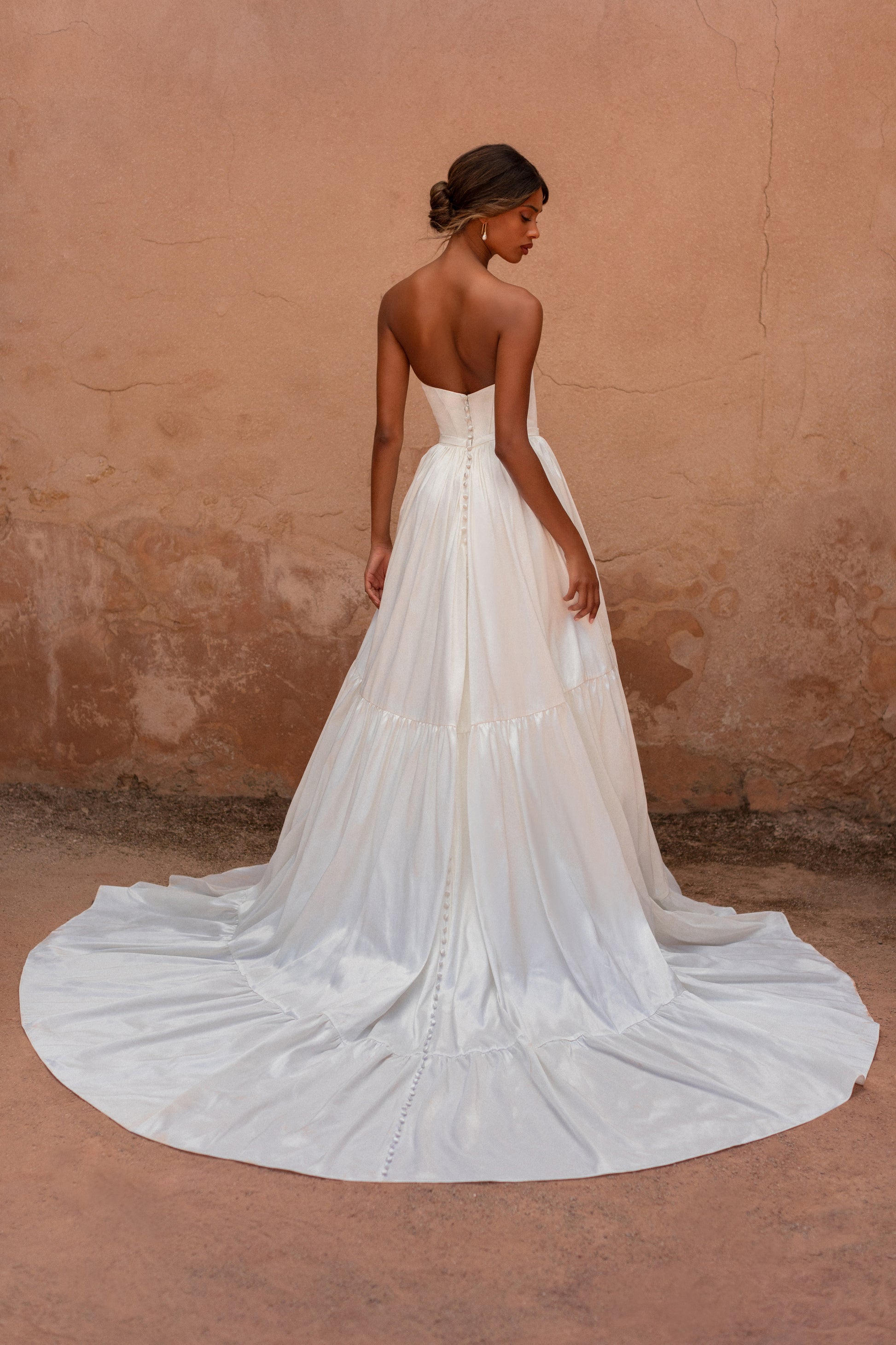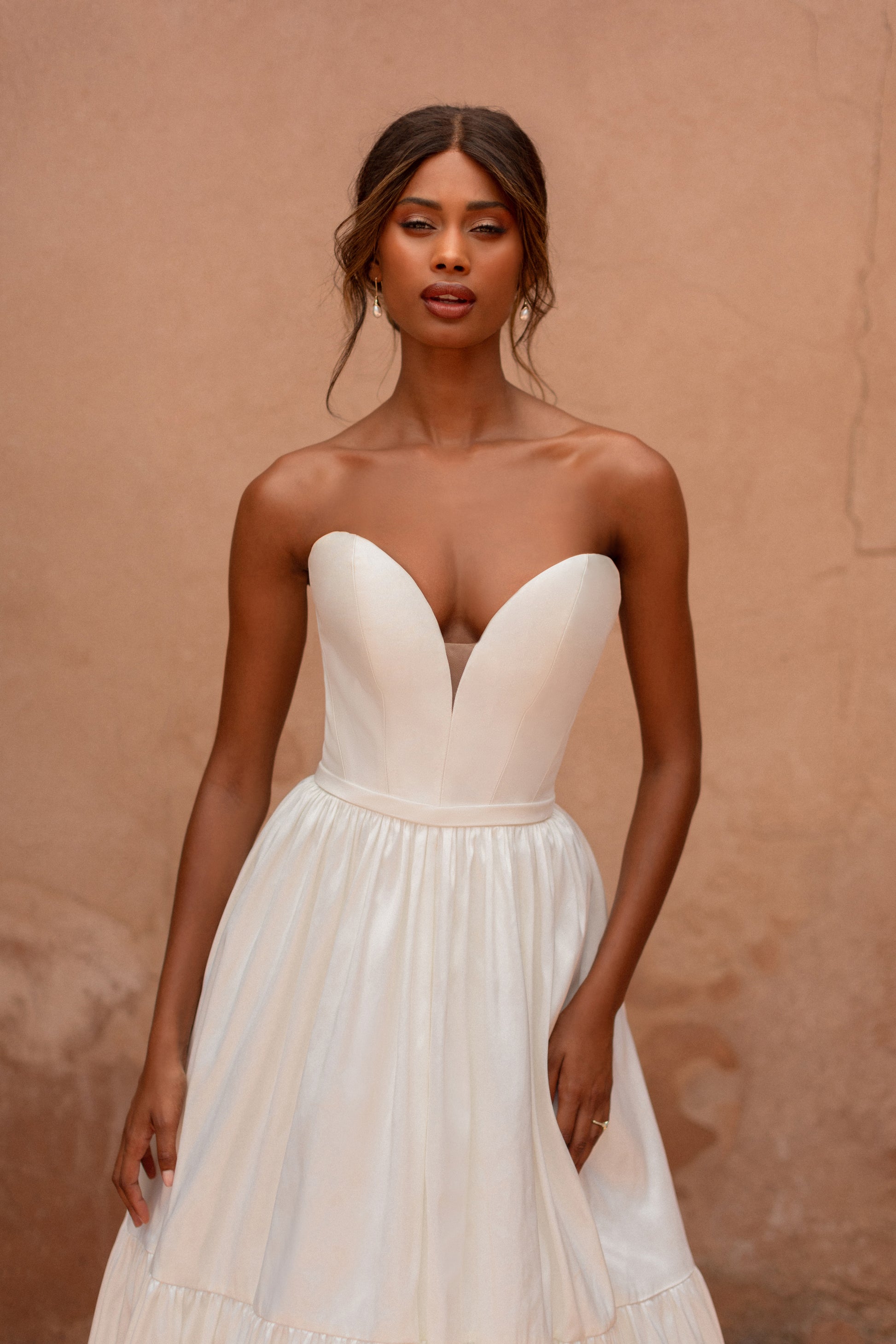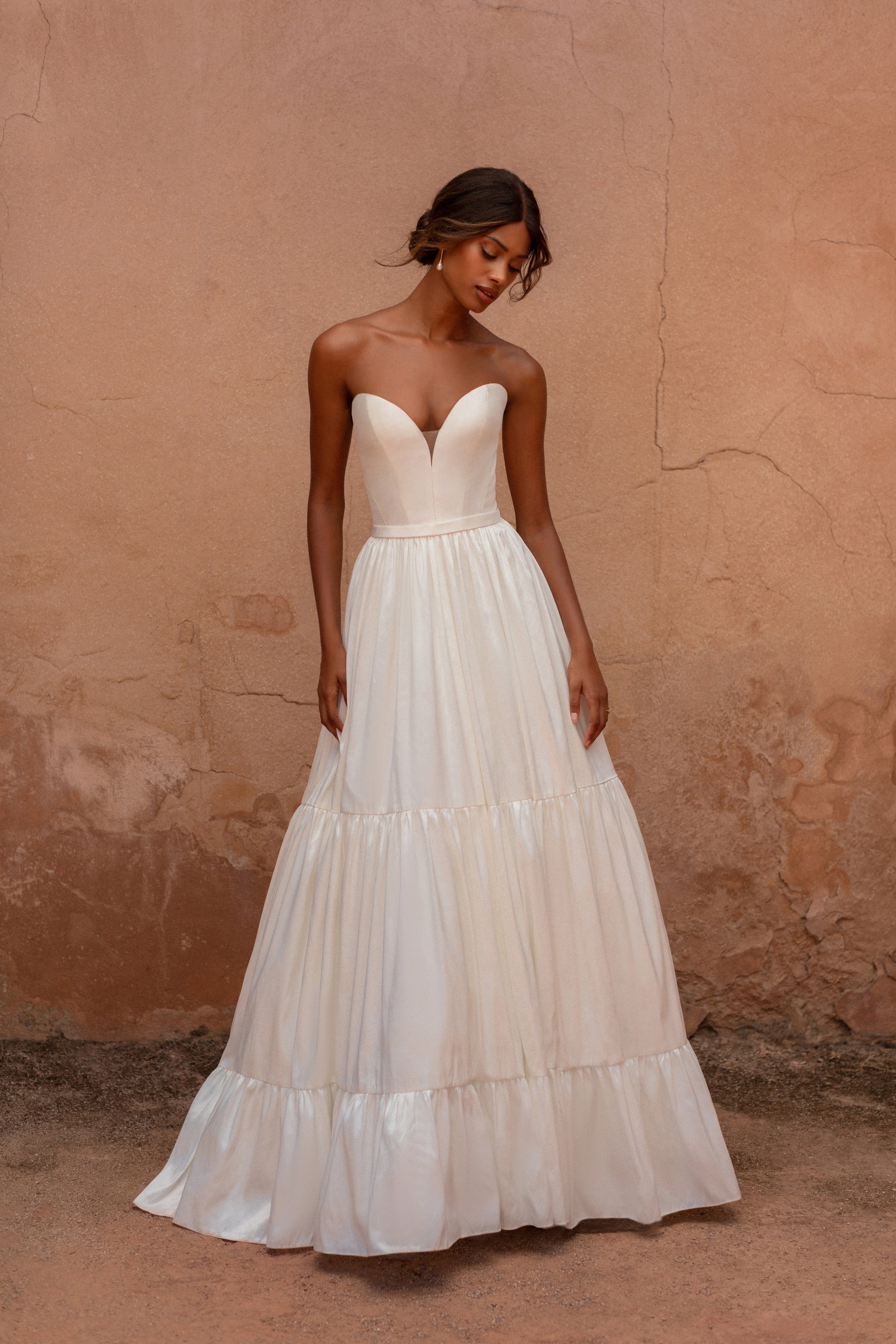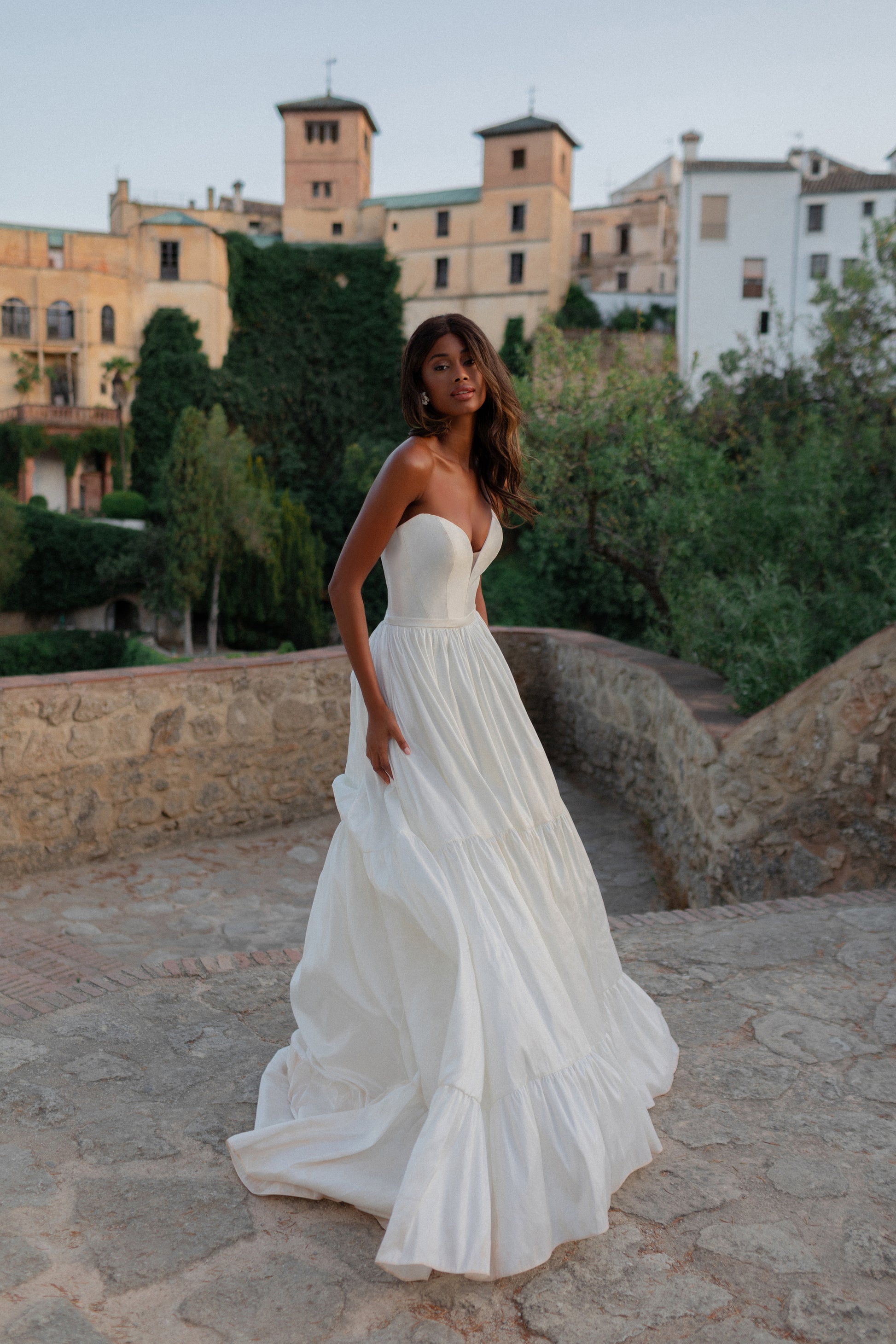 The Vivien draws its inspiration from vintage 19th century gowns, with a crisp, gleaming taffeta framing the tiered A-line skirt and strapless sweetheart bodice.