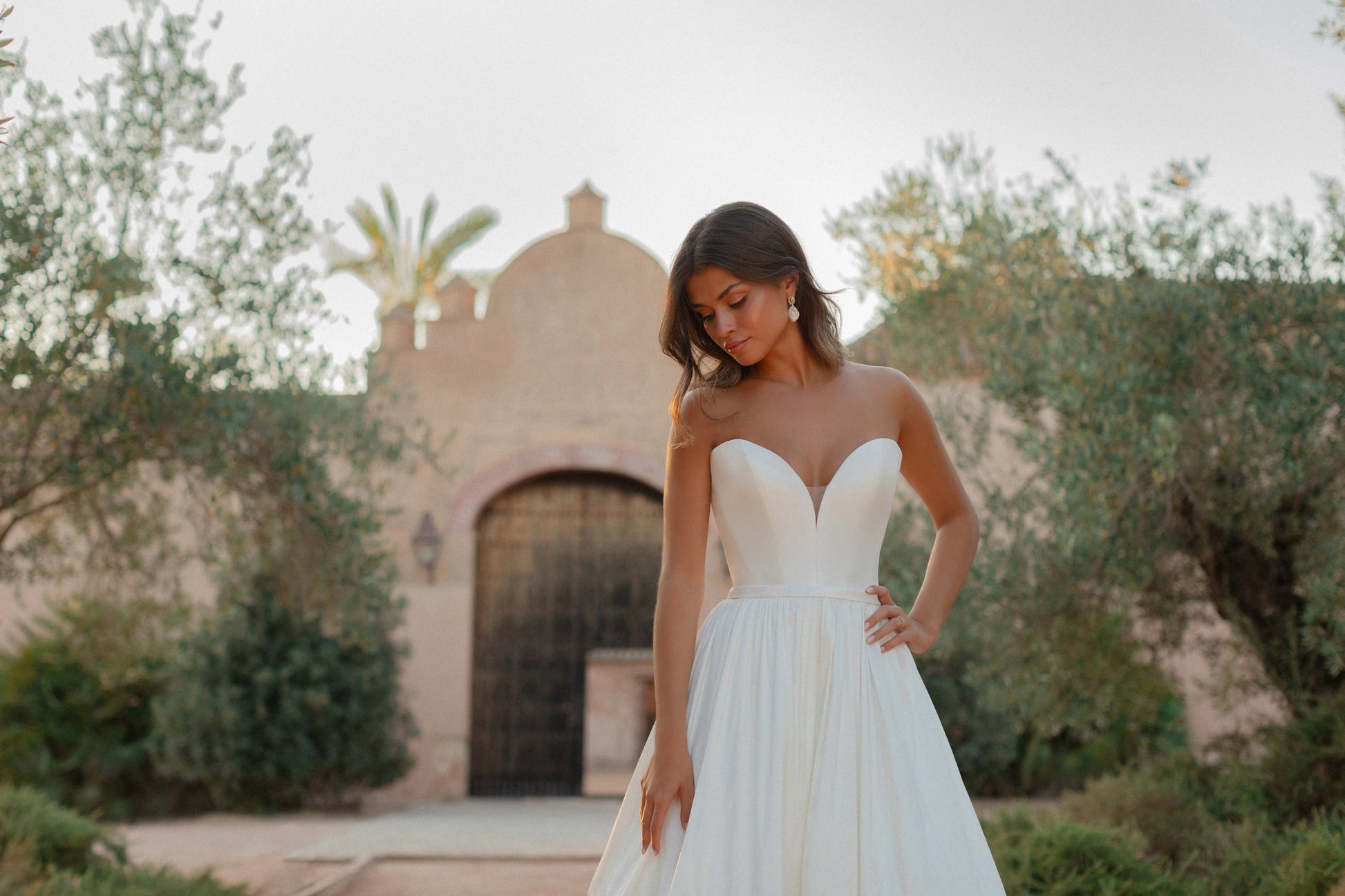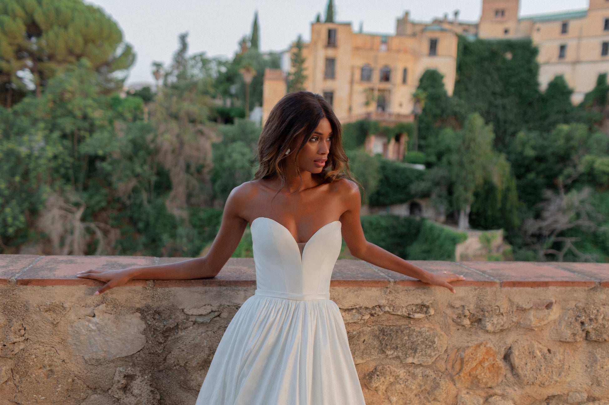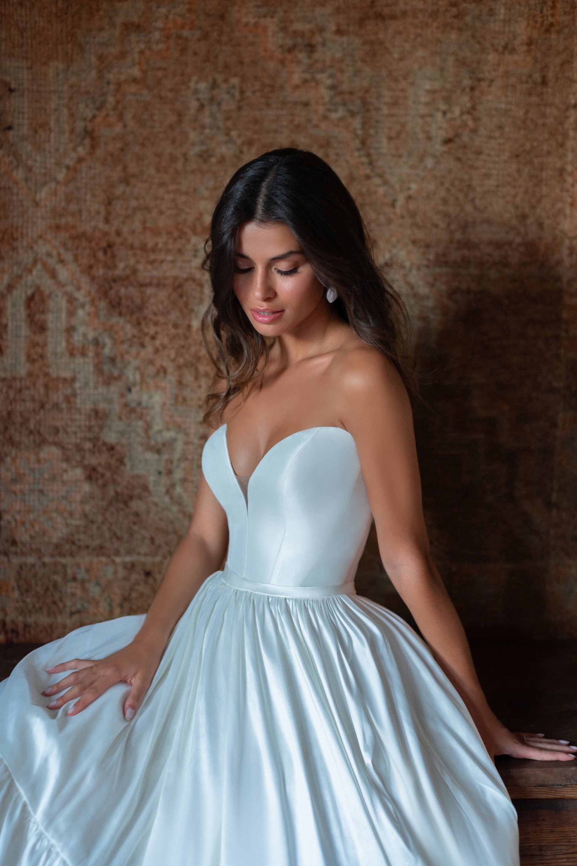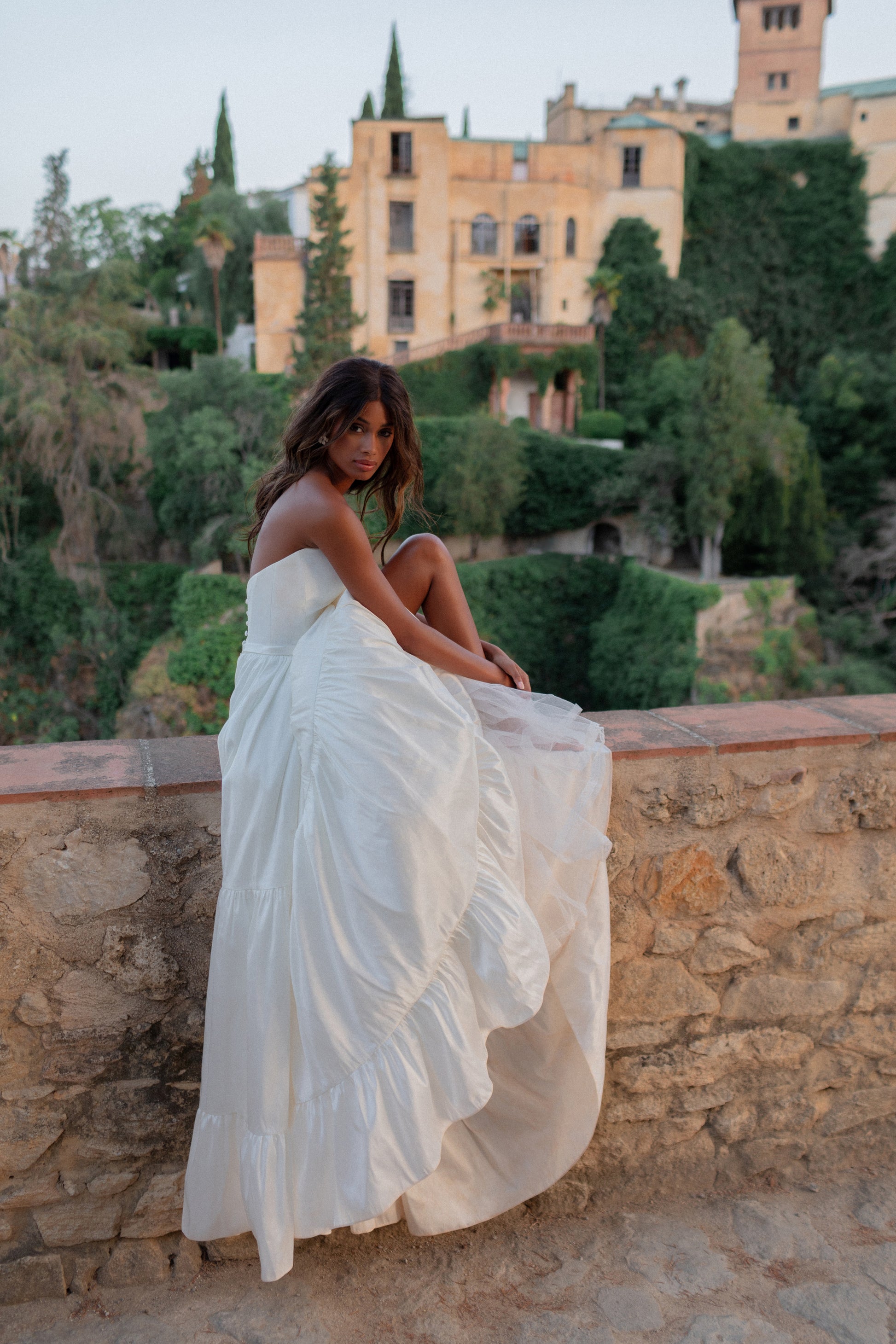 The Vivien draws its inspiration from vintage 19th century gowns, with a crisp, gleaming taffeta framing the tiered A-line skirt and strapless sweetheart bodice.