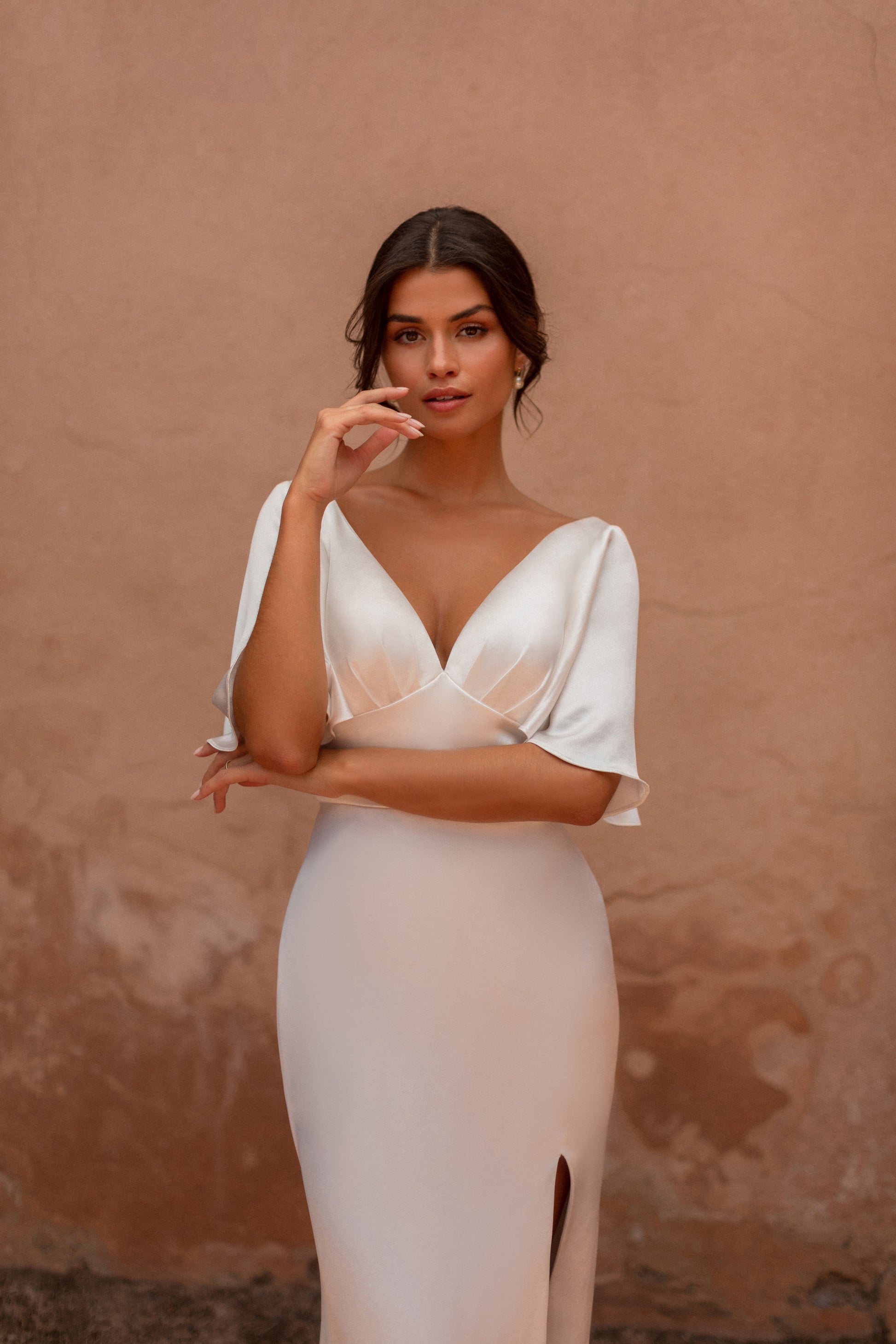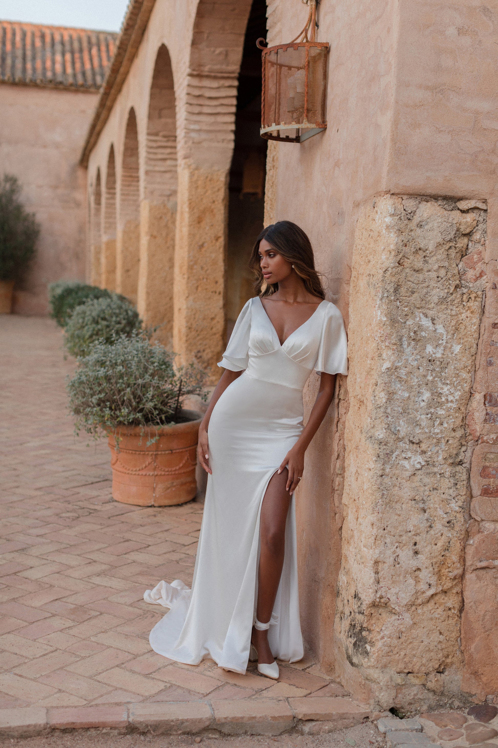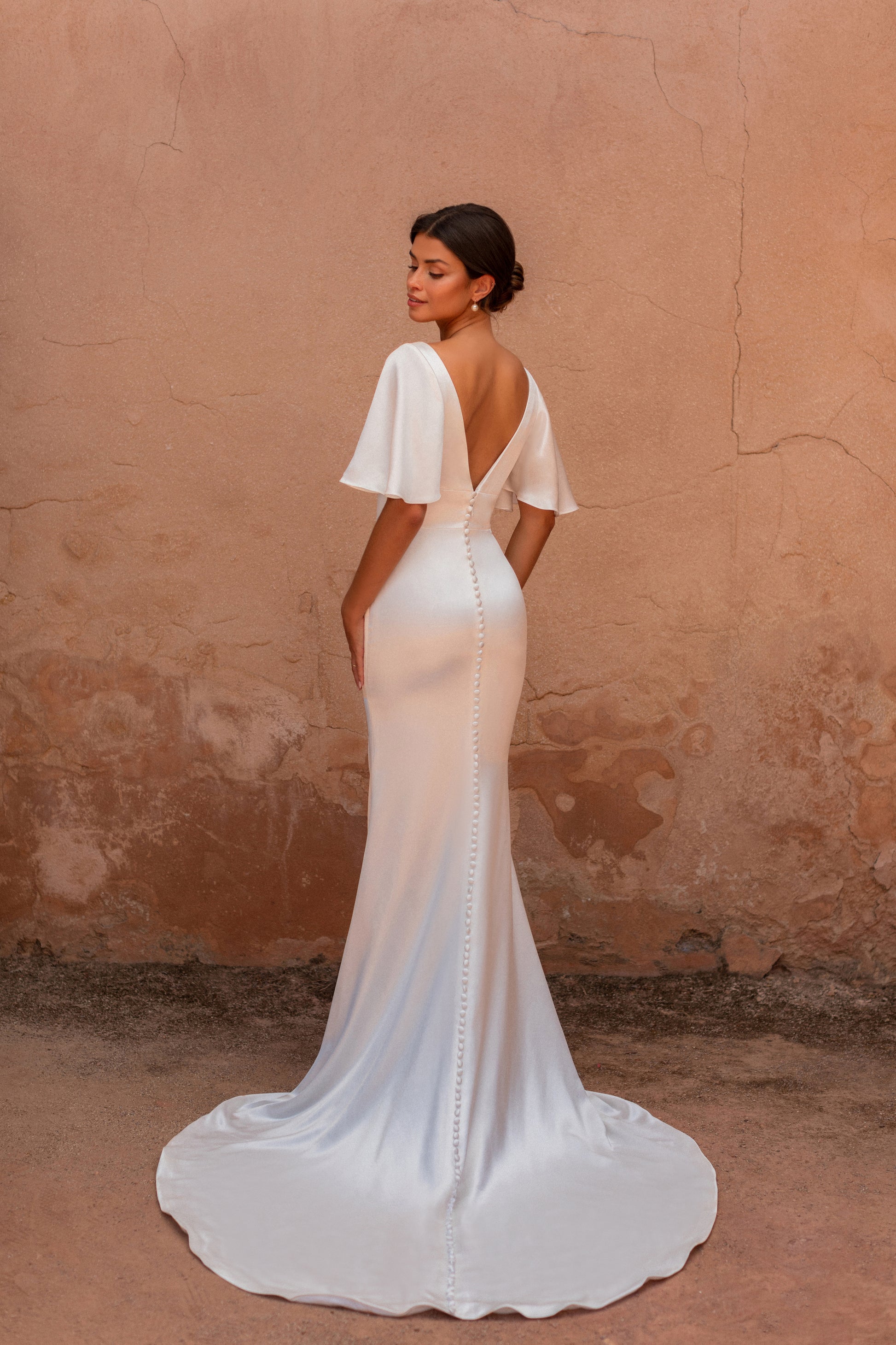 The Marilyn features luminous stretch satin, topped with an elbow-length flutter sleeve and covered buttons down the train.
