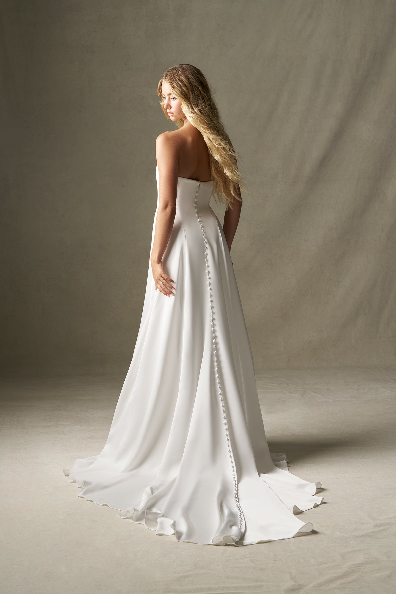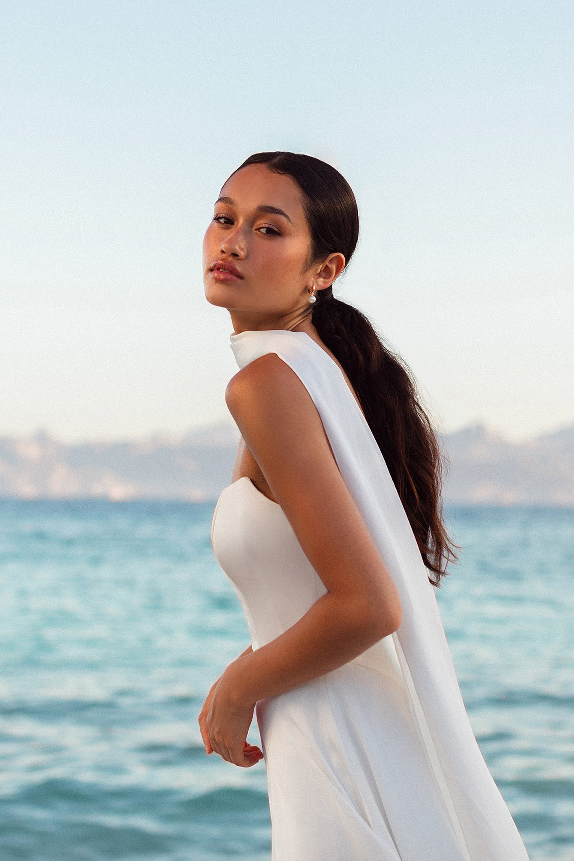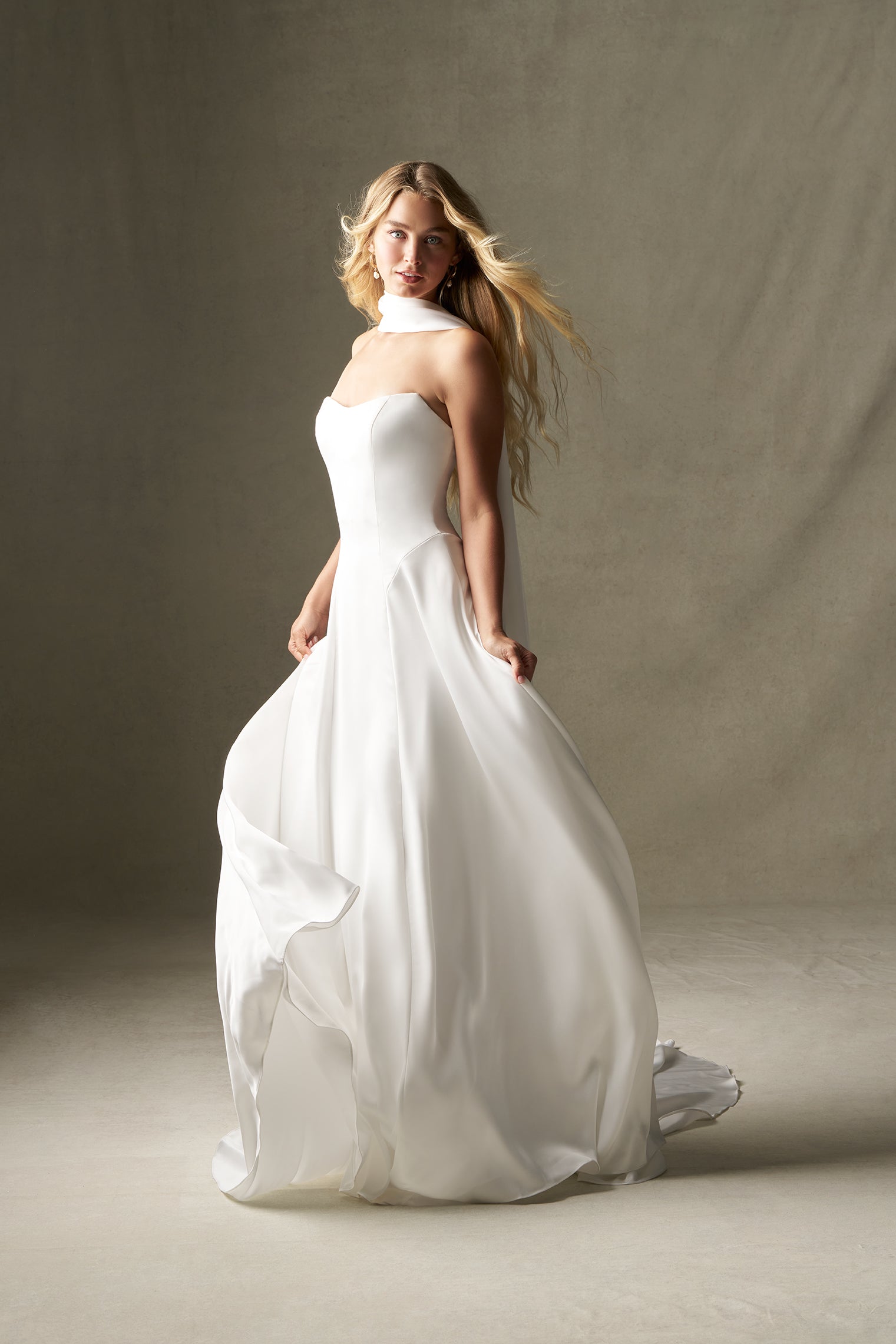 Brisa embodies effortless elegance with a satin A-line silhouette. Intentional seamwork shapes the flowing skirt, while a strapless cateye neckline adds a modern touch. The included scarf in matching fabric offers versatile styling, completing this simple yet ethereal bridal look.