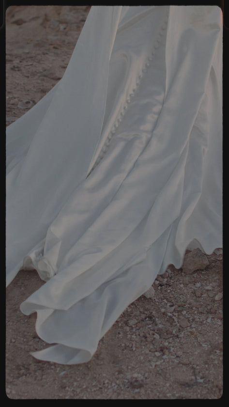 The Playa skirt offers a minimal yet fashion-forward design, featuring a fit-and-flare silhouette with fabric-covered buttons trailing down the train. Crafted to pair seamlessly with the Playa bodice, it creates a cohesive, modern bridal look that is effortlessly elegant.