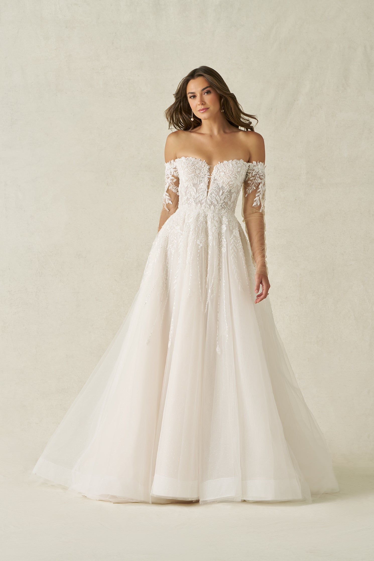 Radiant and romantic, this strapless ballgown features sequin and bugle-beaded lace appliques accented with silver stitching over layers of glitter tulle. The fitted bodice glimmers softly in the light, balanced by a voluminous skirt that moves with airy grace. Designed with a natural waistline, this gown captures Allure’s signature blend of texture and sparkle. Pair with Sleeves Style A1418SL, sold separately, for a dramatic finishing touch. Read Less