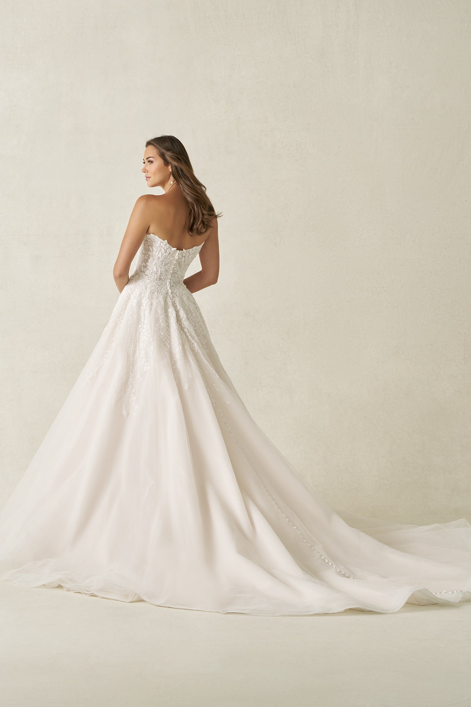 Radiant and romantic, this strapless ballgown features sequin and bugle-beaded lace appliques accented with silver stitching over layers of glitter tulle. The fitted bodice glimmers softly in the light, balanced by a voluminous skirt that moves with airy grace. Designed with a natural w... Read More