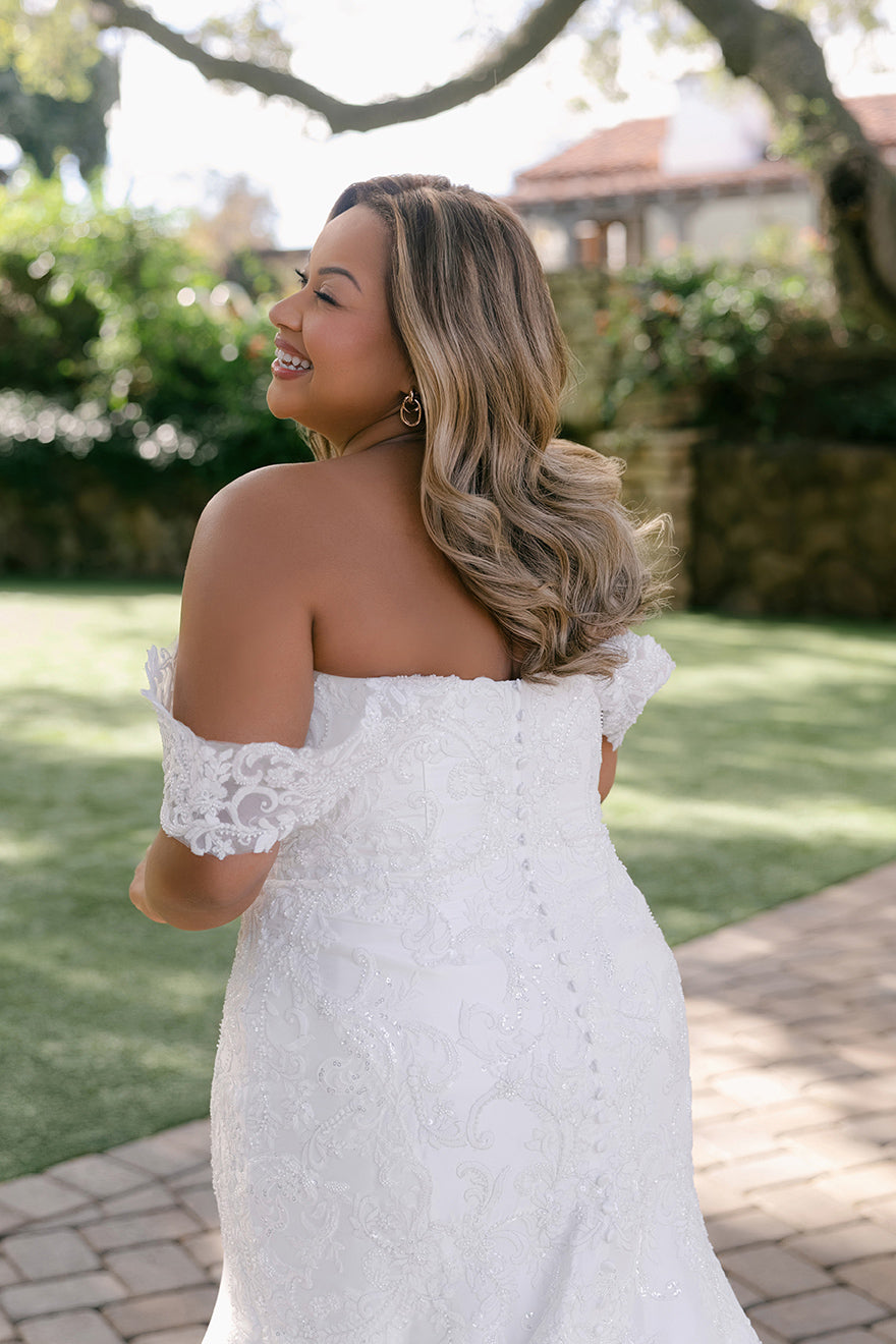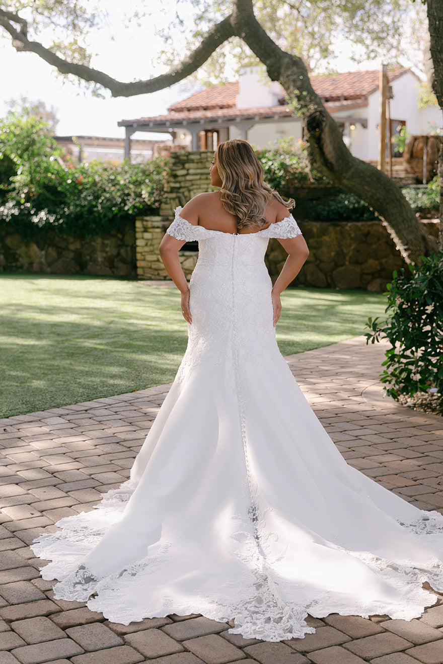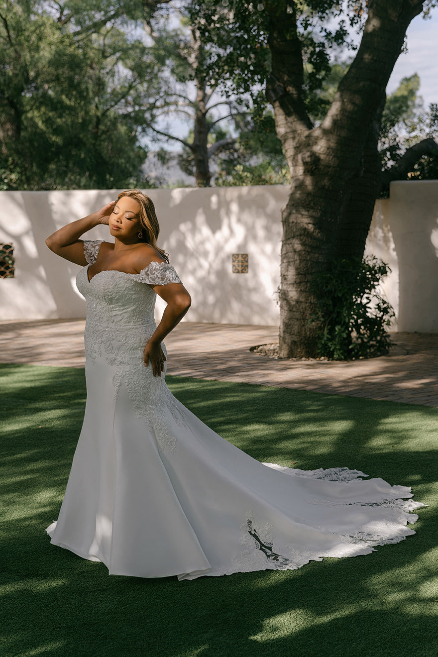Contrasting pearlescent Mikado and lace appliques adorn this plus size wedding gown, highlighting the gown's gorgeous fit and flare silhouette.