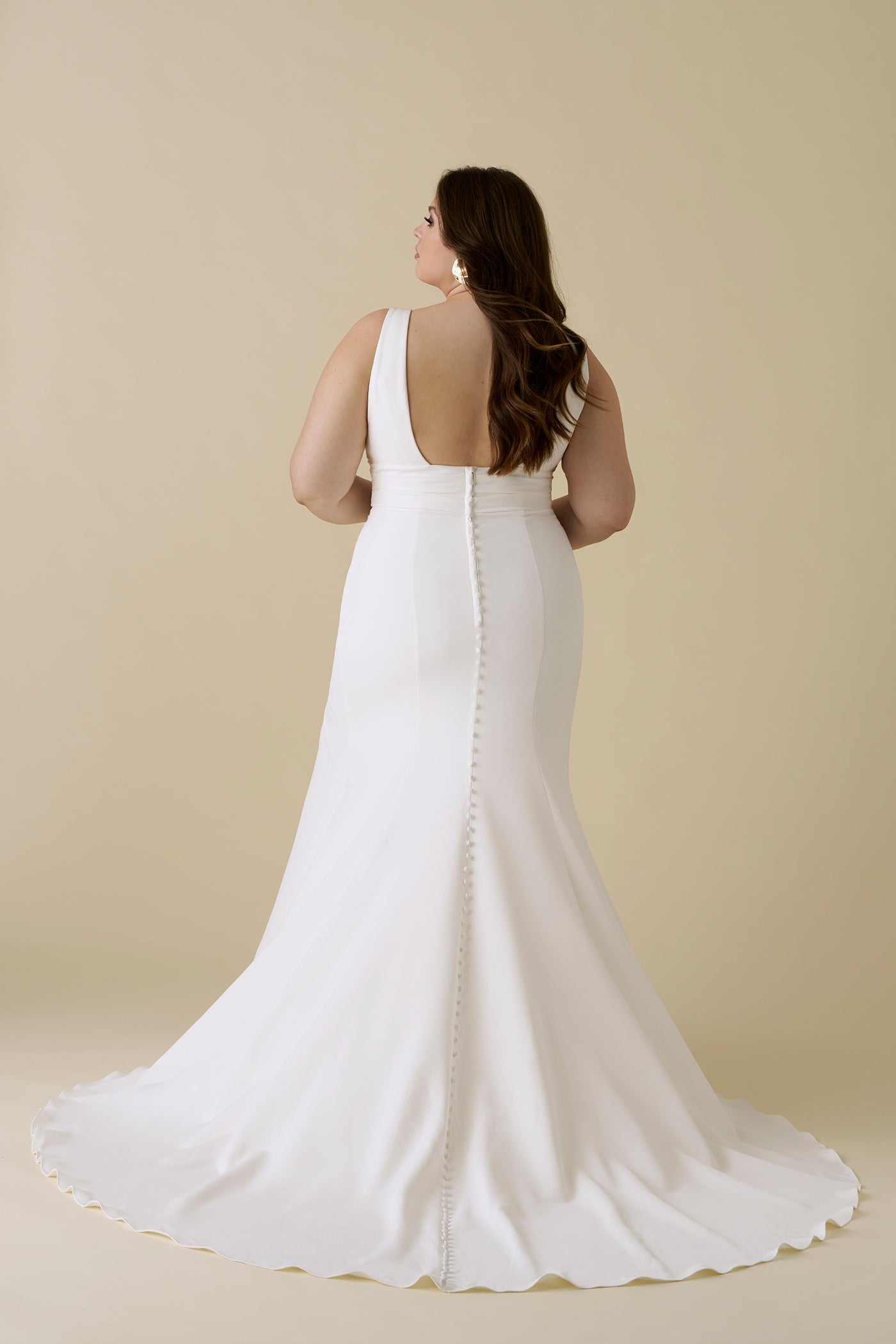 Bold and sculpted, this stretch crepe sheath gown features a plunging V-neckline and flattering asymmetrical draping through the bodice. A daring thigh-high slit adds movement and edge, while the square open back offers clean structure, finished with covered buttons trailing down the train. Read Less