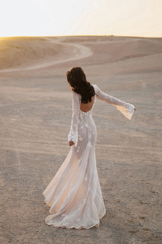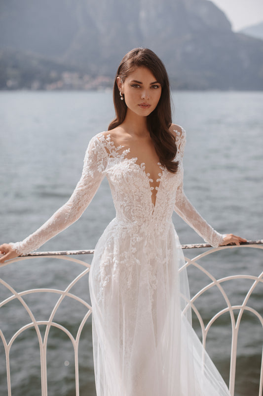 Andreia features a myriad of textures and details, her beaded applique and dimensional lace florals overlaying the tulle sheath, accented with a statement back and long sleeves.