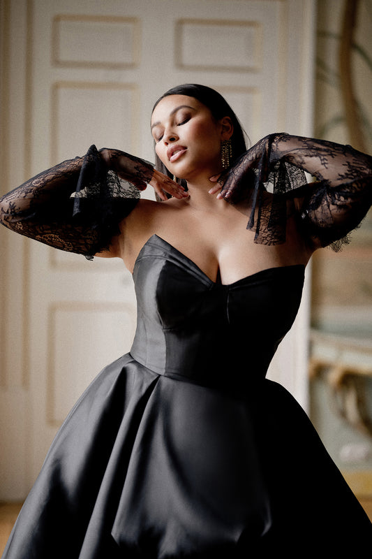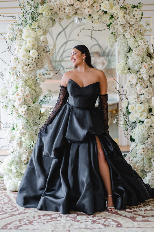 A sculpted, strapless bodice lends texture, balance, and structure to the full Mikado skirt of our Portia ballgown. A detachable puffed sleeve is an elegant additonal touch.