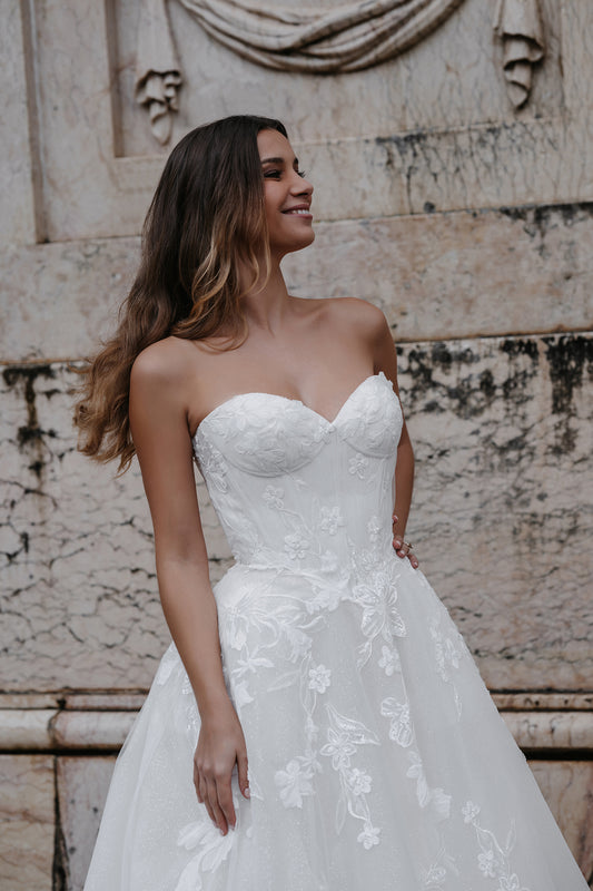 Benedita's sparkling A-line tulle skirt is topped with a strapless, sweetheart bodice featuring beaded lace appliques.