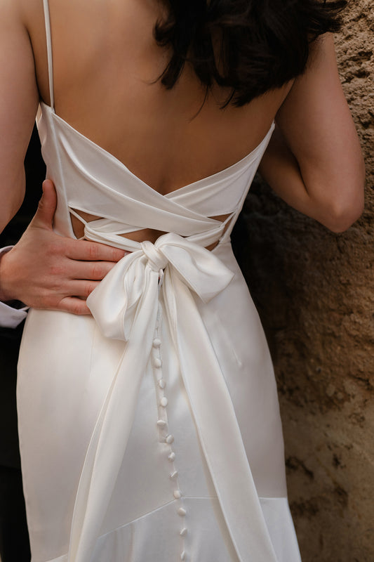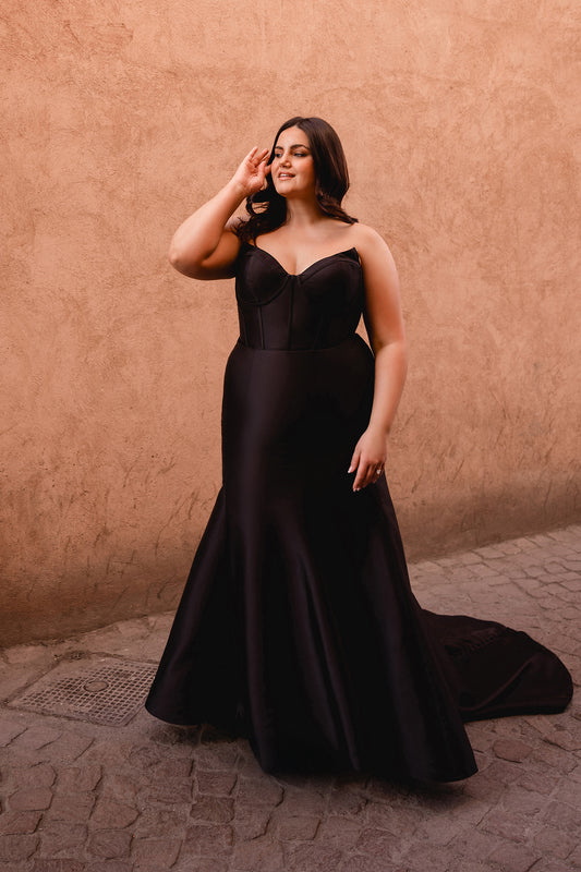 Deceptively simple in silhouette, the Fatima gown drapes beautifully along its stretch satin neckline and is further accented by a corset-inspired tie back.
