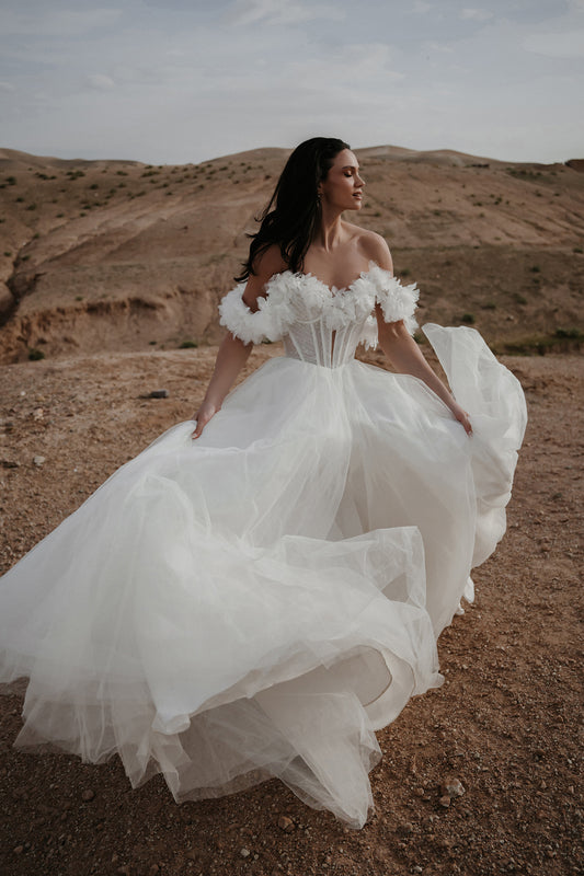 For the romantic maximalist: the Vianna gown, which is adorned with a sequined tulle bodice and petal-effect bordot detailed neckline and off-shoulder sleevelets.