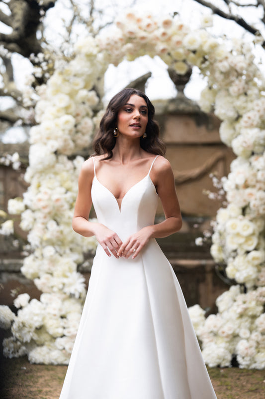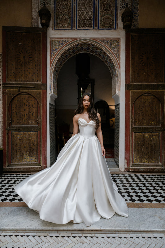 Available in both Mikado and satin, the luxurious simplicity of the Ana ballgown is found in its captivating, luxe texture, along with the thoughtful lines of the gown's neckline and bodice.