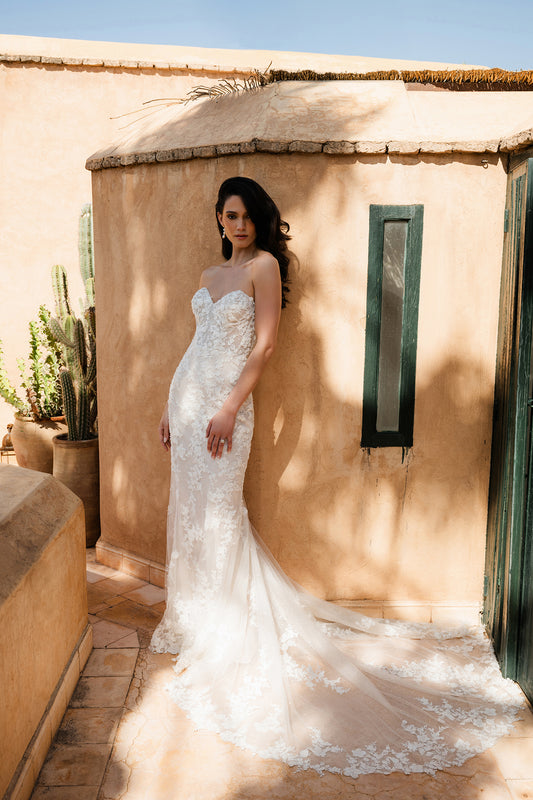 Sweet eyelash lace trims Maria's strapless sweetheart corded lace bodice, while a sarong-style crepe sheath skirt finishes the look.