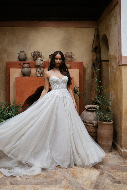 Ethereal Callisto is a strapless, A-line bridal gown with endless appeal, from sequined tulle to appliqued dimensional lace blossoms.