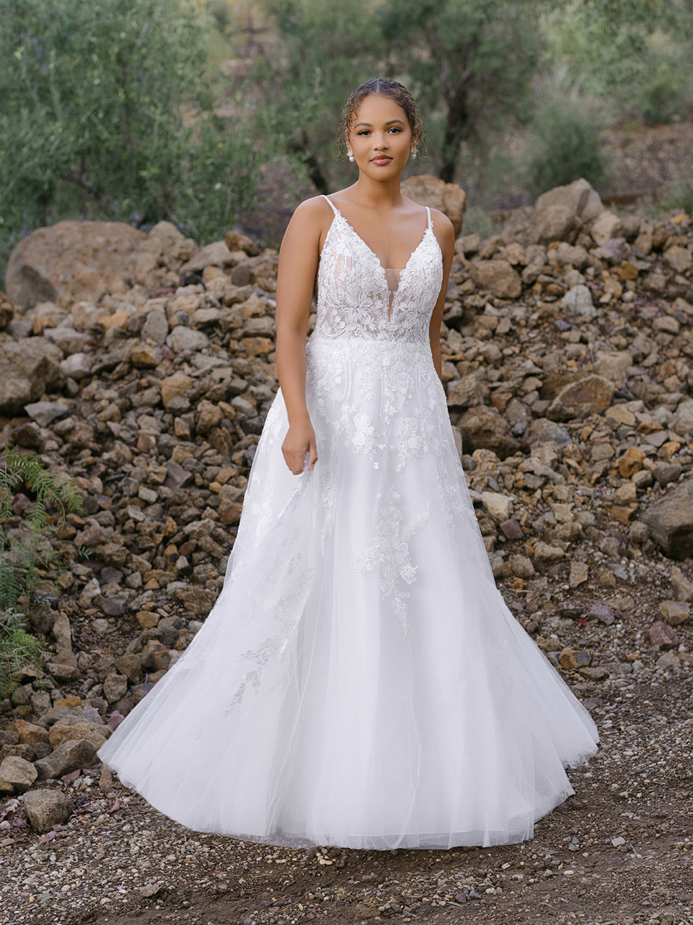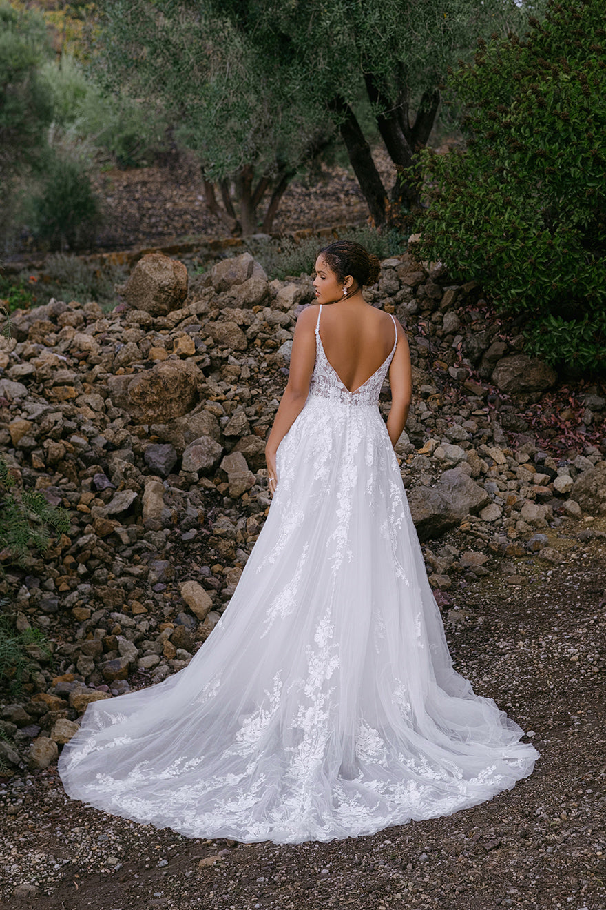 The loveliest bouquets of flowers sprinkle across the skirt and train of this A-line gown.