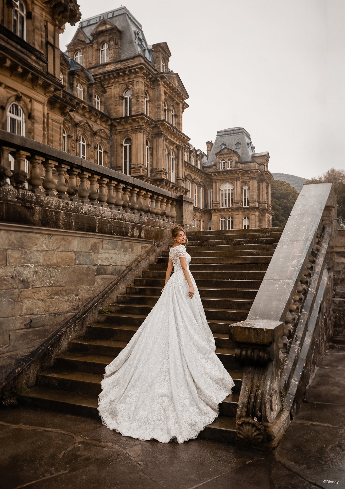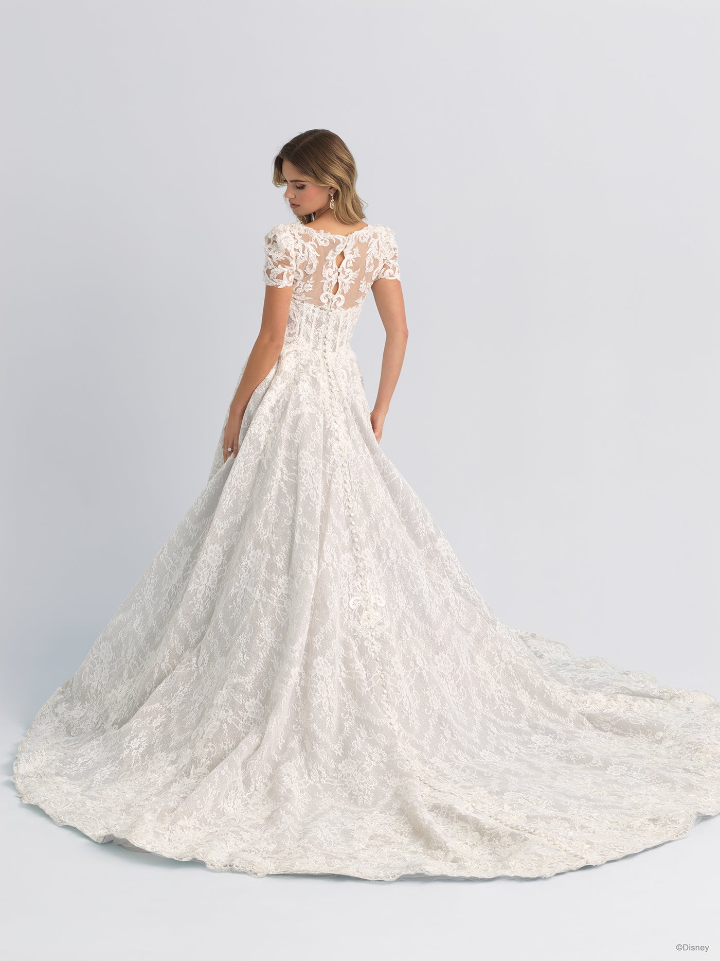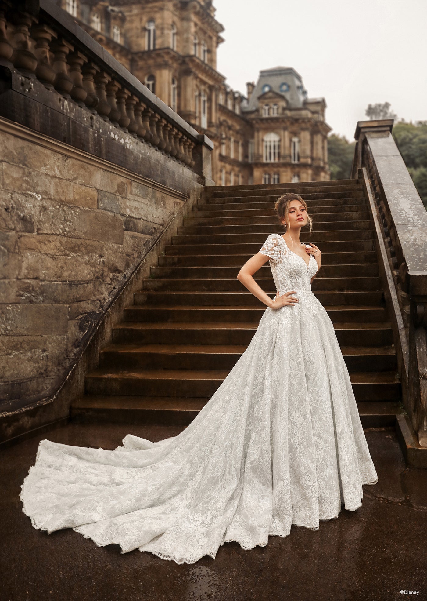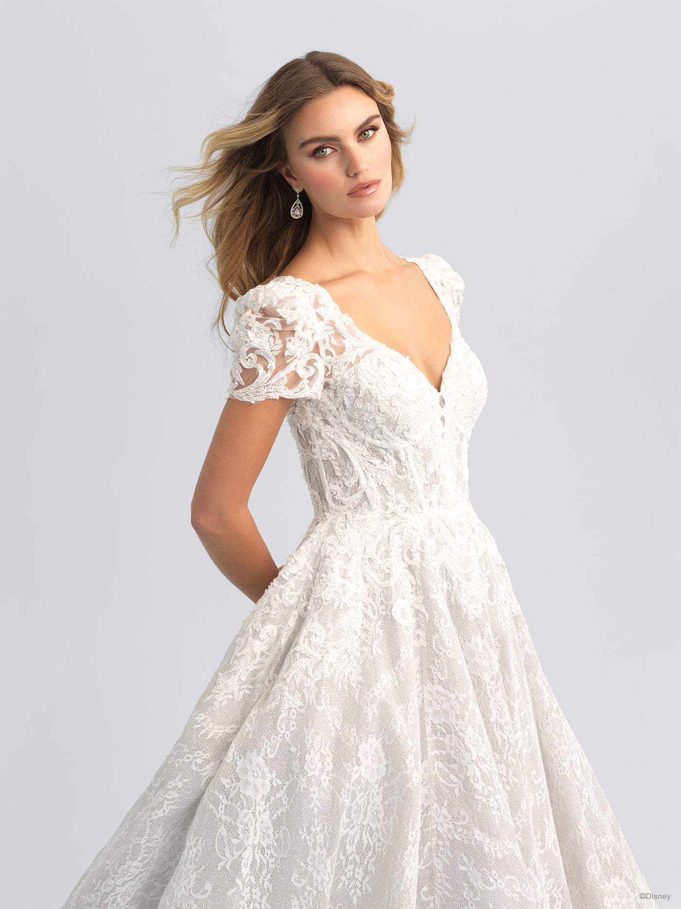Shimmering, lace appliques add texture and richness to the ivory lace of this lovely ballgown, inspired by Disney's Cinderella. The gown also features translucent lace cap sleeves and a soft sweetheart neckline across the bodice. Shown with matching veil DV33, sold separately.