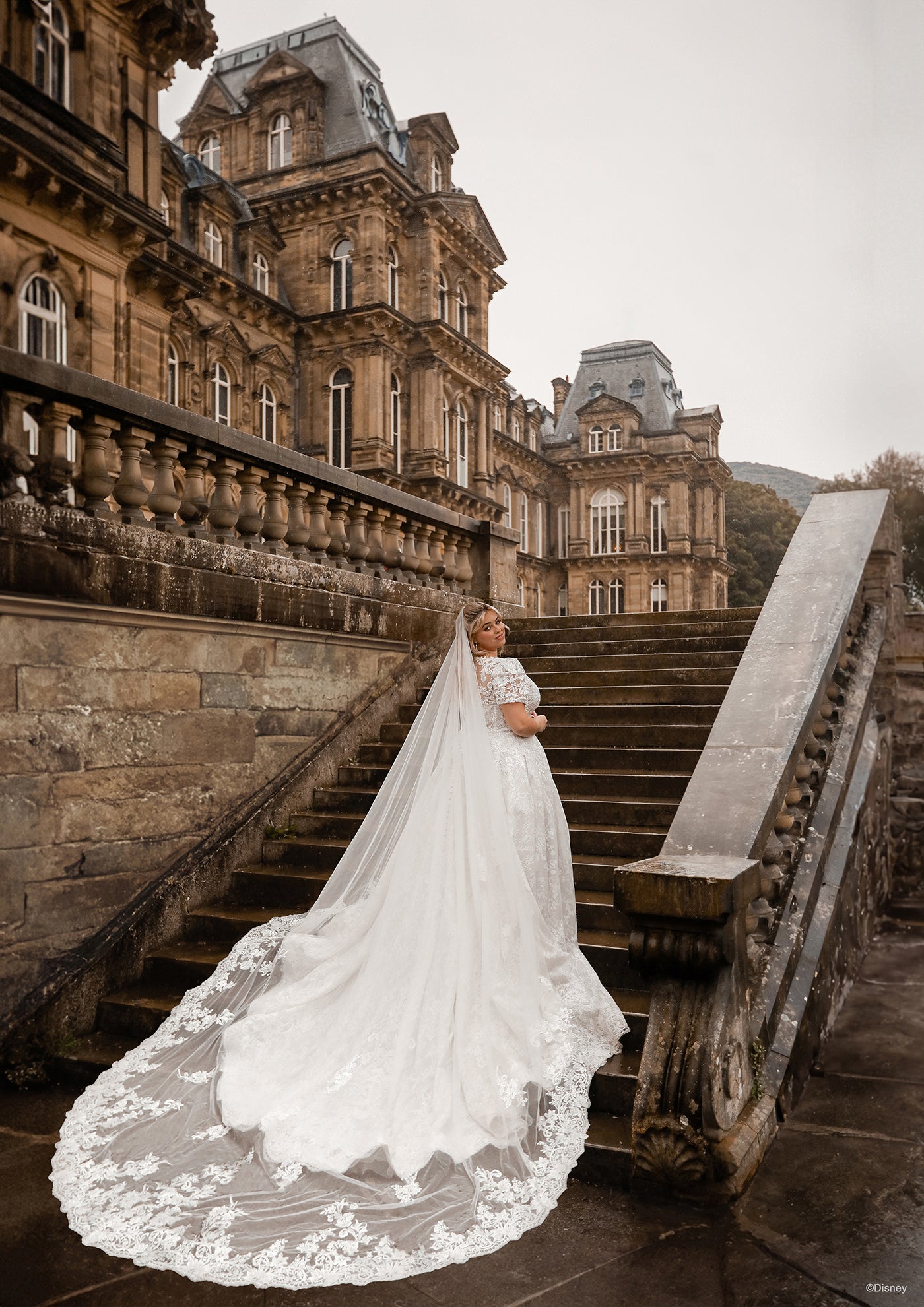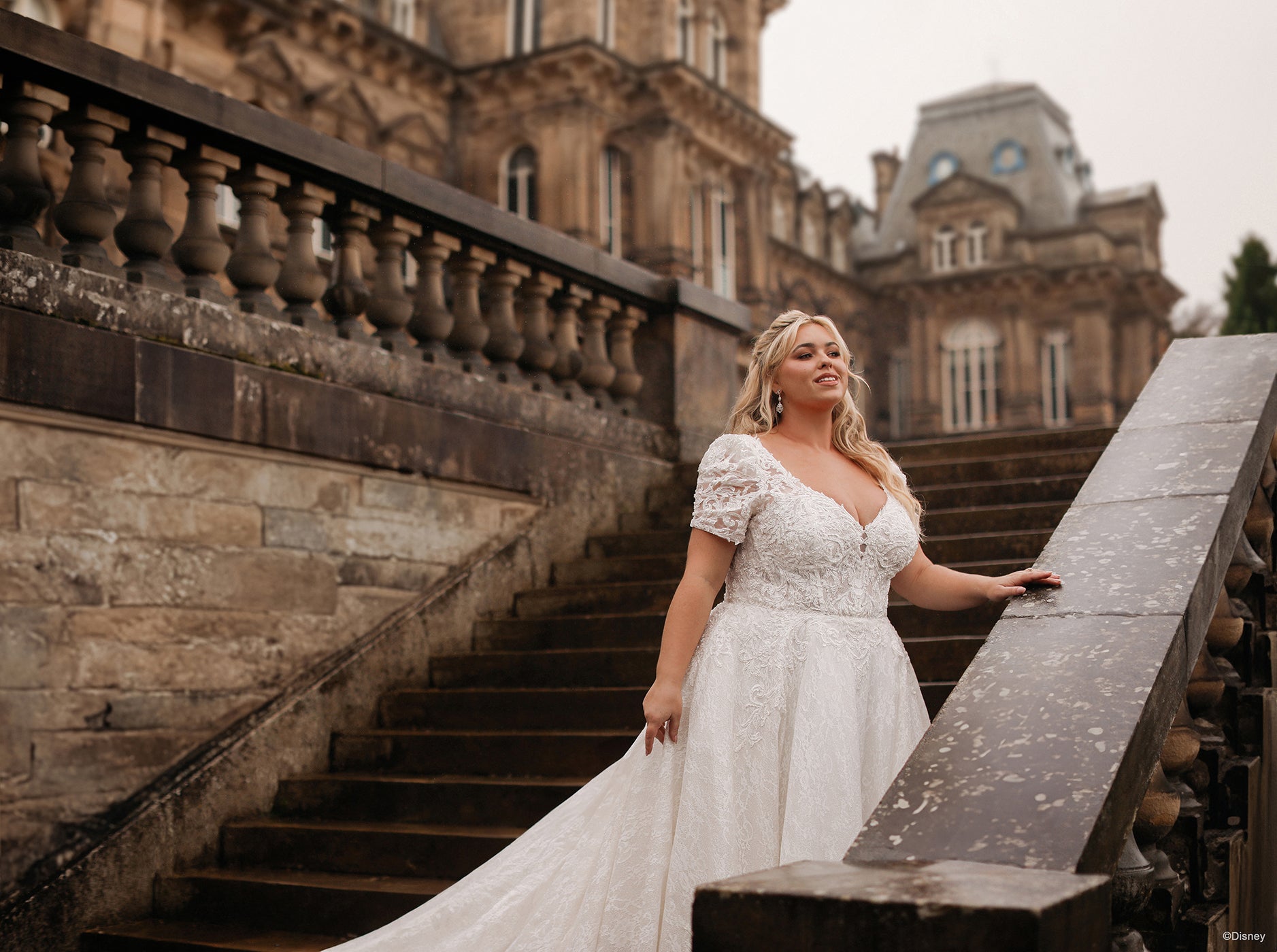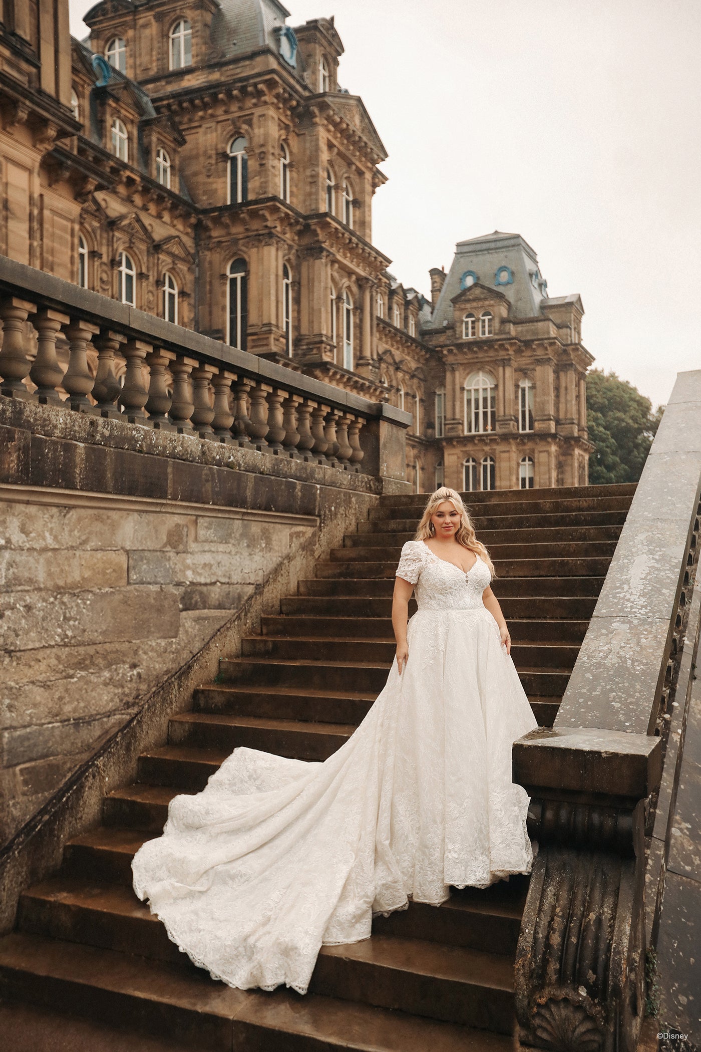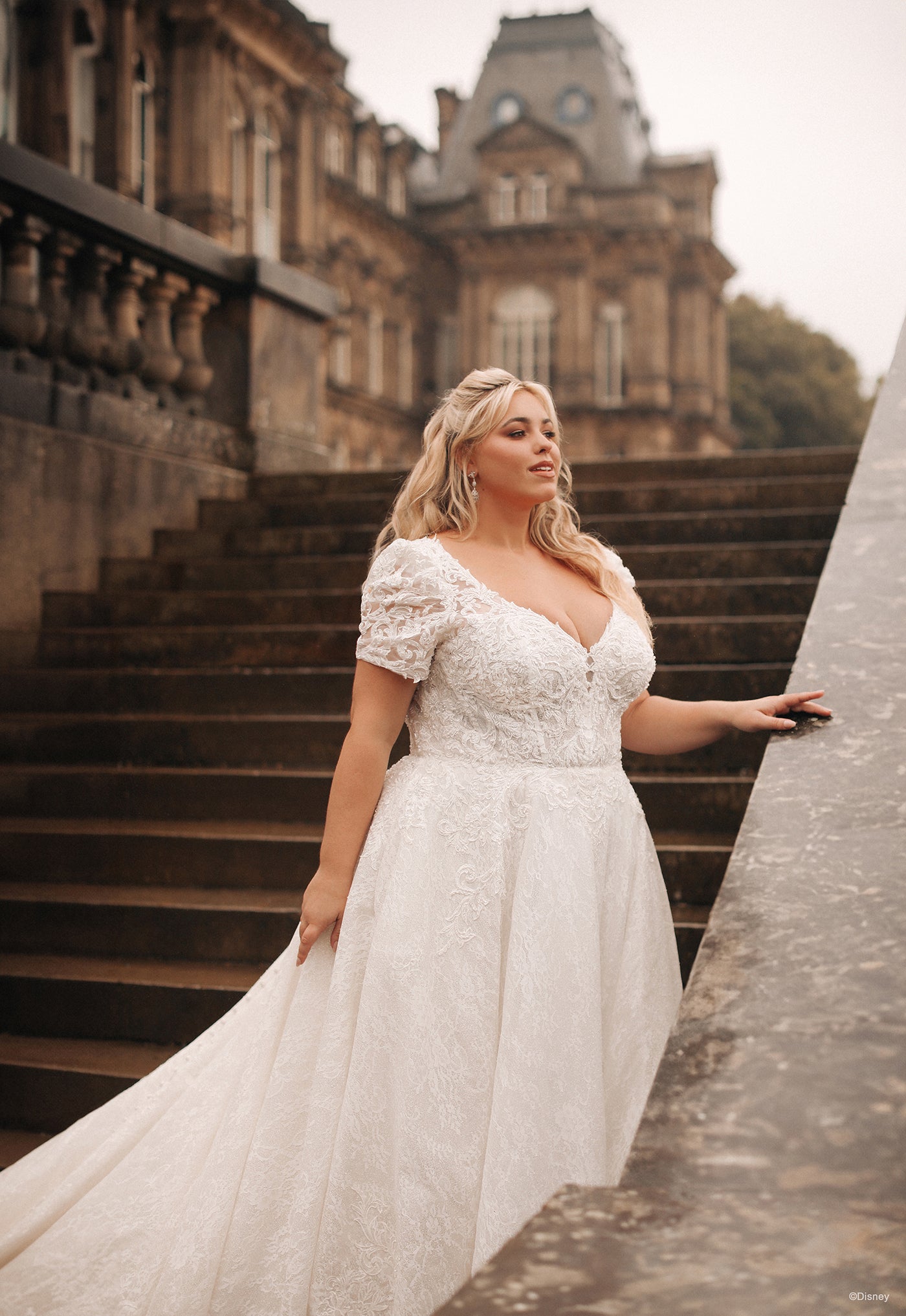 Shimmering, lace appliques add texture and richness to the ivory lace of this lovely ballgown, inspired by Disney's Cinderella. The gown also features translucent lace cap sleeves and a soft sweetheart neckline across the bodice. Shown with matching veil DV33, sold separately.