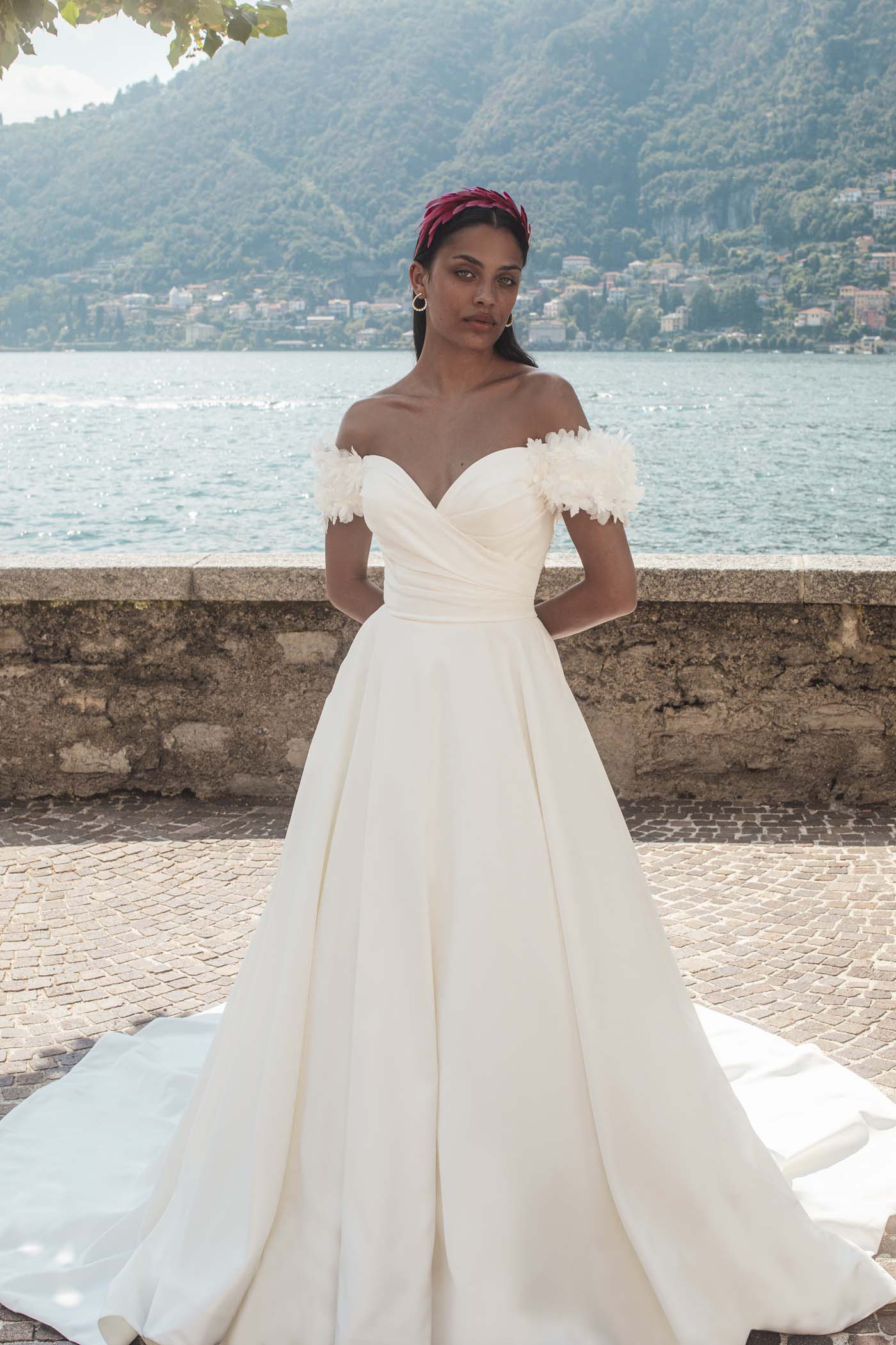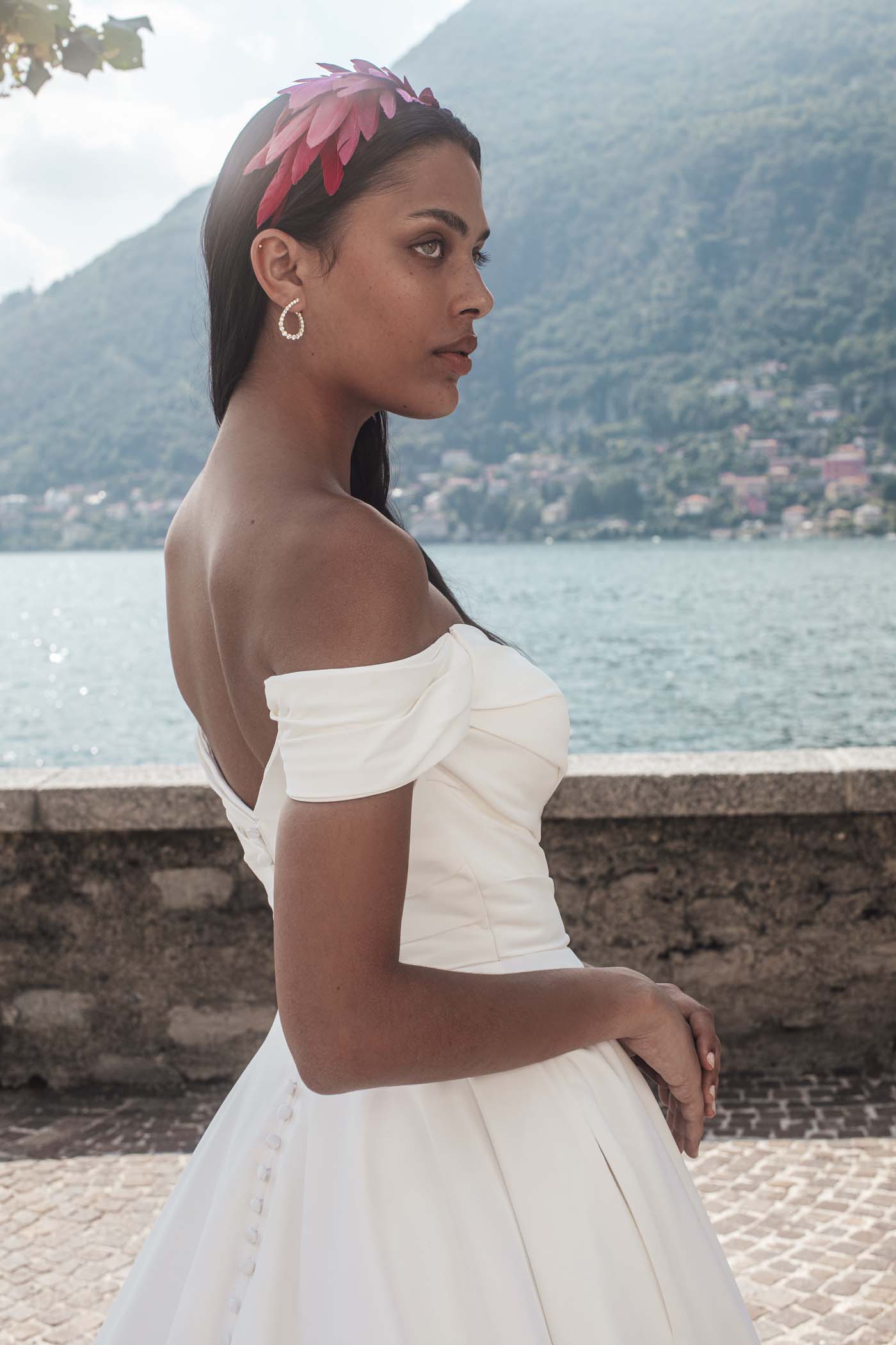 Create your bridal aesthetic with Honor's changeable off-shoulder straps — whether truly classic and minimalist in dove satin or chicly feminine with textured blossoms.