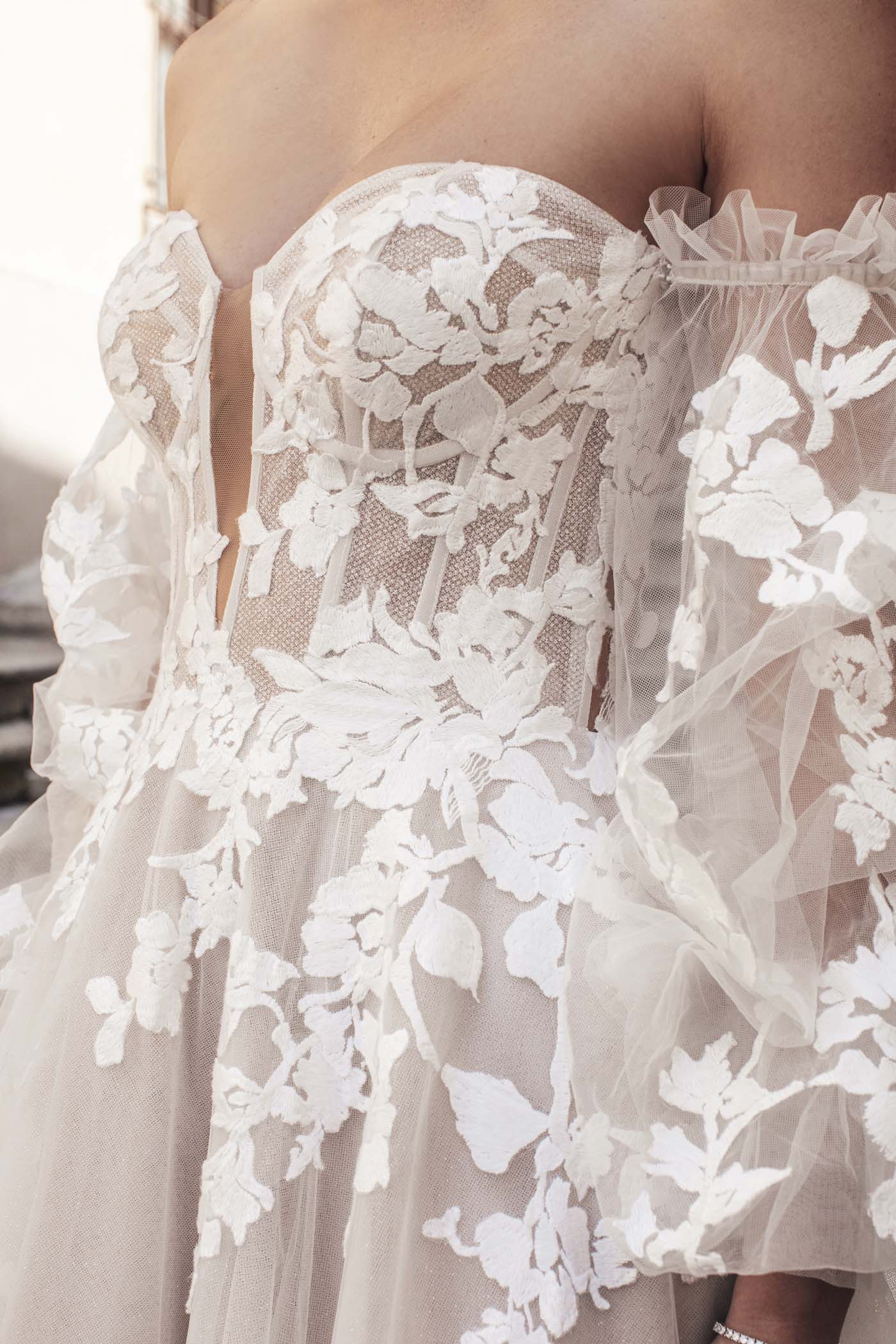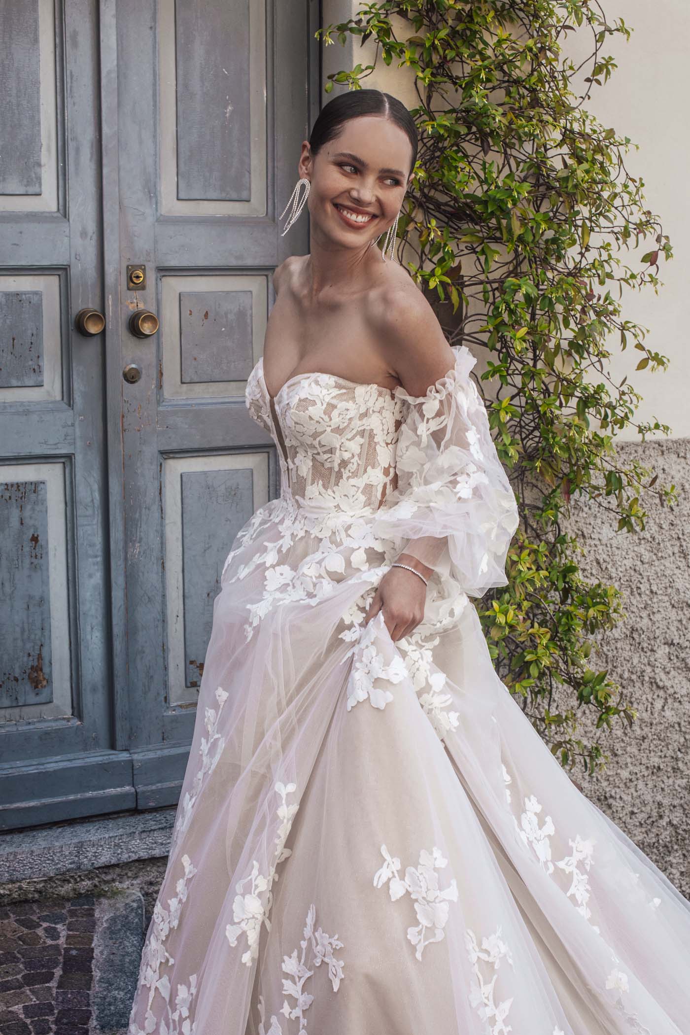 Detachable puffed tulle sleeves, designed with Harper in mind. Photographed with gown style MJ1005.