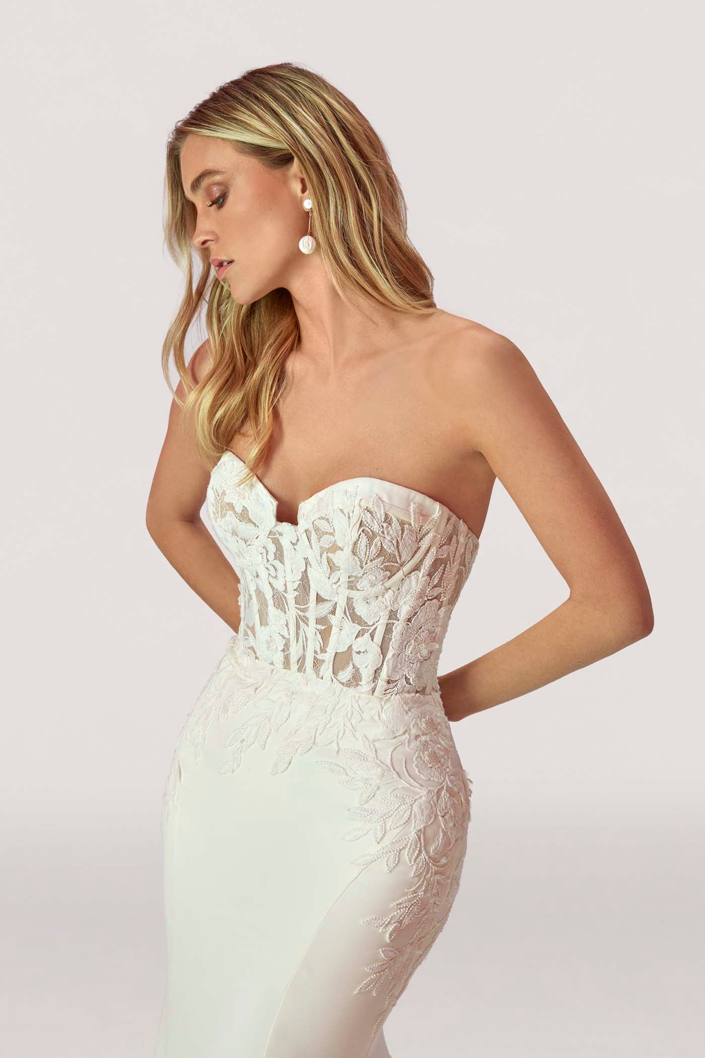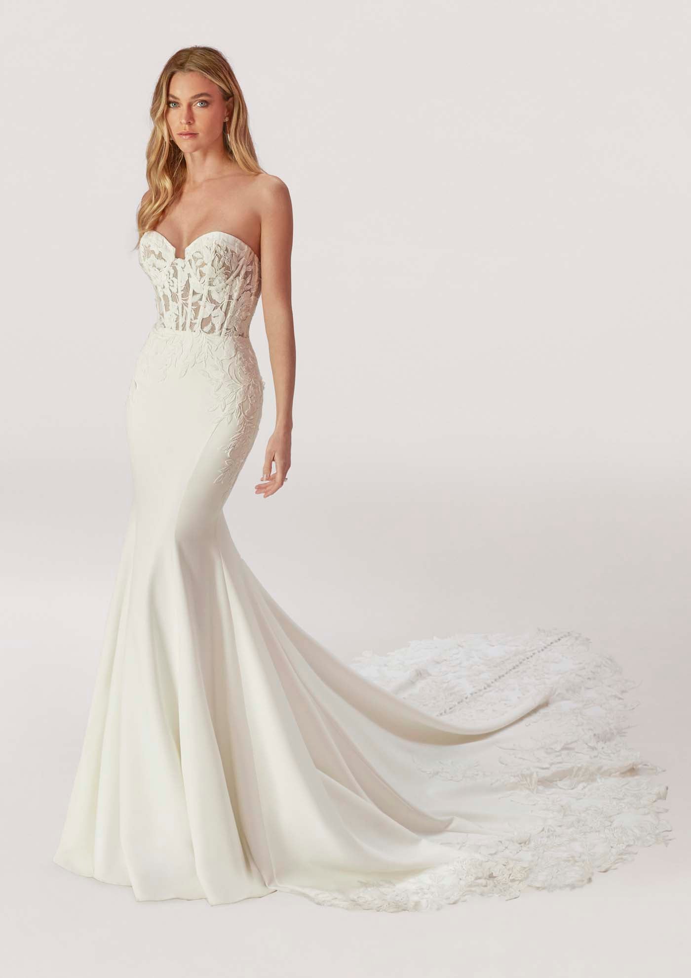 An appliqued illusion train adorns the Grayson gown, while the matte lace appliques also adorn the strapless bodice of this crepe gown.