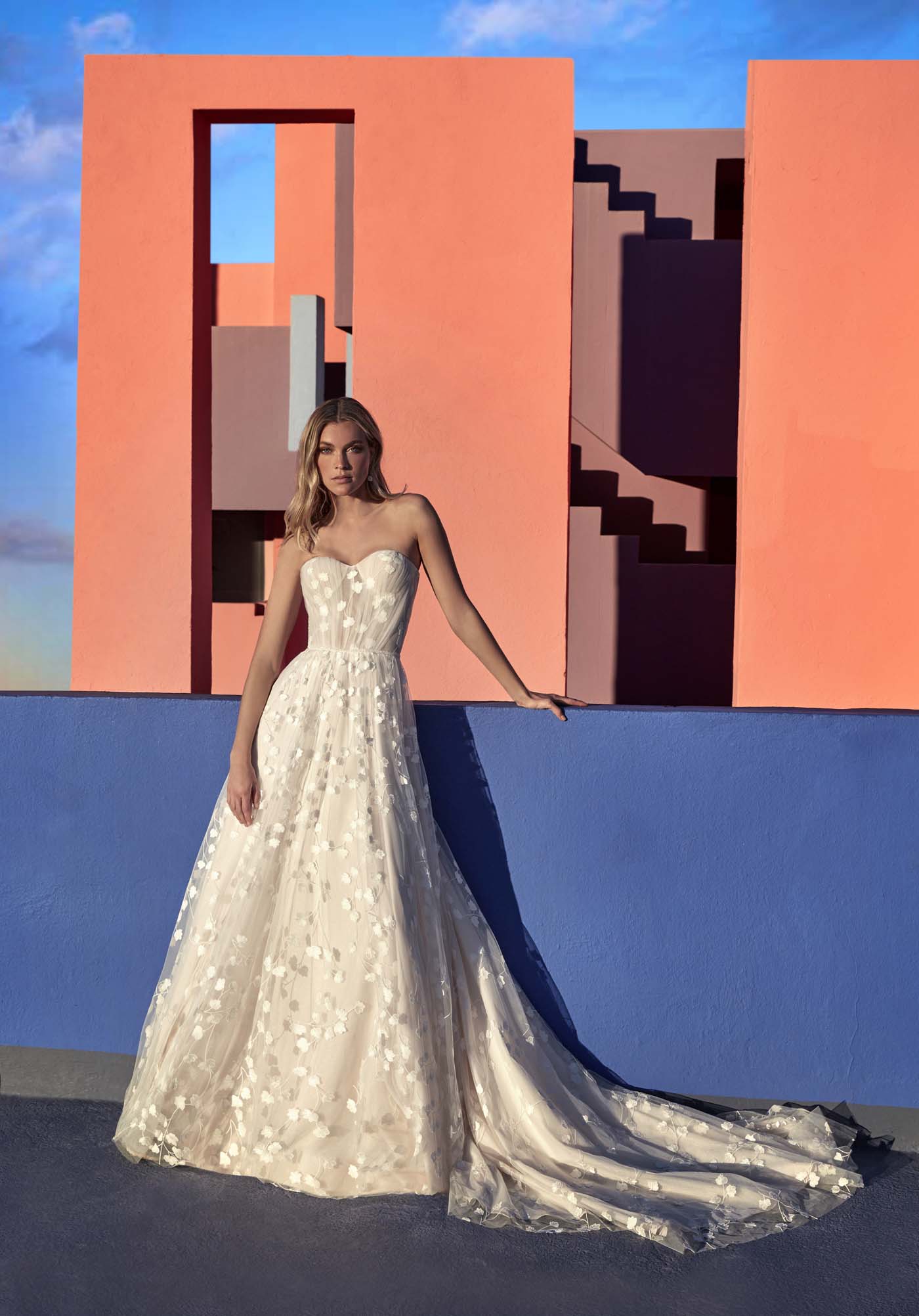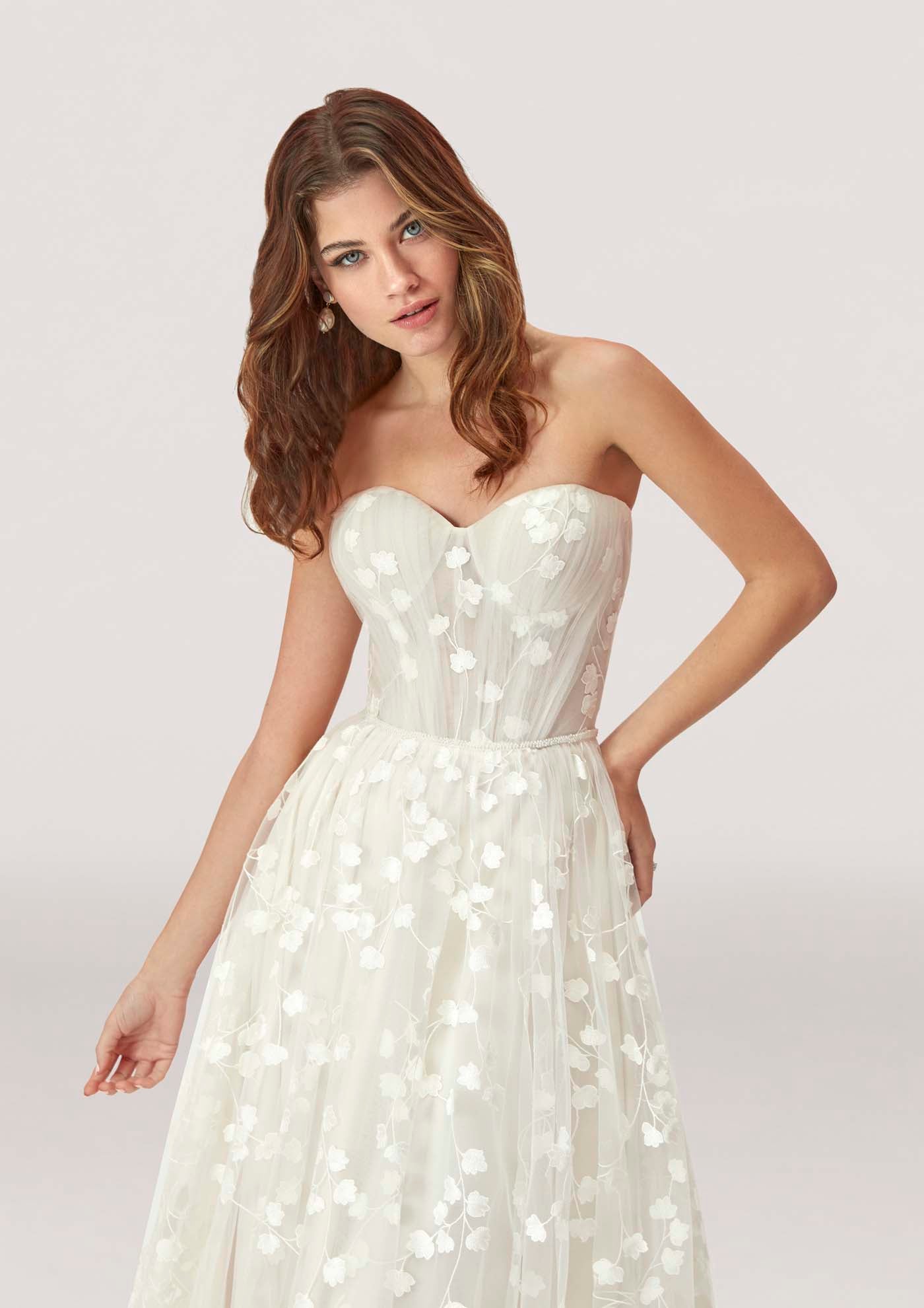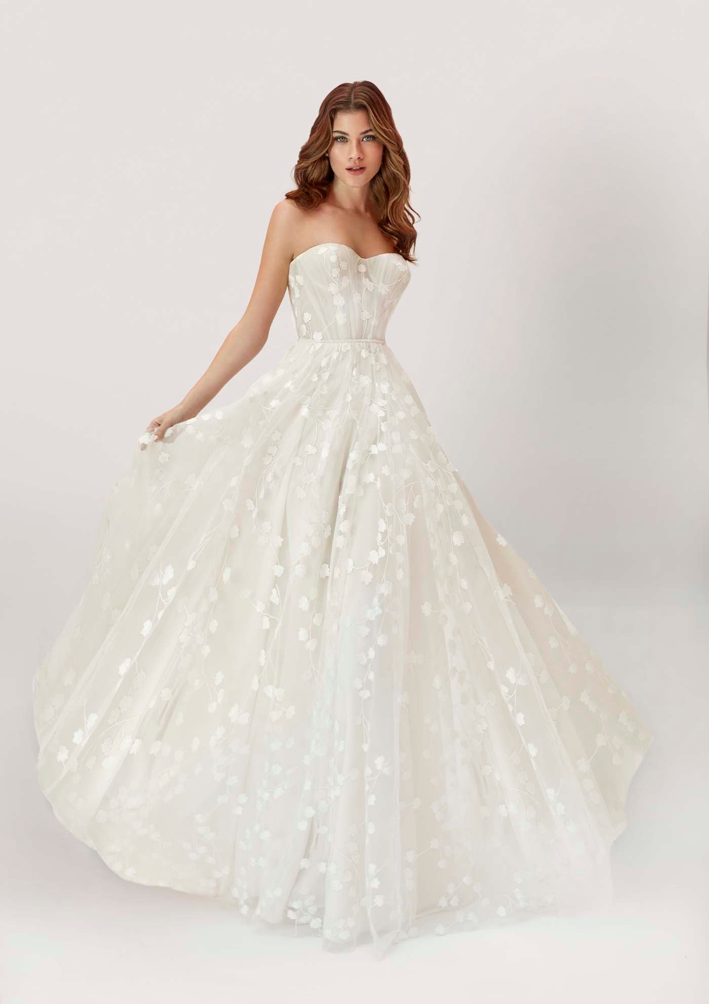 Introducing Gwen — a soft, strapless A-line silhouette composed of romantic sheet lace in a botanical motif, and finished with a subtly gethered tulle bodice.