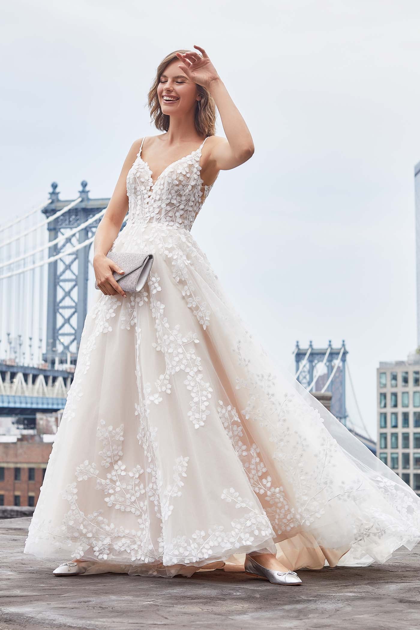 Sequined Chantilly lace and English net compose the elegant Josephine gown, finished with a full skirt and delicate spaghetti straps.