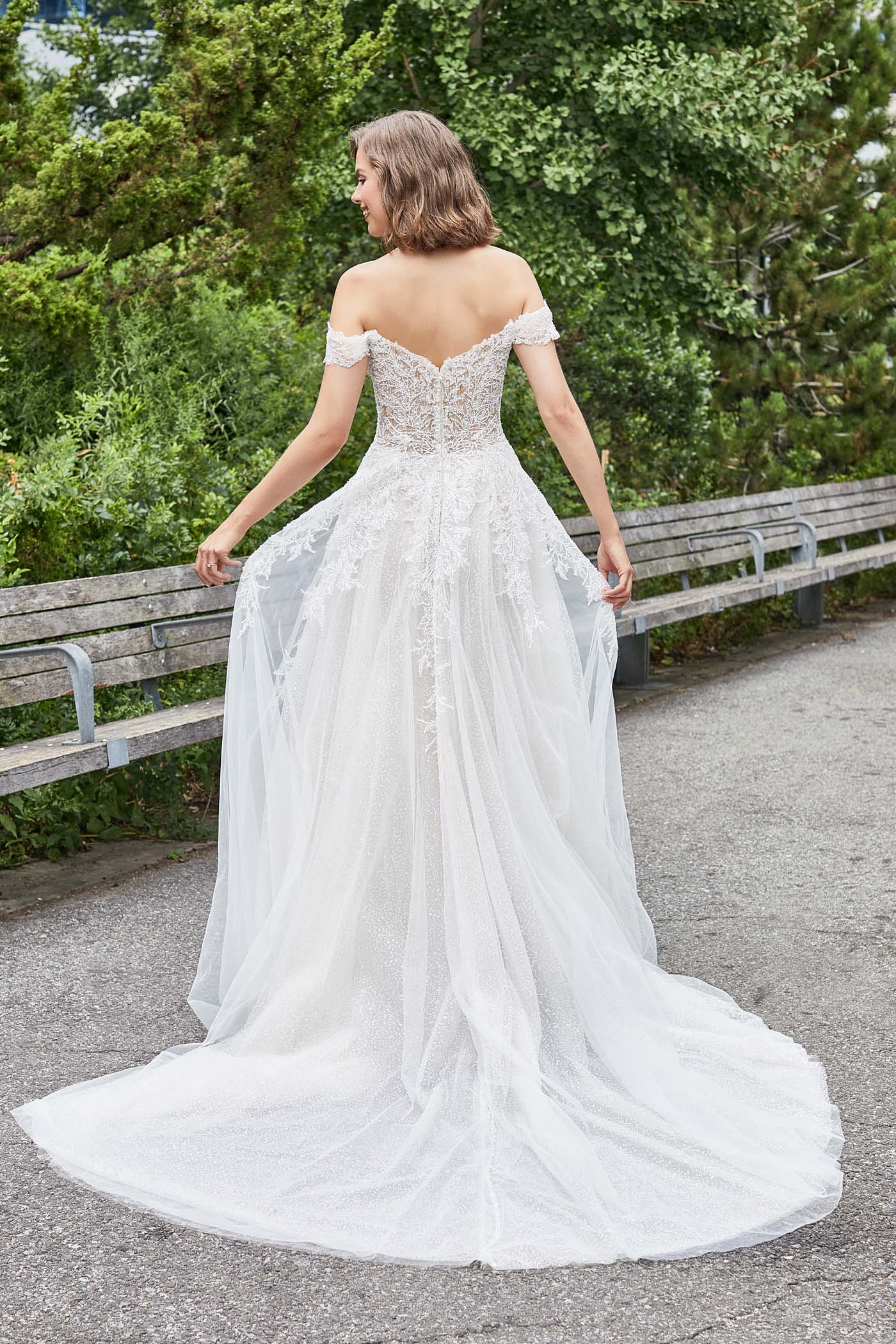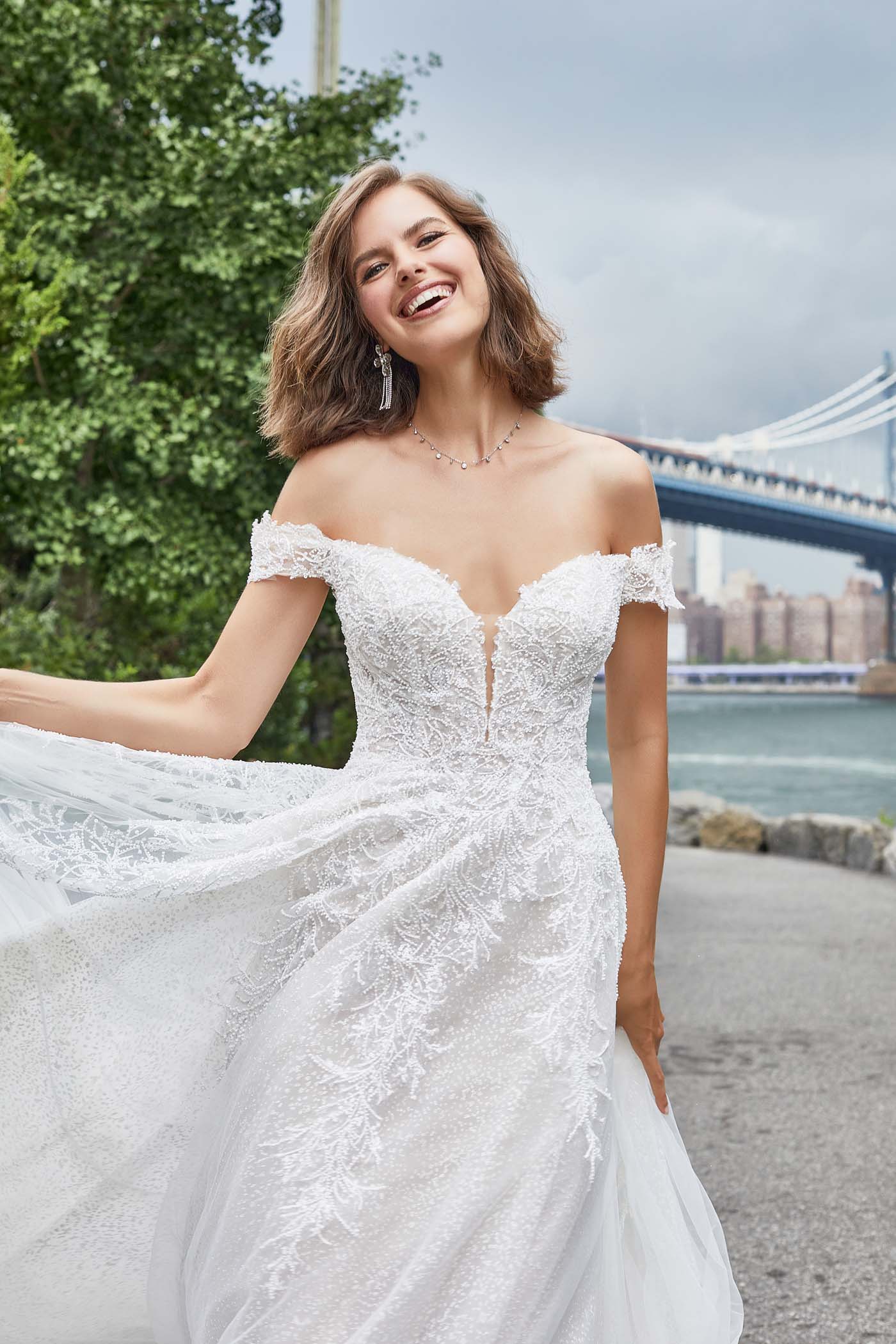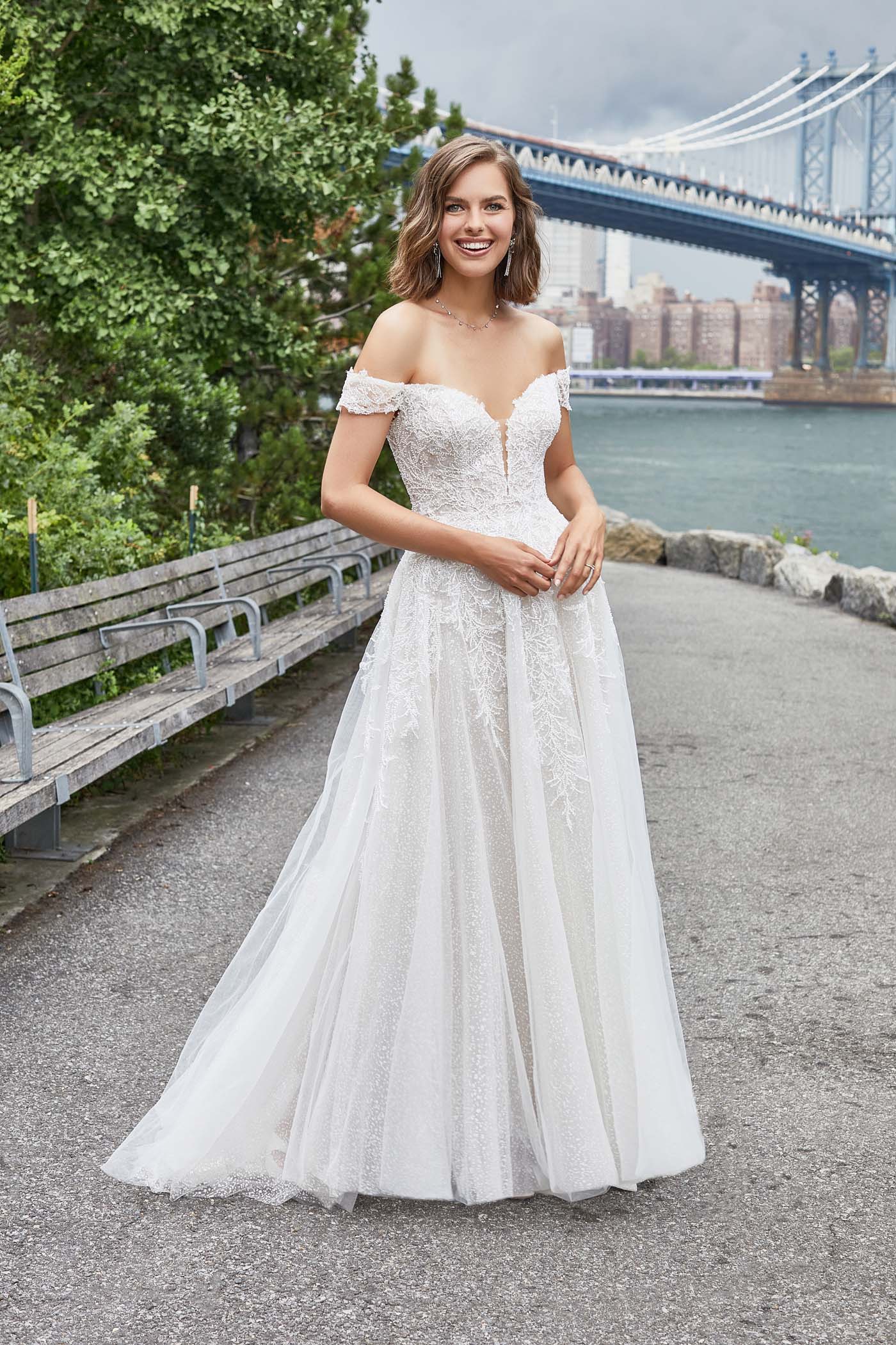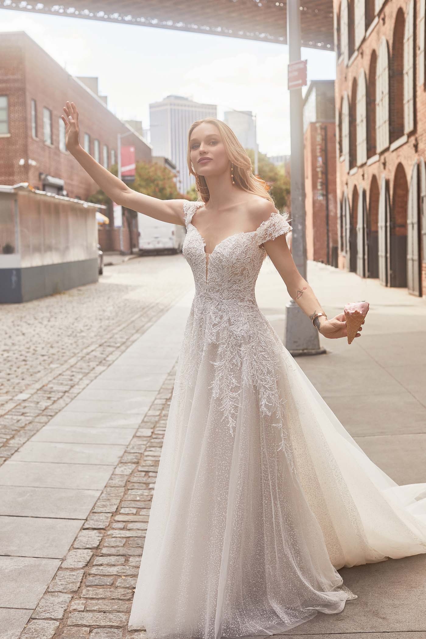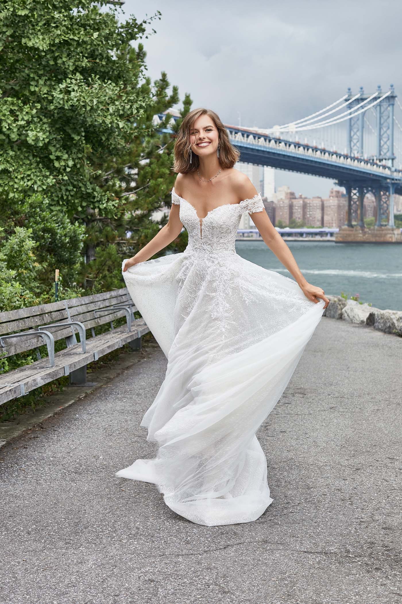 Abstractly sprinkled with glitter and tonal beaded appliques, the January gown sparkles like ice, from the off shoulder cap sleeves to the delicate A-line skirt.