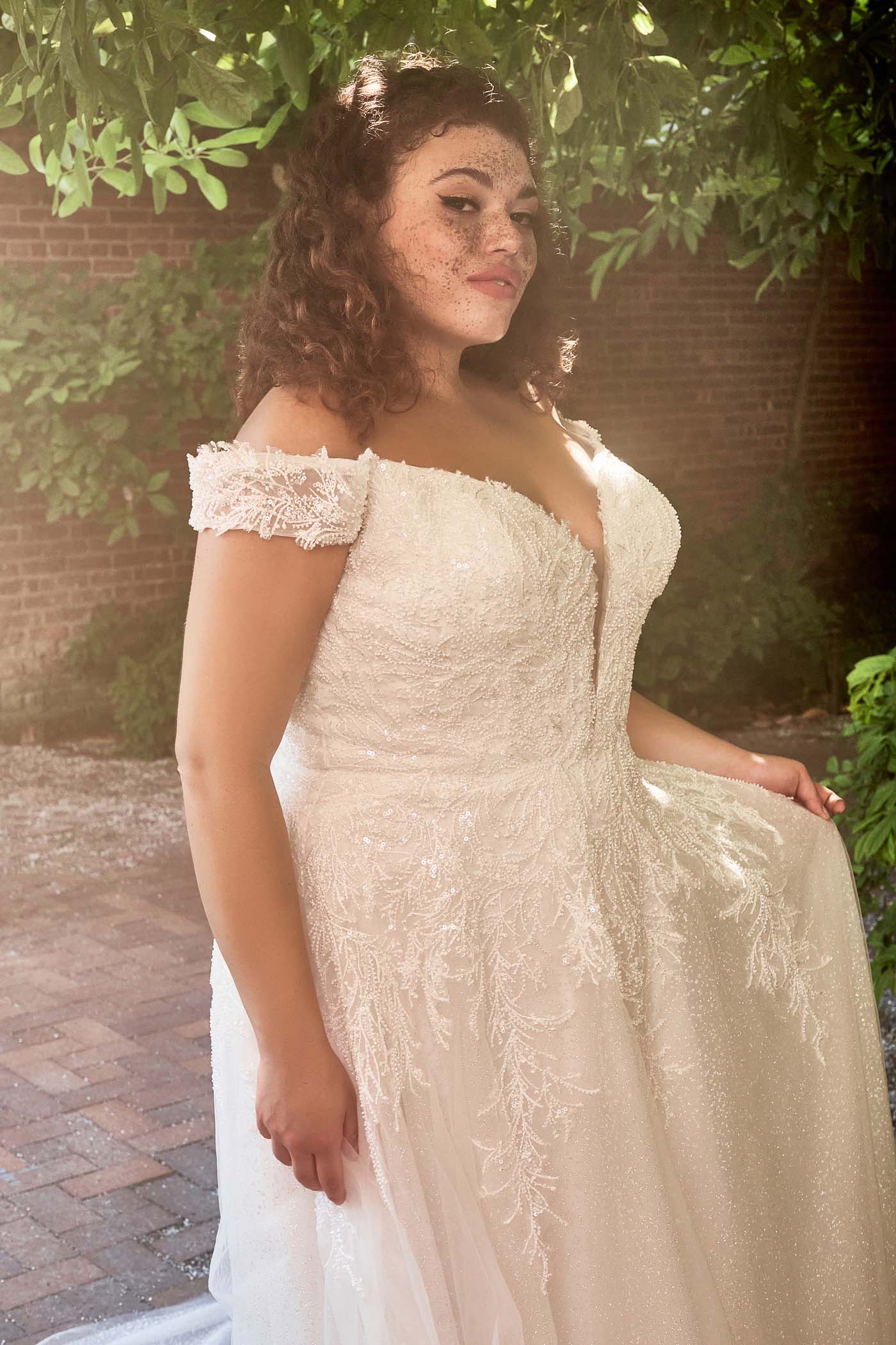 Abstractly sprinkled with glitter and tonal beaded appliques, the January gown sparkles like ice, from the off shoulder cap sleeves to the delicate A-line skirt.