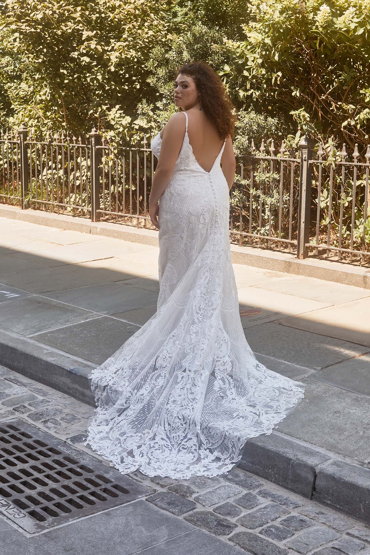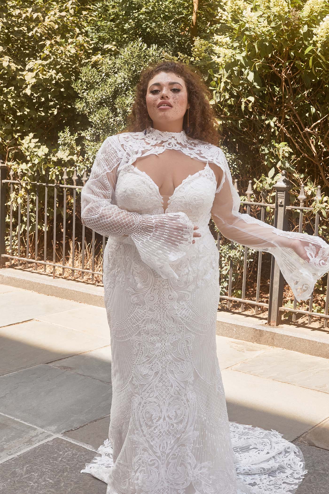 Jones is a beautifully sequined and embroidered appliqued gown, finished with a removable lace jacket.