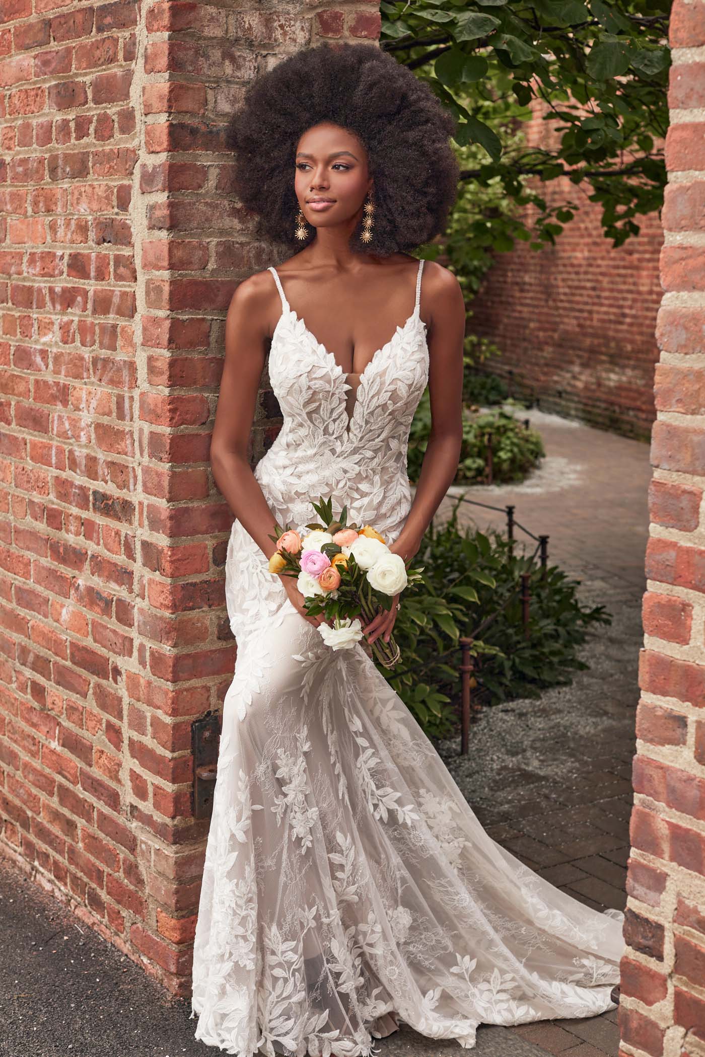 Rustling leaves and delicate branches arch across the bodice of our strappy Jordan sheath, leading to a Chantilly lace train.