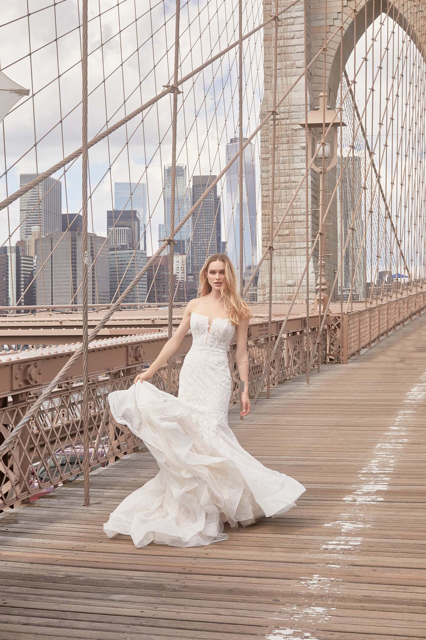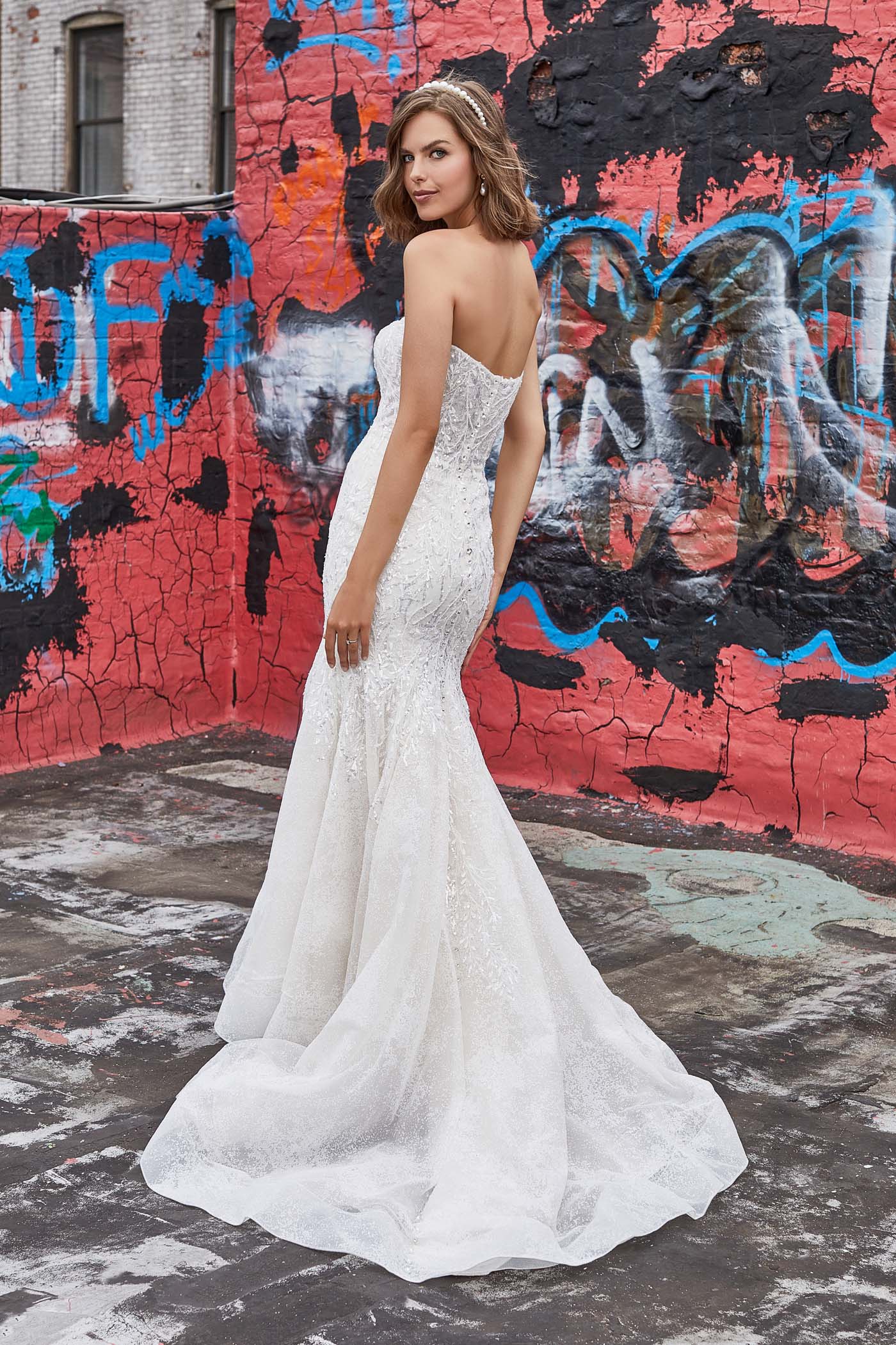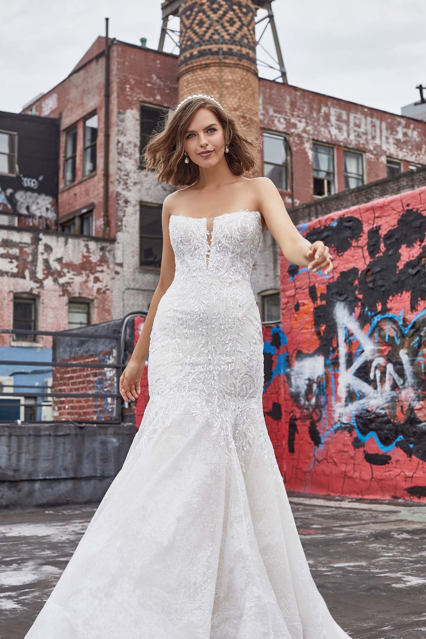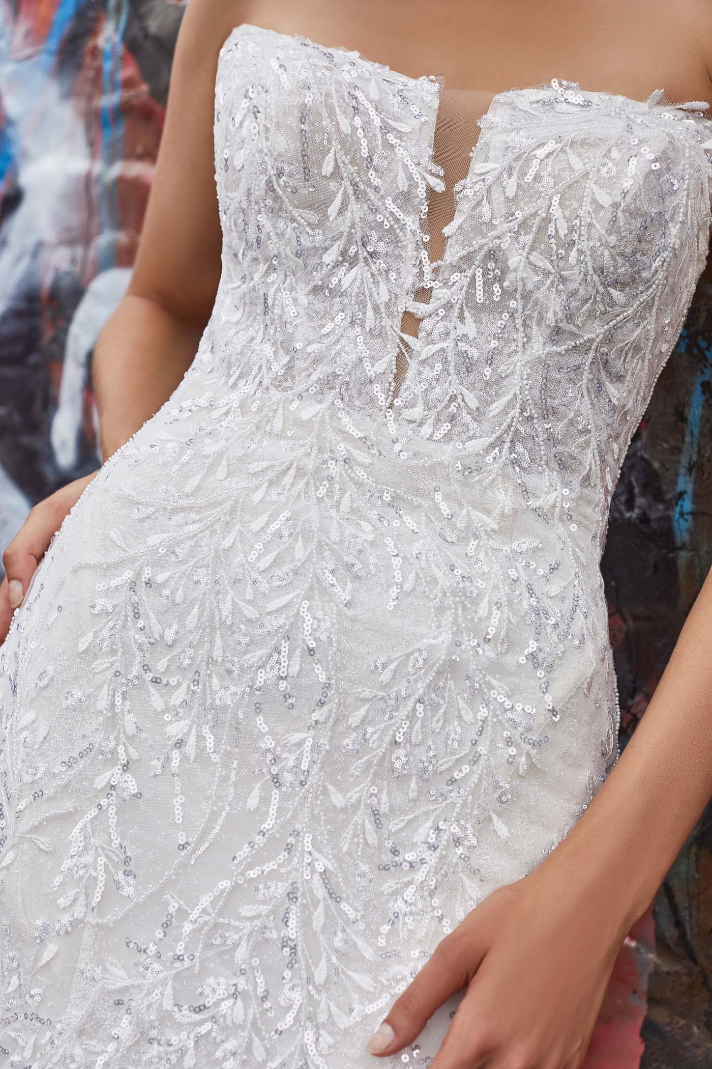 With beaded and sequined appliques, Jaycee floats on a cloud of stardust glitter tulle, finished with a notched strapless neckline.