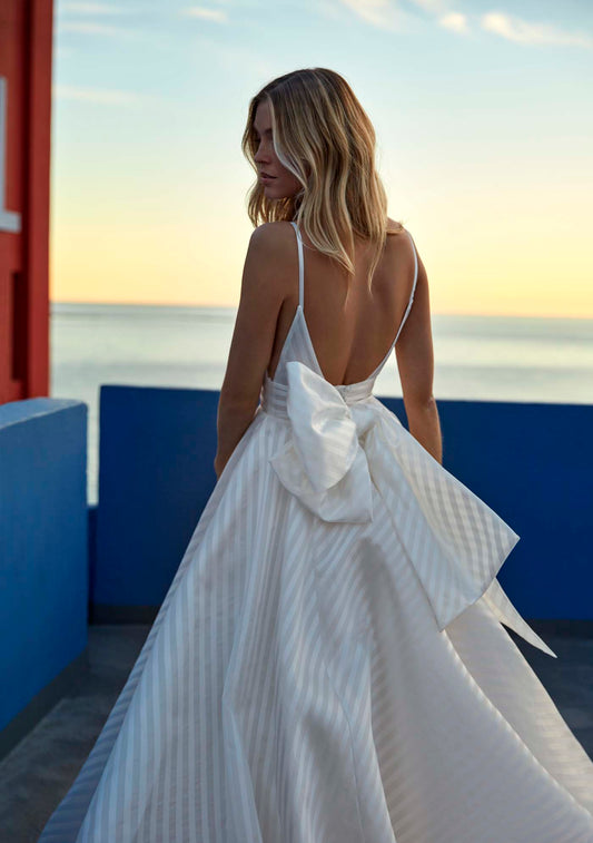 Softly striped satin composes the preppy-chic Gemma gown, a V-neck, spaghetti strap ballgown featuring a classic bow back.