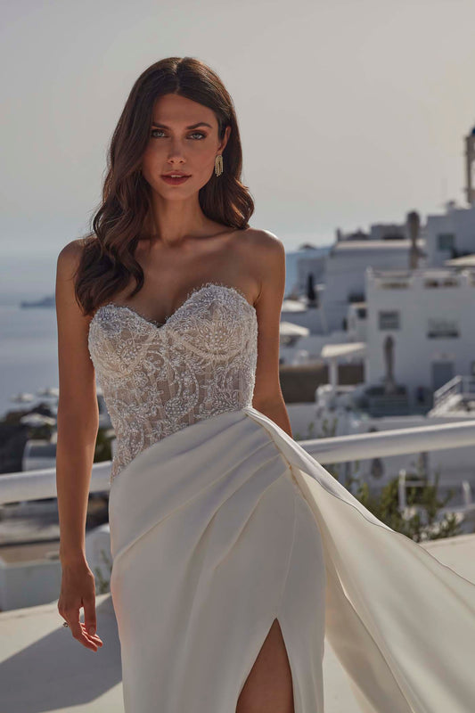 The Gigi gown is a figure-hugging crepe sheath gown, featuring a glittering pearl sweetheart bodice.