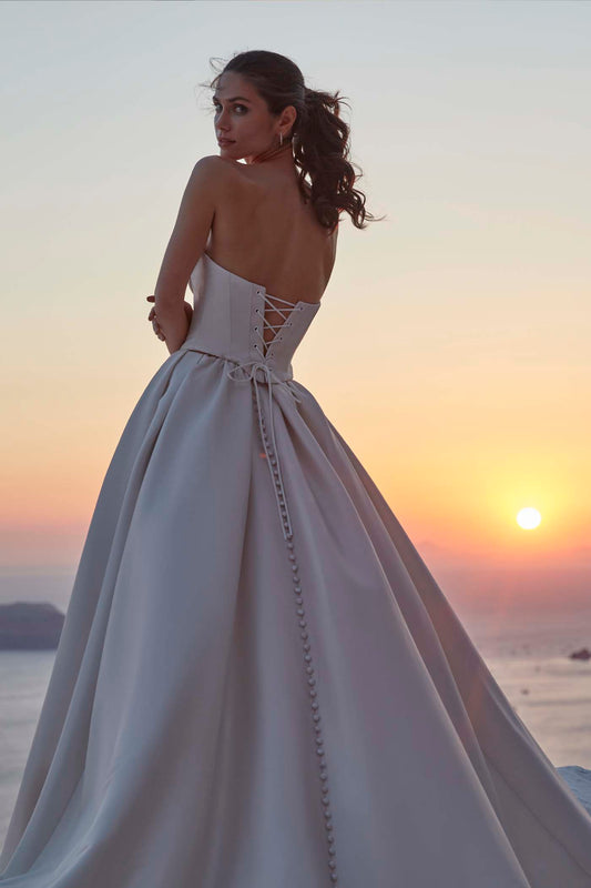 Crisp shantung, pleated at a basque waistline, lends structure and elegance to the strapless Fialma ballgown